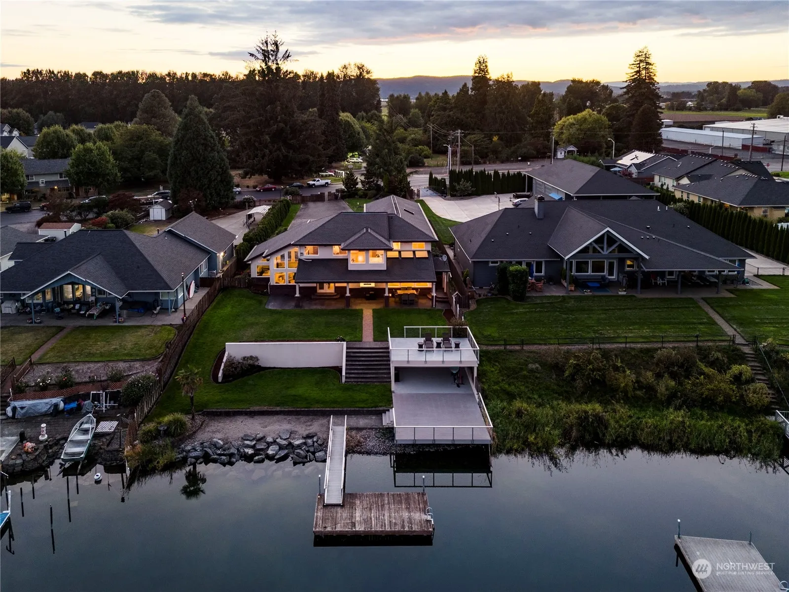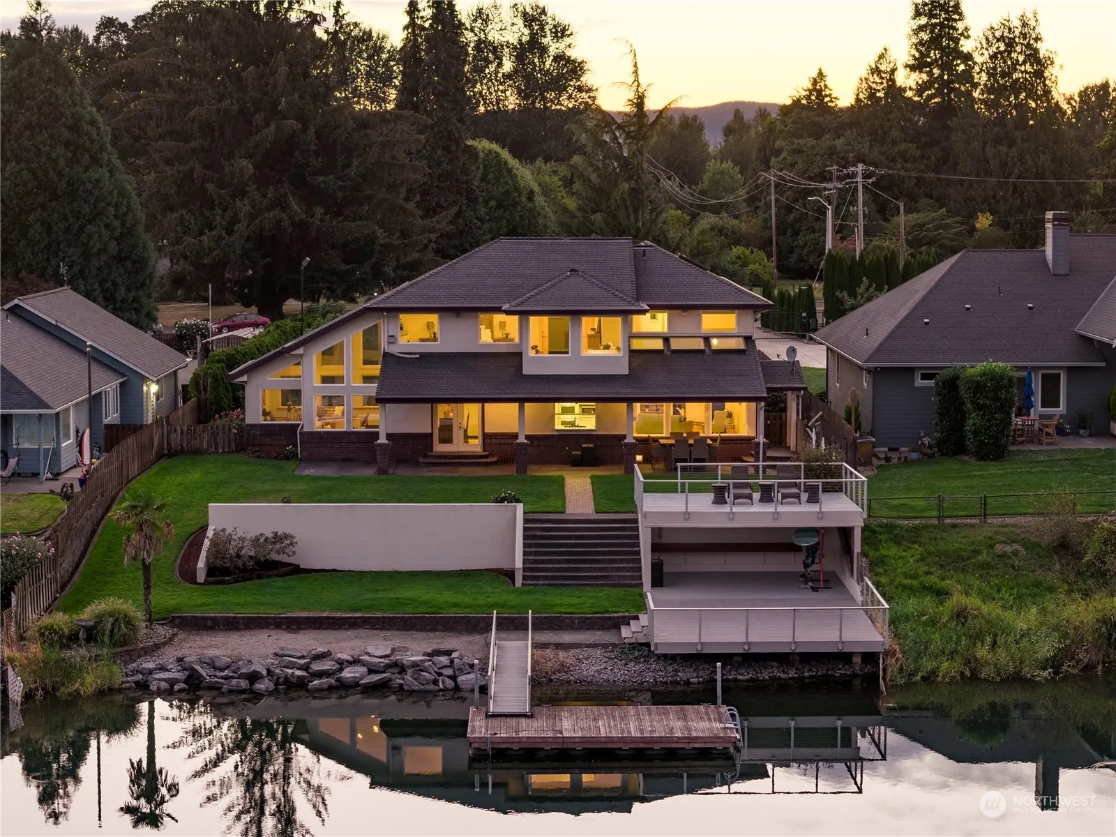 Waterfront Luxury at Horseshoe Lake! Discover an exceptional lakeside retreat in the Lilac Lane neighborhood—this stunning custom-built home is the first of its kind here. Enjoy sweeping lake views from nearly every room, soaring ceilings, and abundant natural light complemented by custom woodwork and elegant finishes. The main level offers dual living areas, a formal dining room, and a cozy nook by a double-sided gas fireplace. A versatile main-level bedroom/office with an adjacent full bath provides guest or multi-gen flexibility. The primary suite boasts panoramic lake views and a spa-like bath. Outside, enjoy two covered patios, two open decks, and a private dock, plus year-round enjoyment in a grandfathered-in lakeside location!