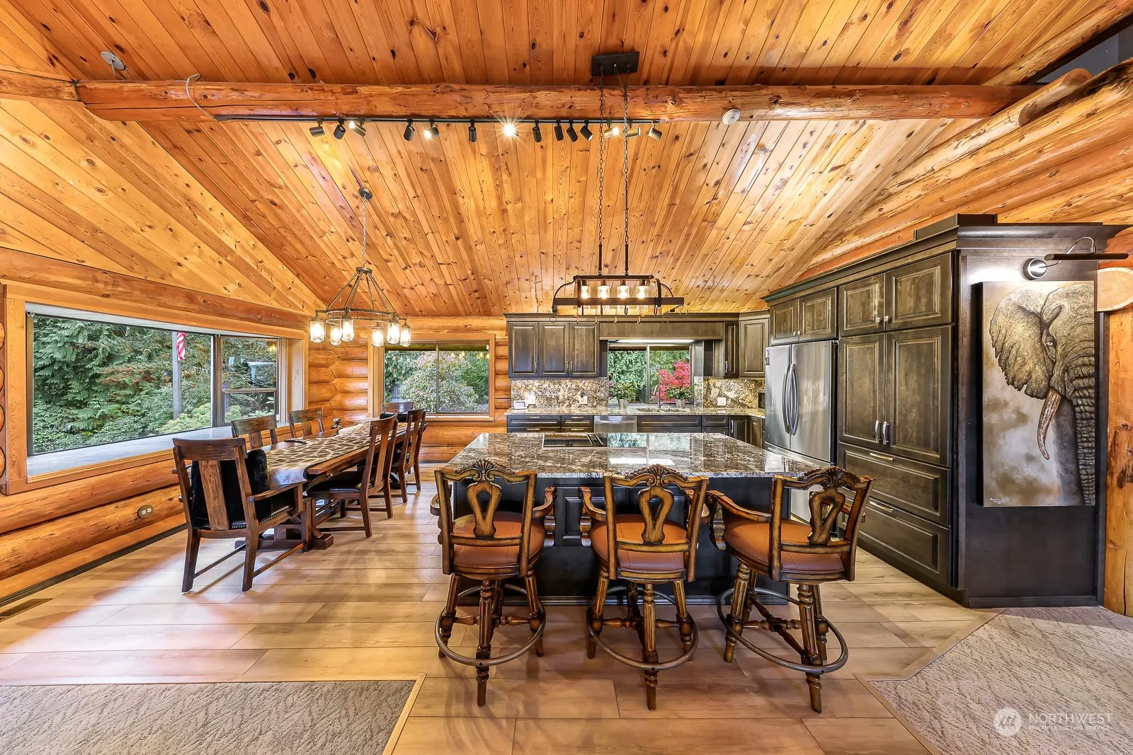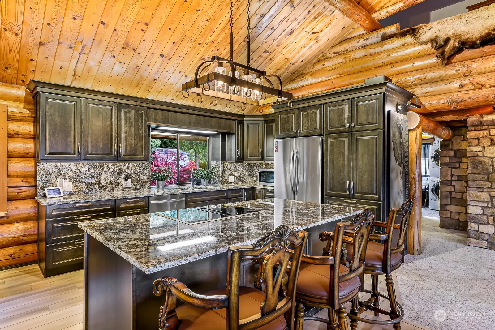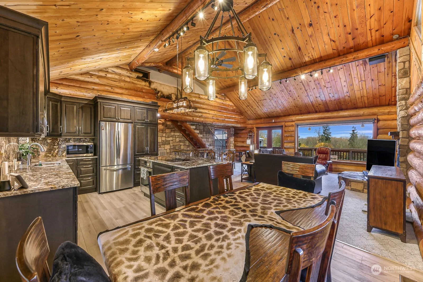 Magnificent rock and log home on over 5 acres with mountain views, gorgeous in-ground pool, and huge commercial outbuilding (50’X80′). Inside you’ll enjoy vaulted ceilings, stone fireplace, spacious kitchen with granite countertops, stainless steel appliances, and lots of beautiful cabinetry. Huge soaking tub in upper bathroom. 2nd Kitchen on lower level has full size refrigerator, dishwasher and stove/range. Huge shop building has 7 bay doors to house all your tools, equipment and toys of all sizes. Beautiful decks overlook the property, and fenced swimming pool area, plus provide gorgeous mountain views. Very close to walking trails, last home on the street is very private area. possible ADU in lower floor. Must see ! !