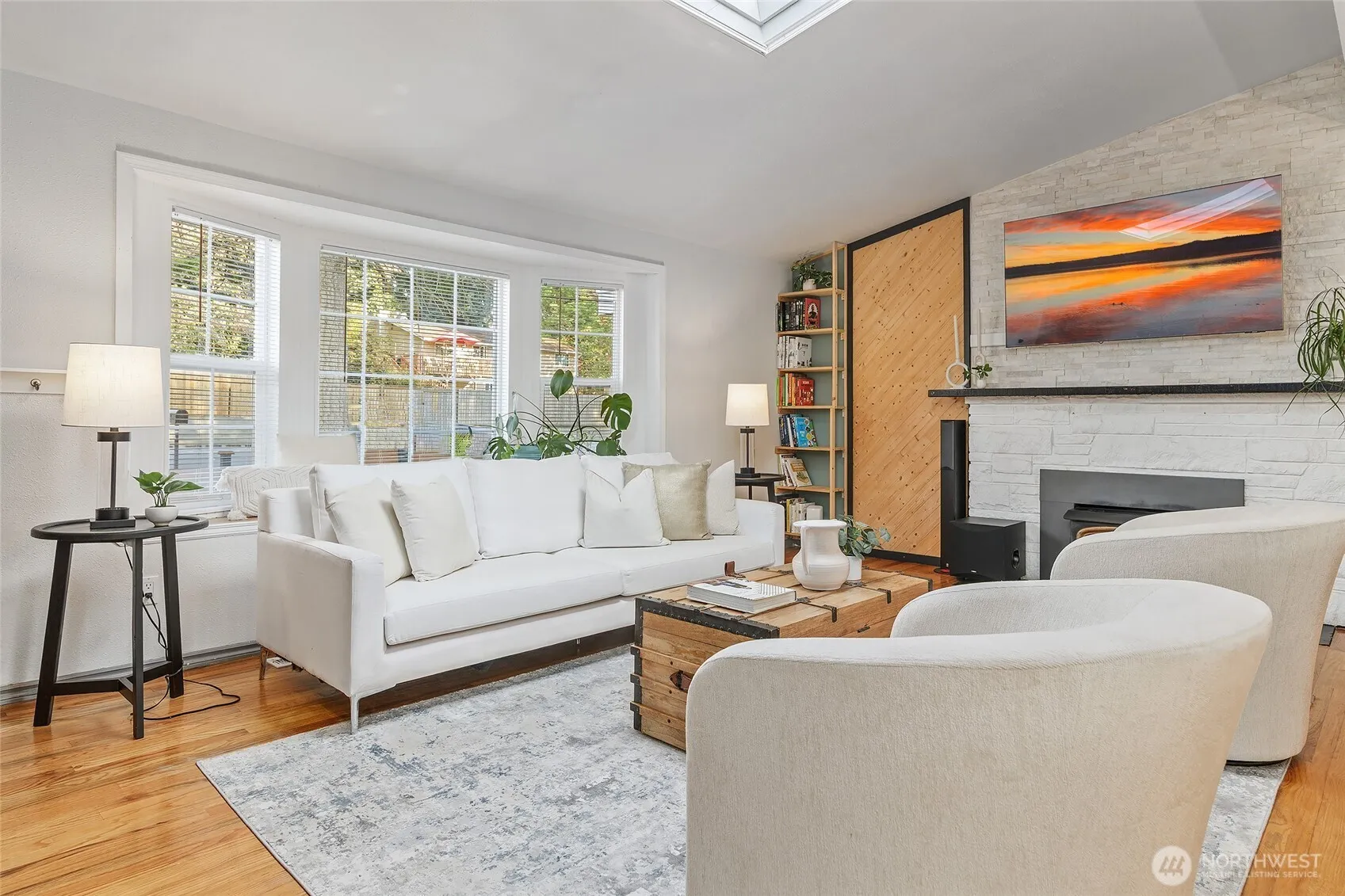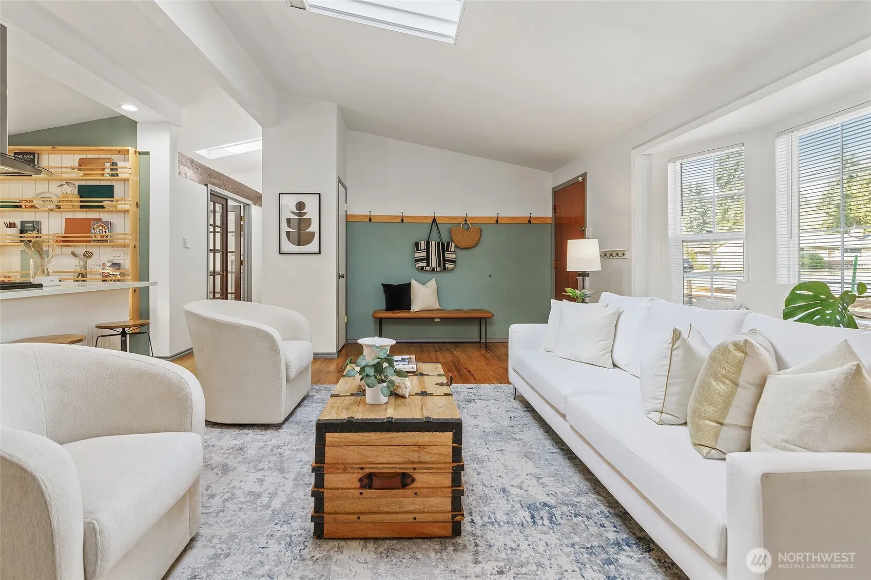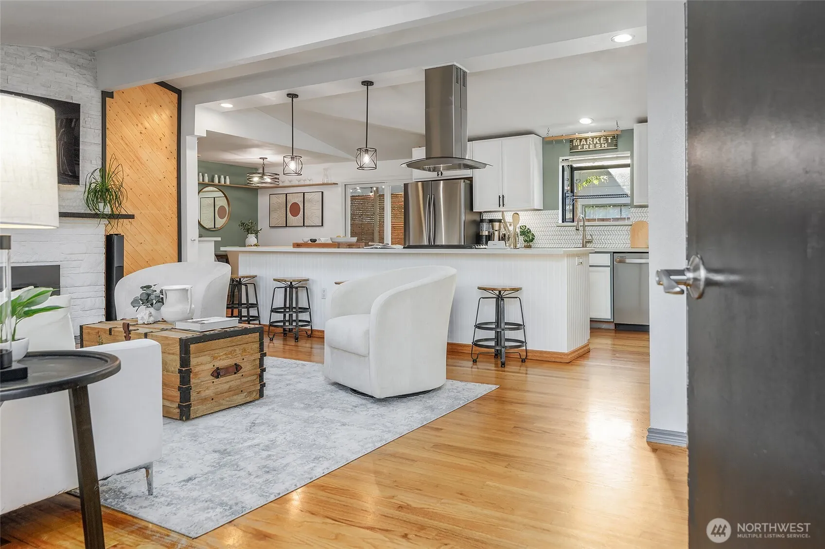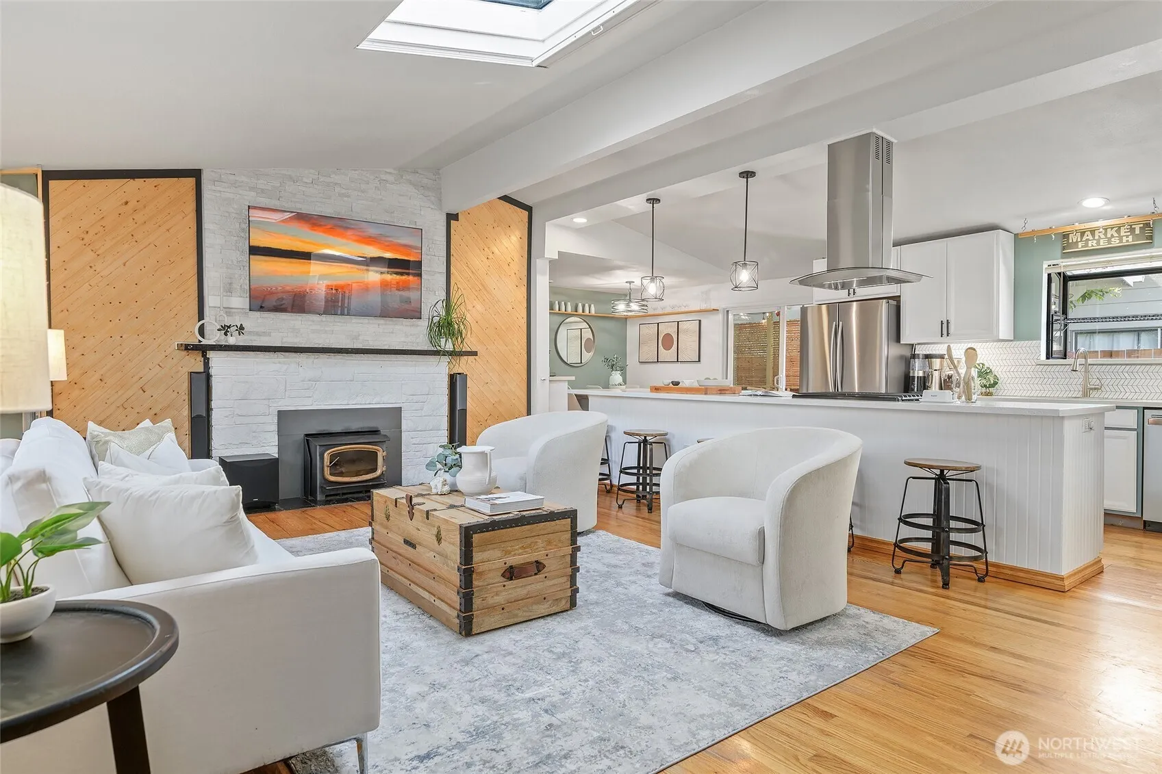 This modern, one-level Edmonds home offers style and convenience. Enjoy a spacious great room with vaulted ceilings and a cozy wood fireplace, flowing into a renovated chef’s kitchen featuring a quartz island, gas cooking, custom cabinets, herringbone backsplash, and stainless-steel appliances. The floor plan includes a primary bedroom with a large closet, an updated hall bath with double quartz vanity, and a flexible bonus room/home office. Step out to the covered deck for year-round entertainment. The private, fenced corner lot features a garden space, lawn, patio & storage shed. Includes laundry room with ¾ bath, large one-car garage with storage, off-street parking, and a brand-new roof for peace of mind.