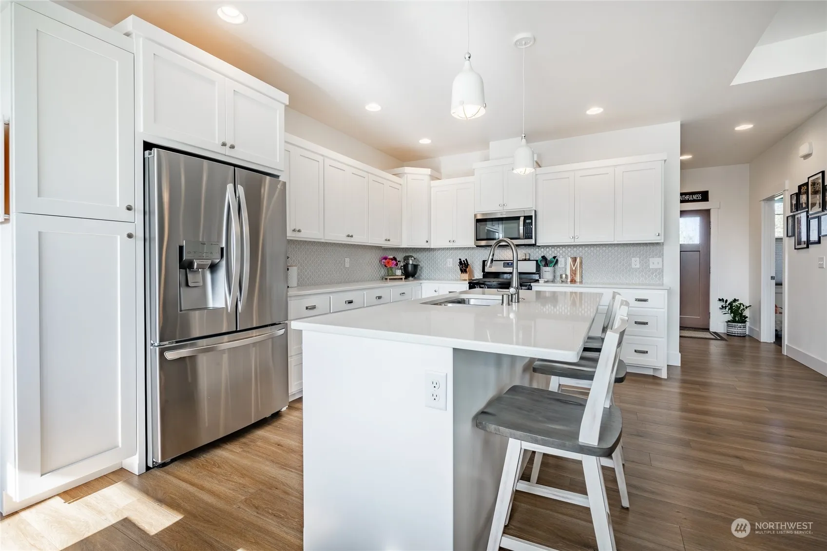 Welcome to this beautifully crafted, Pacific Edge-built 4 bed, 2.5 bath home in sought-after Lynden! This 1,959 sq ft home perfectly blends style and comfort, featuring on-trend finishes like quartz countertops, stainless steel appliances, custom tile work, and AC. Step into an open, airy layout with tall ceilings in the gathering room and a cozy gas fireplace, offering the perfect spot to unwind. The main floor primary suite provides a private retreat, while the upstairs family room offers extra space for work or play. Outside, enjoy a fully fenced backyard with a covered patio and mature landscaping—ideal for year-round entertaining. With its clean lines, custom touches, and thoughtful design, this home is ready for you!
