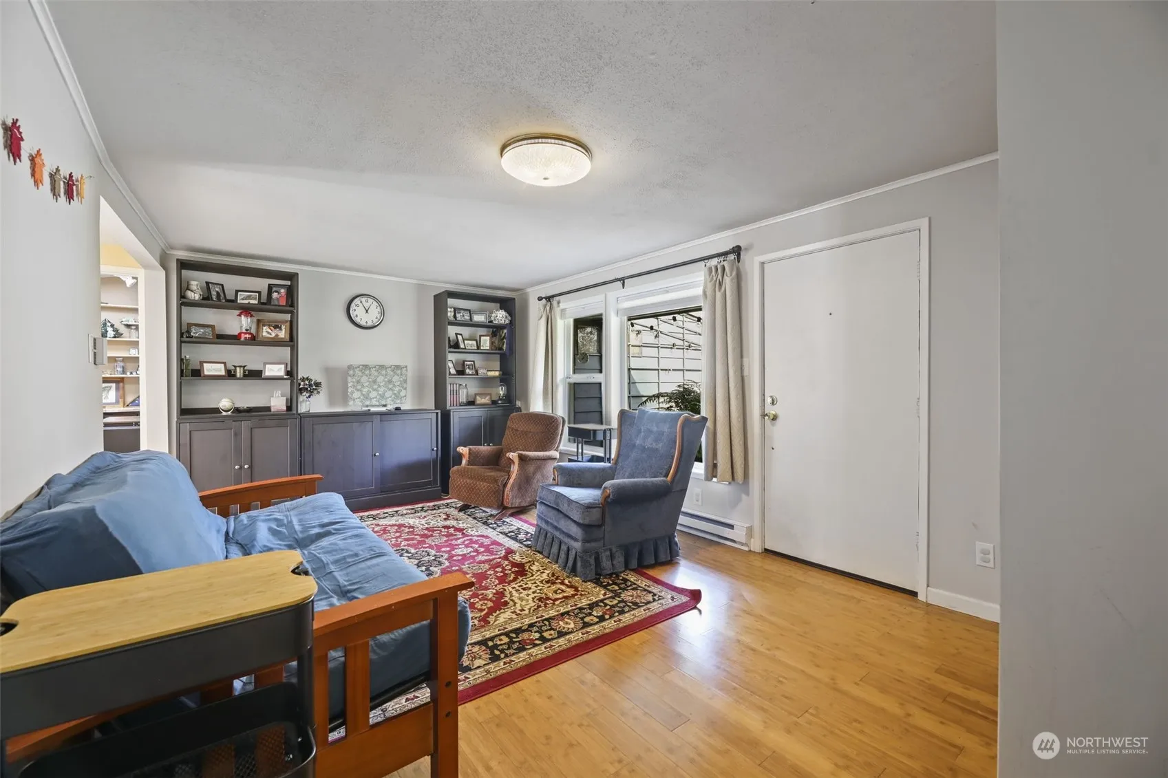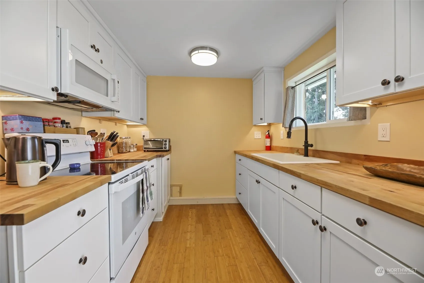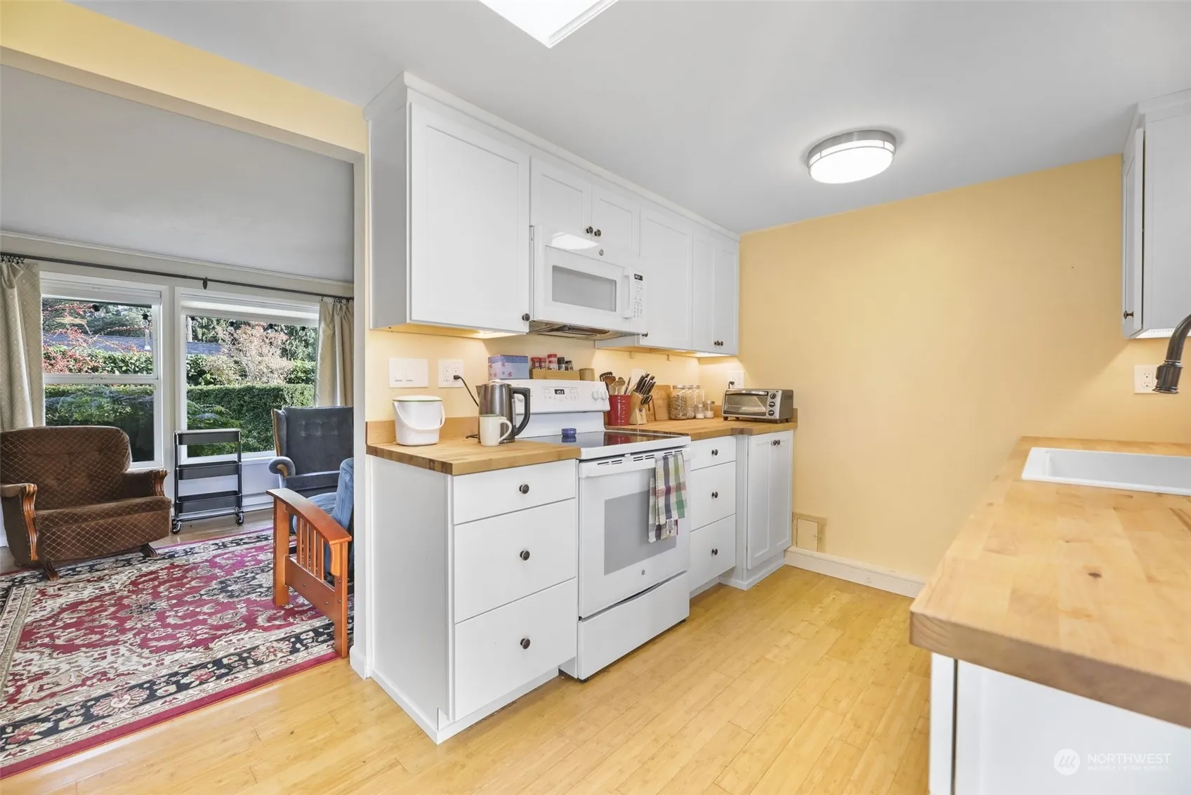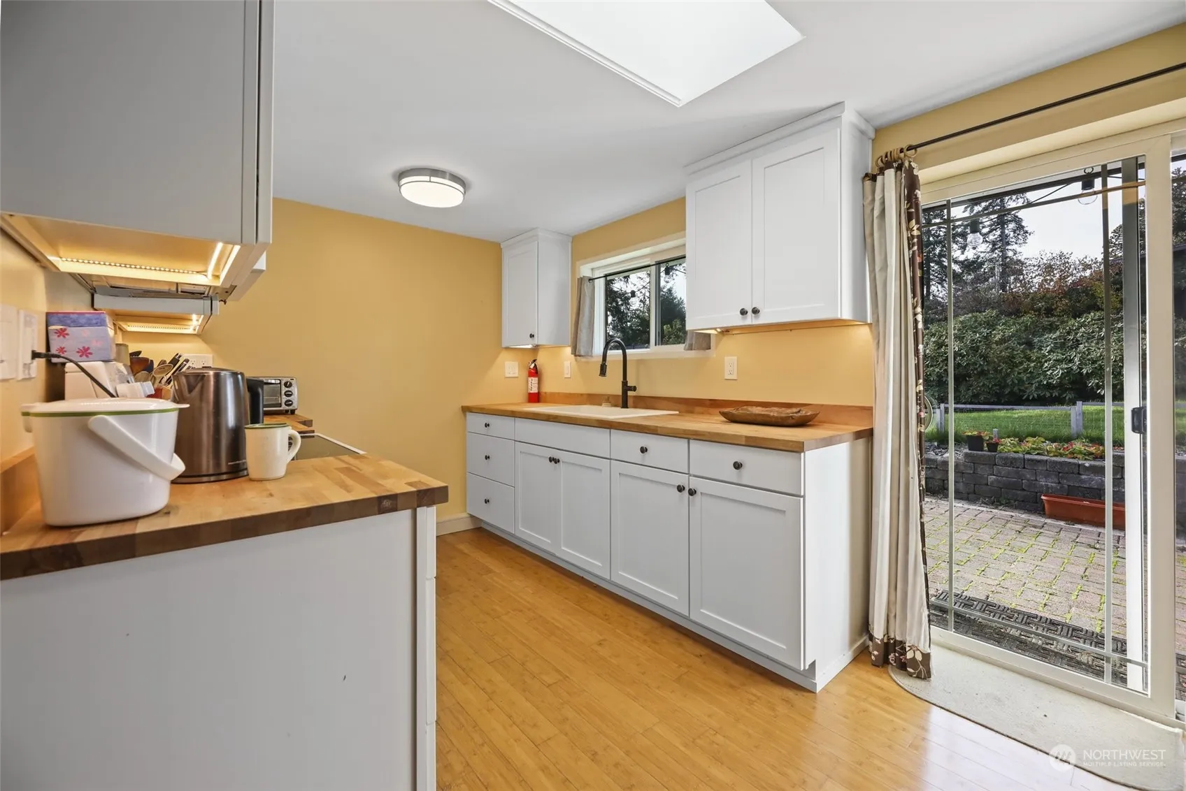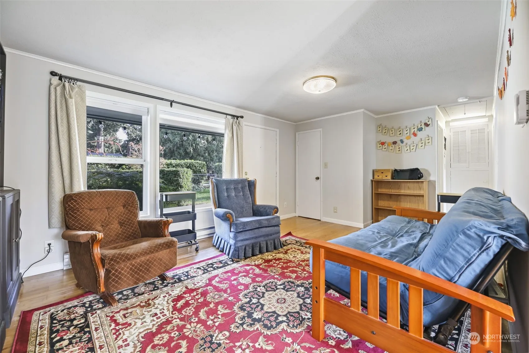 Welcome home to low-maintenance one story living! 2 bedrooms + a large bonus room w/vaulted ceiling – a home office, craft room, or separate guest space? MOVE-IN READY with excellent updates! New kitchen cabinets, counters, and window. Newer roof, interior, and exterior paint. New custom-built modern pipe shelving, cabinets, and new flooring in the home office. All appliances stay! Sliding doors off the kitchen open to a large fenced backyard with easy-to-care-for mature privacy landscaping, beautiful lilac bushes, producing apple tree, herbs, and a variety of berries. Attached 1 car garage with storage space, work bench, and shop/hobby area. Walking distance to Mountlake Terrace Transit Center, restaurants, shopping, groceries, and parks!