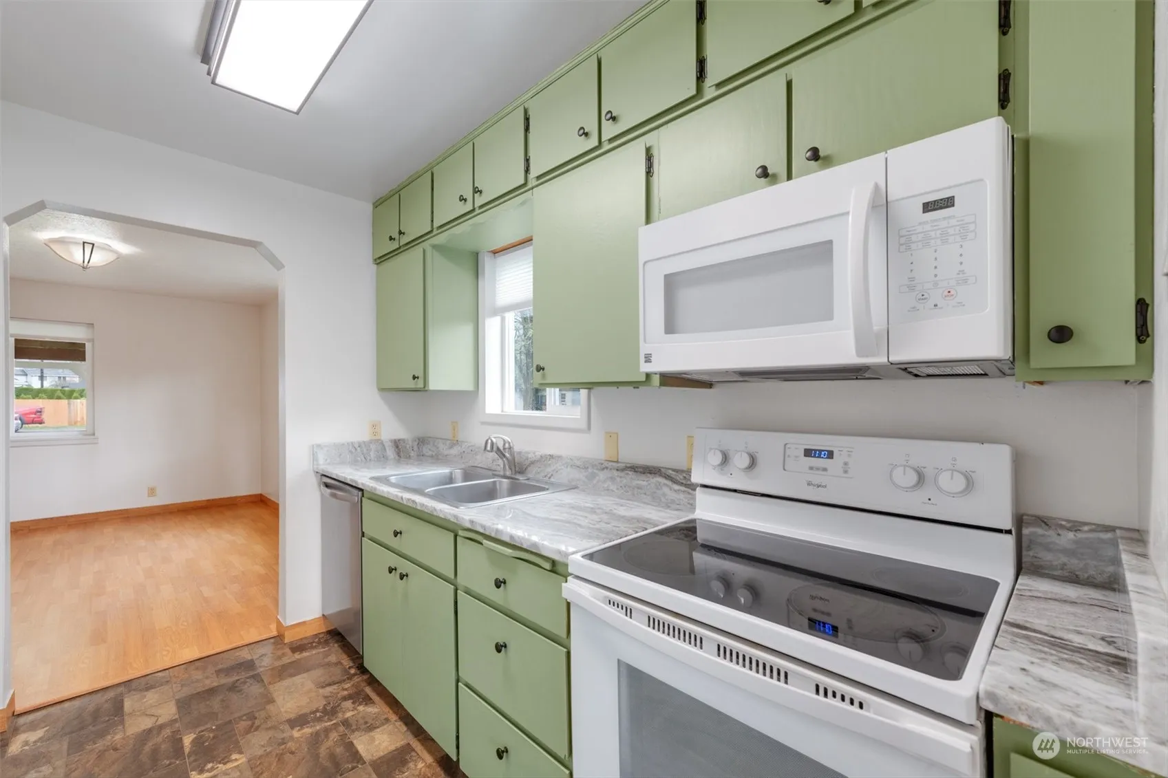 Well-Kept Bungalow w/ modern upgrades! Beautiful 2-bed, 2-bath, on spacious corner lot. Updated vinyl plank flooring enhances portions of the main level. Kitchen has gorgeous and functional granite counters. Primary bedroom is conveniently located on the main floor, along with the laundry room, adding to the home’s functionality. Vinyl windows throughout allow abundant natural light. The backyard features a concrete patio with a covered awning, perfect for year-round enjoyment, and is fully fenced—ideal for gardening, play, or pets! This home combines vintage charm with modern updates. Come see it today!