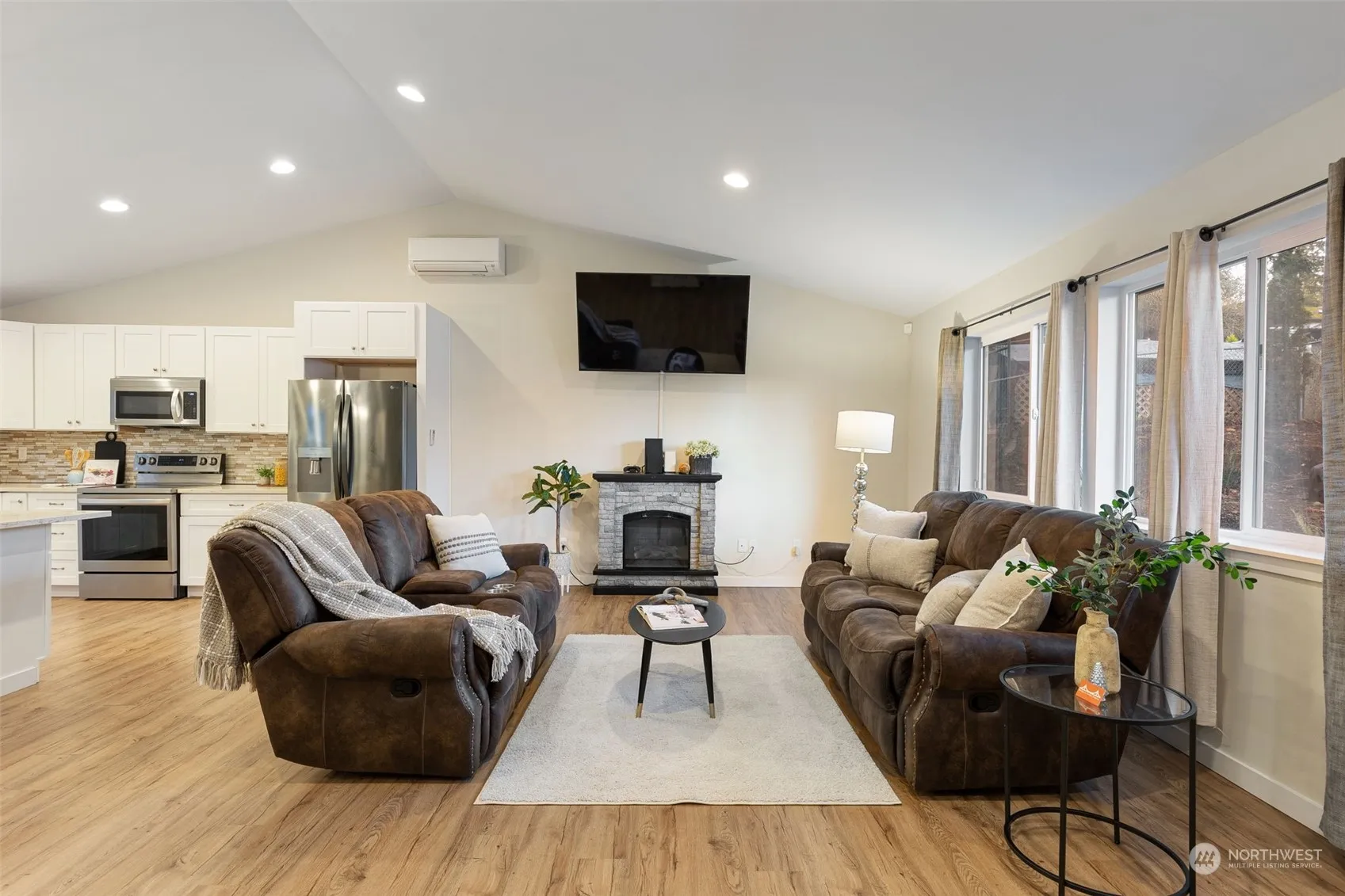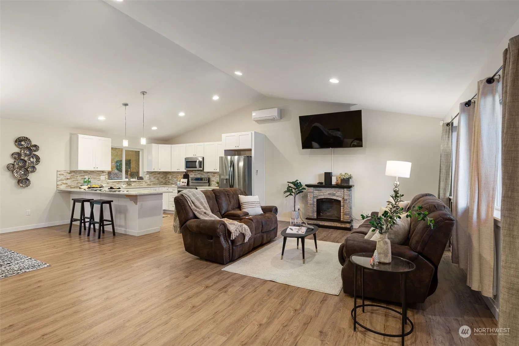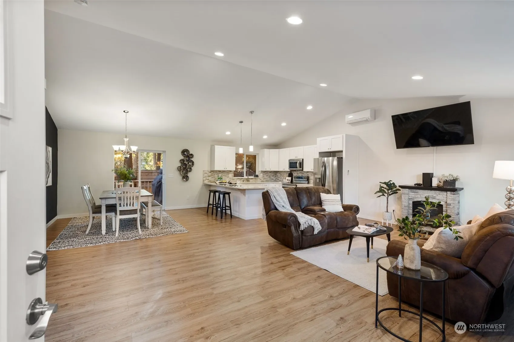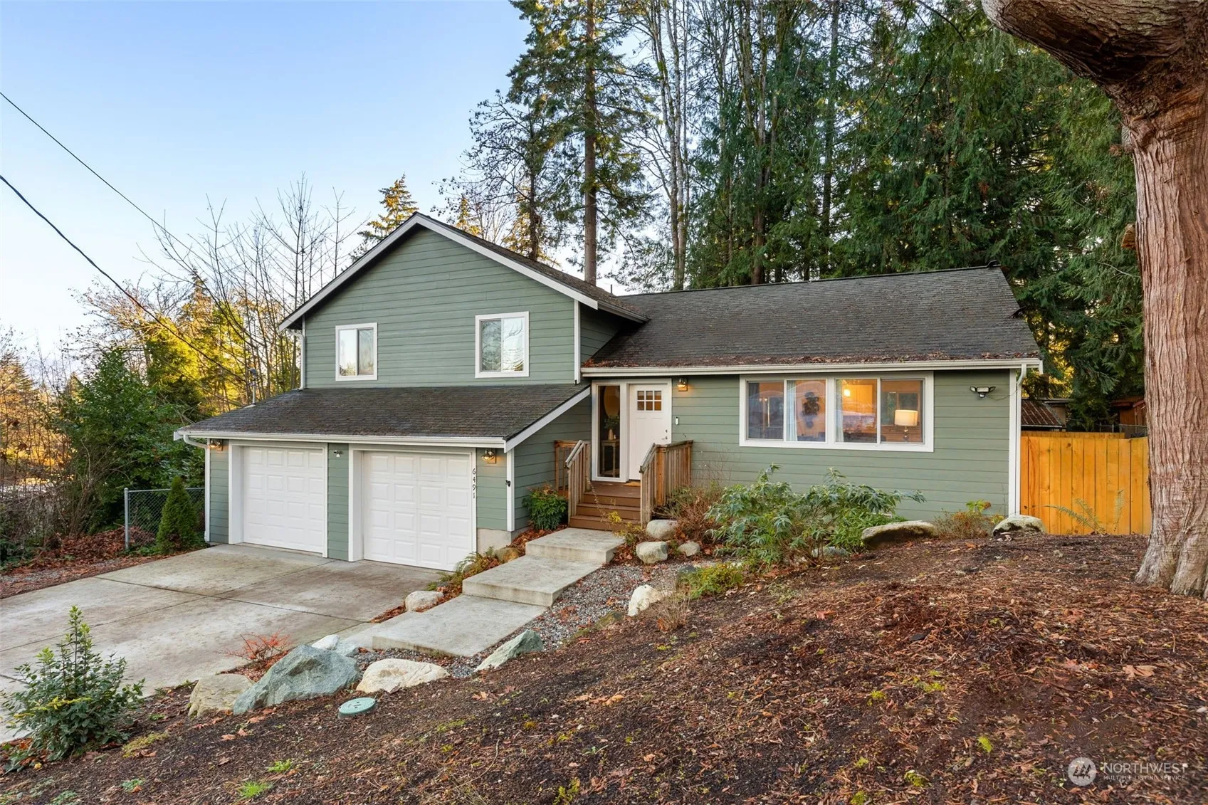 This stunning home built in 2021 offers 3 bedrooms, 2.5 bathrooms across 1,876 sqft of open concept living space. Vaulted ceilings in the great room create a spacious feel, enhanced by stylish lighting, and white millwork. The kitchen features solid quartz countertops, tile backsplash, breakfast bar, and stainless-steel appliances. The dining room opens to a rear deck, perfect for outdoor entertainment. The upper level boasts a primary suite with a private bath, and additional bedrooms, while the lower level offers a spacious family room with access to the fully fenced backyard. Enjoy the energy-efficient ductless heat pump, cement board siding, and an attached 2 car garage. Quick access to Seattle ferry, Naval Bases, schools, and beaches.