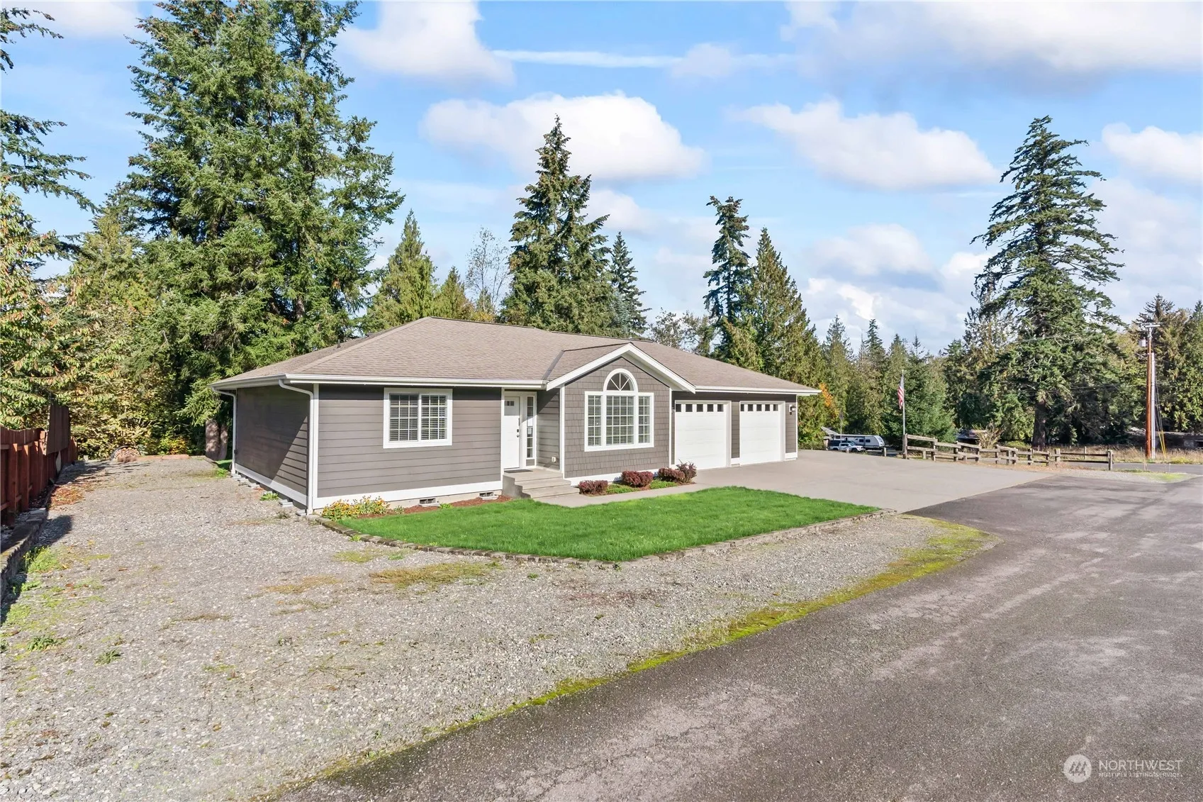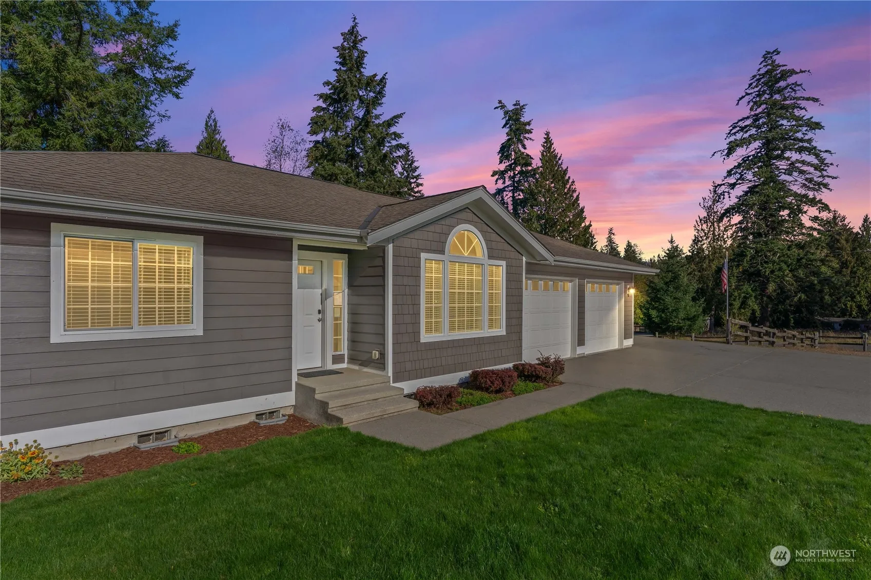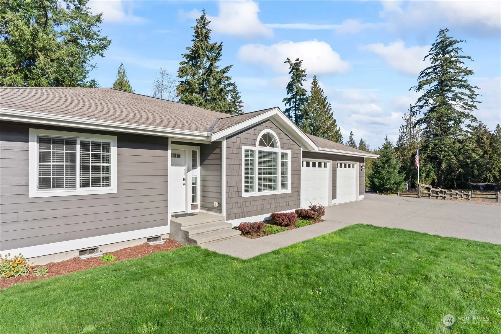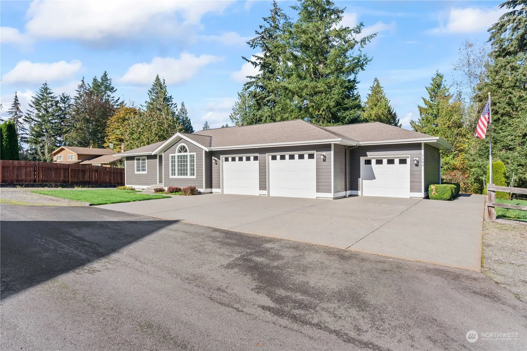This exceptional corner lot, spanning nearly an acre of immaculate landscaping, showcases a completely move-in-ready rambler with a spacious and thoughtfully designed floor plan. The home is filled with abundant natural light and features a meticulously maintained interior, new carpet and an open-concept kitchen and dining area perfect for entertaining. The park-like backyard provides a perfect retreat, ideal for summer evening campfires, and offers ample parking for guests, including convenient RV parking. The oversized, three-car garage comes equipped with built-in storage and interior access through the mud room. Conveniently located just minutes from shopping, schools, and recreational areas, the home is surrounded by stunning views.