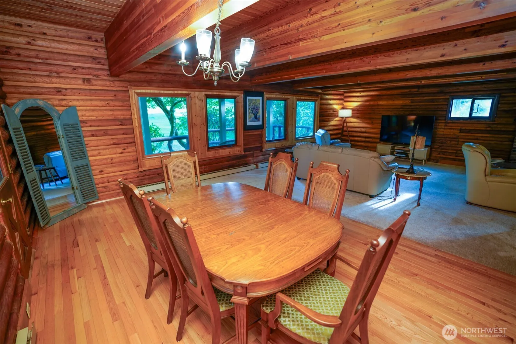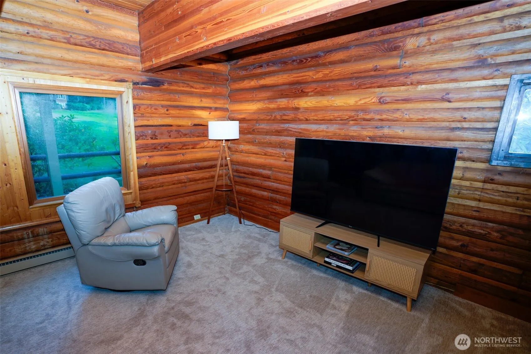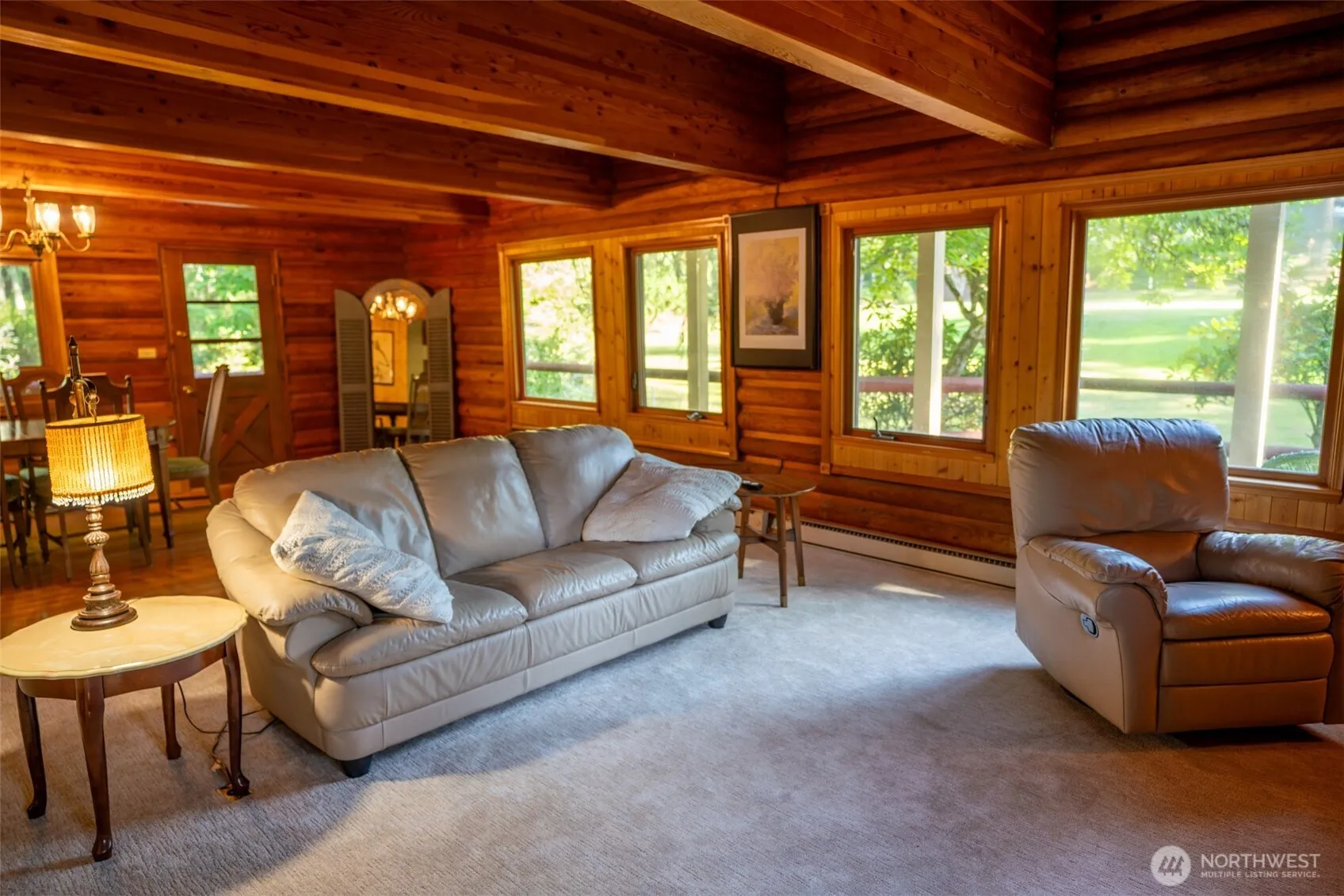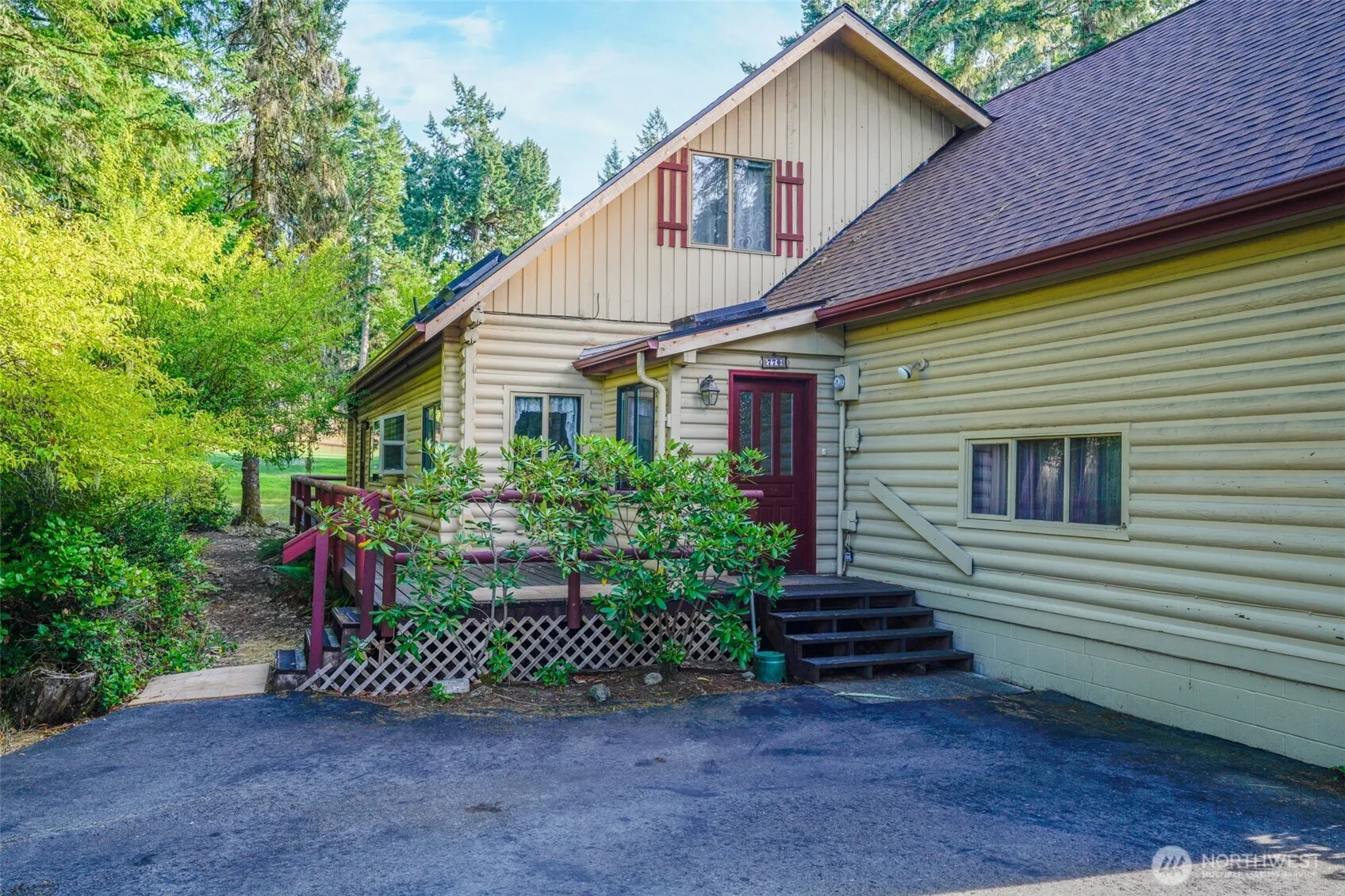Golf course-front charming 2684 sq ft log cabin in the most prominent golf community above the Hood canal. All immersive green views from the great living room of the house centered around a wood fireplace. Everything about it, including the scent of wooden logs, evokes sense of a mountain retreat. Two living areas with a separate entrance, kitchenette, and full bathroom can easily accommodate multigenerational living or use as a STR. The house has been lovingly cared for by the owners. New septic tank in 2022, new carpeting, and new roof 2024 are the most recent of continuous upgrading of the original authentic house. Clubhouse with breathtaking views of the Olympics and a delightful hike down the trails to fabled Alderbrook resort.