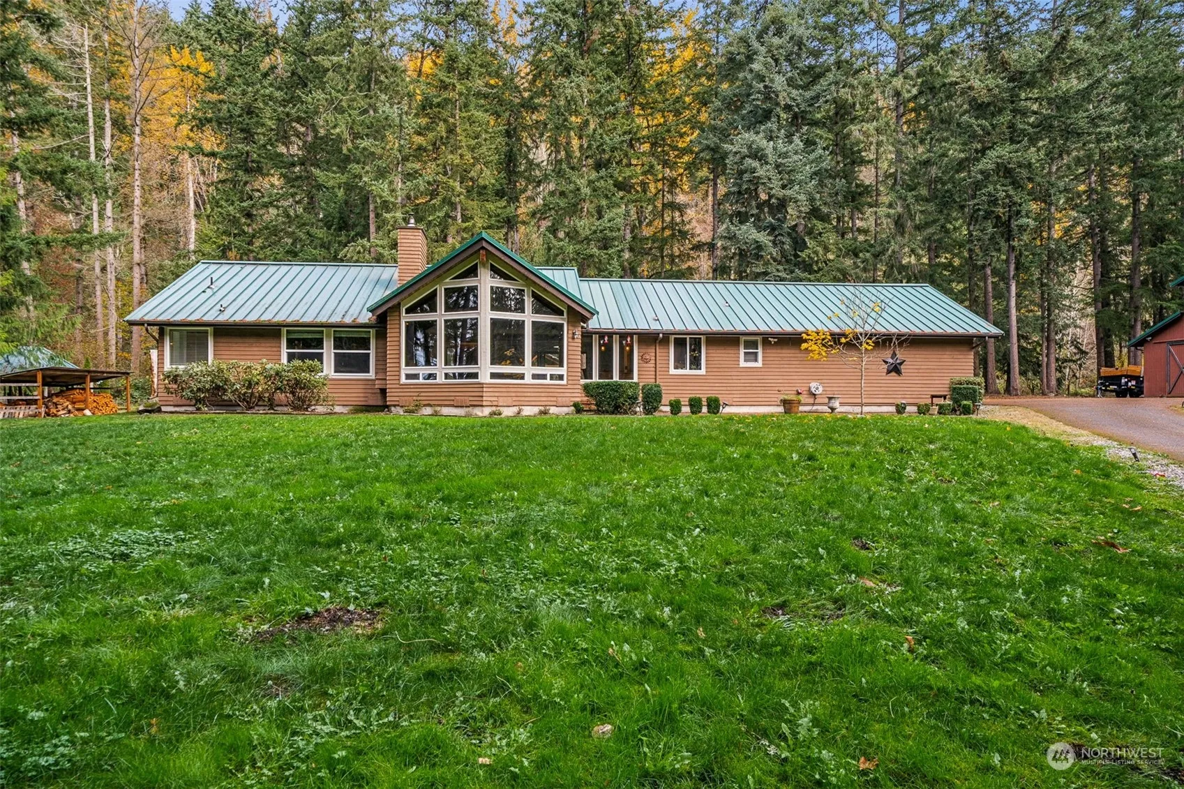 Indulge in a staycation with this resort-style property. Enjoy this 4-bedroom, 3-bathroom open concept one story home nestled on 3 acres of magnificent land, featuring a 3-stall barn with a workshop area, an office/tack room, and three finished rooms above the barn, complete with a kitchenette and bathroom. The estate also boasts a picturesque pond, an outdoor gazebo with firepit and a covered patio ideal for outdoor living/kitchen. The home offers a recently updated kitchen, a vaulted living room with cedar and beamed ceilings, a pellet stove, cedar siding, and a metal roof. The primary bedroom suite includes a fireplace, walk-in closet, and jetted tub. Enjoy the privacy of a gated entrance and a paved driveway.