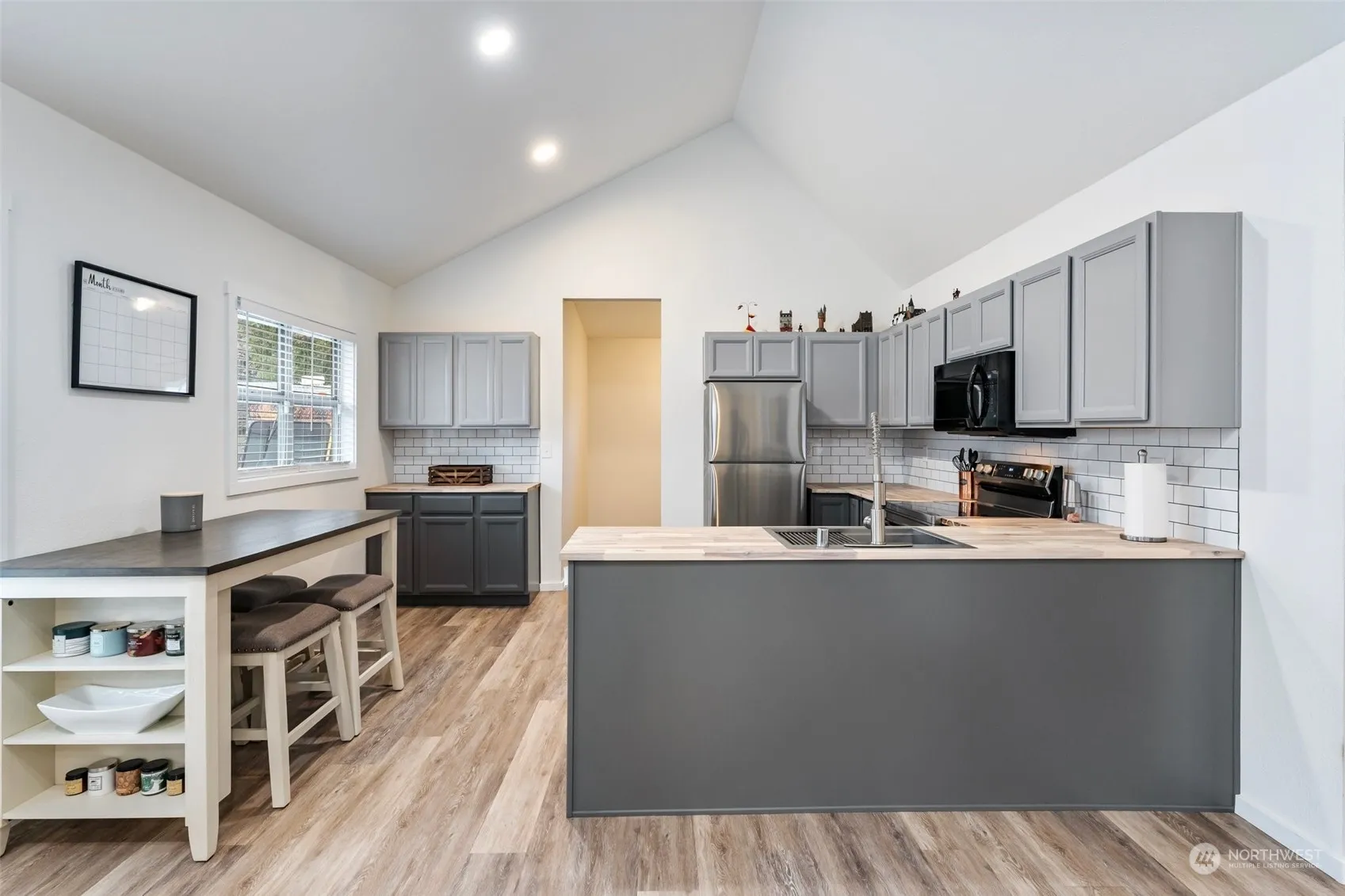 Welcome to this beautiful, recently renovated home that feels fresh and brand new. You’ll be impressed by the exceptional craftsmanship and high-quality finishes throughout. The vaulted roof adds a spacious touch, and the kitchen boasts stylish new cabinets, stunning cutting board countertops, and a custom steel sink. Enjoy a convenient coffee bar just off the kitchen – a perfect morning retreat! The steel garage offers great space for projects & storage. A private, fenced backyard awaits, ideal for relaxation and outdoor enjoyment. Security system included for added peace of mind & all appliances are included for an easy move-in!