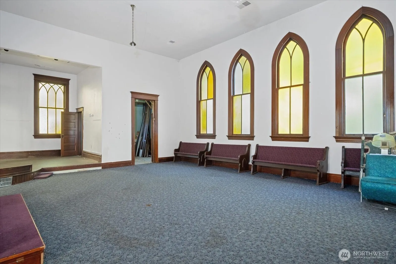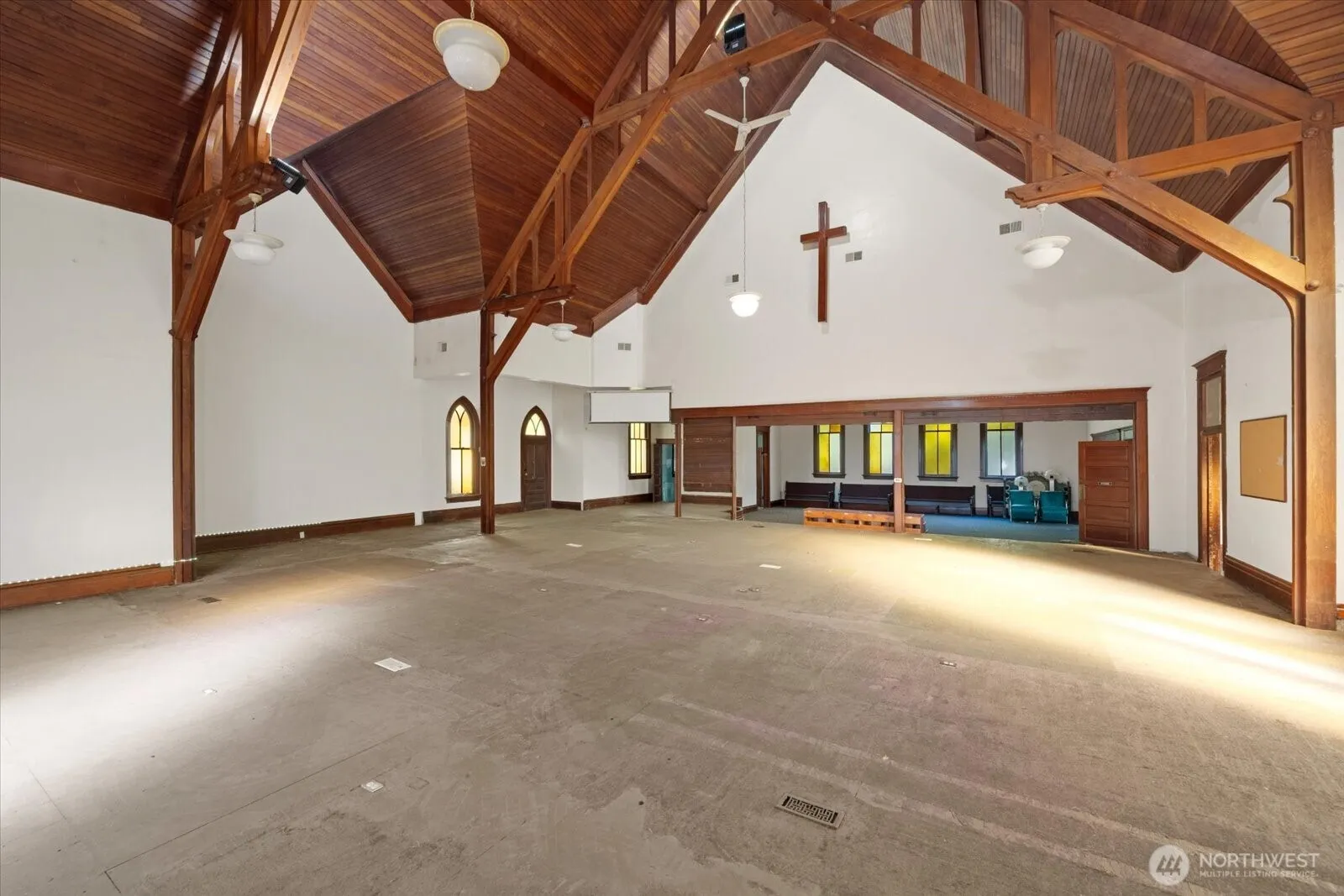 HISTORIC CHURCH: Incredible architecture with classic design, arch ceiling with gothic style craftsman style wood detail. Over 7,348 Square feet for $425,000? That’s only $57.84 per sq. foot. Amazing price for all that is here. Over 3,674 sq. feet on the main floor alone. Basement has been used as a two bedroom apartment with 3/4 bath (double sink) and half bath along with full kitchen with utility room. What ever concept you can imagine, this is the blank canvas to paint to fulfil your dream.