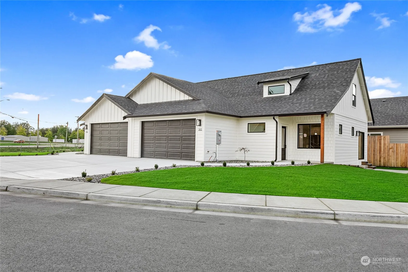 Discover this new construction, zero-entry townhome with no steps on the main level! Spanning 1,498 SF, this 3 bdrm, 2.25 bthrm home offers modern living with upgraded countertops and cabinets. The main-level primary suite features a spacious walk-in closet, a luxurious bathroom with tiled floors, a dual-sink vanity, and a walk-in tile shower. Enjoy year-round comfort with 3-zone ductless heat and air conditioning, and high-efficiency stainless steel appliances, including a washer and dryer. Fully landscaped with a 2-car garage, and above the floodplain. Located within walking distance of downtown Everson and Riverside Park, this is the perfect blend of convenience and contemporary design!