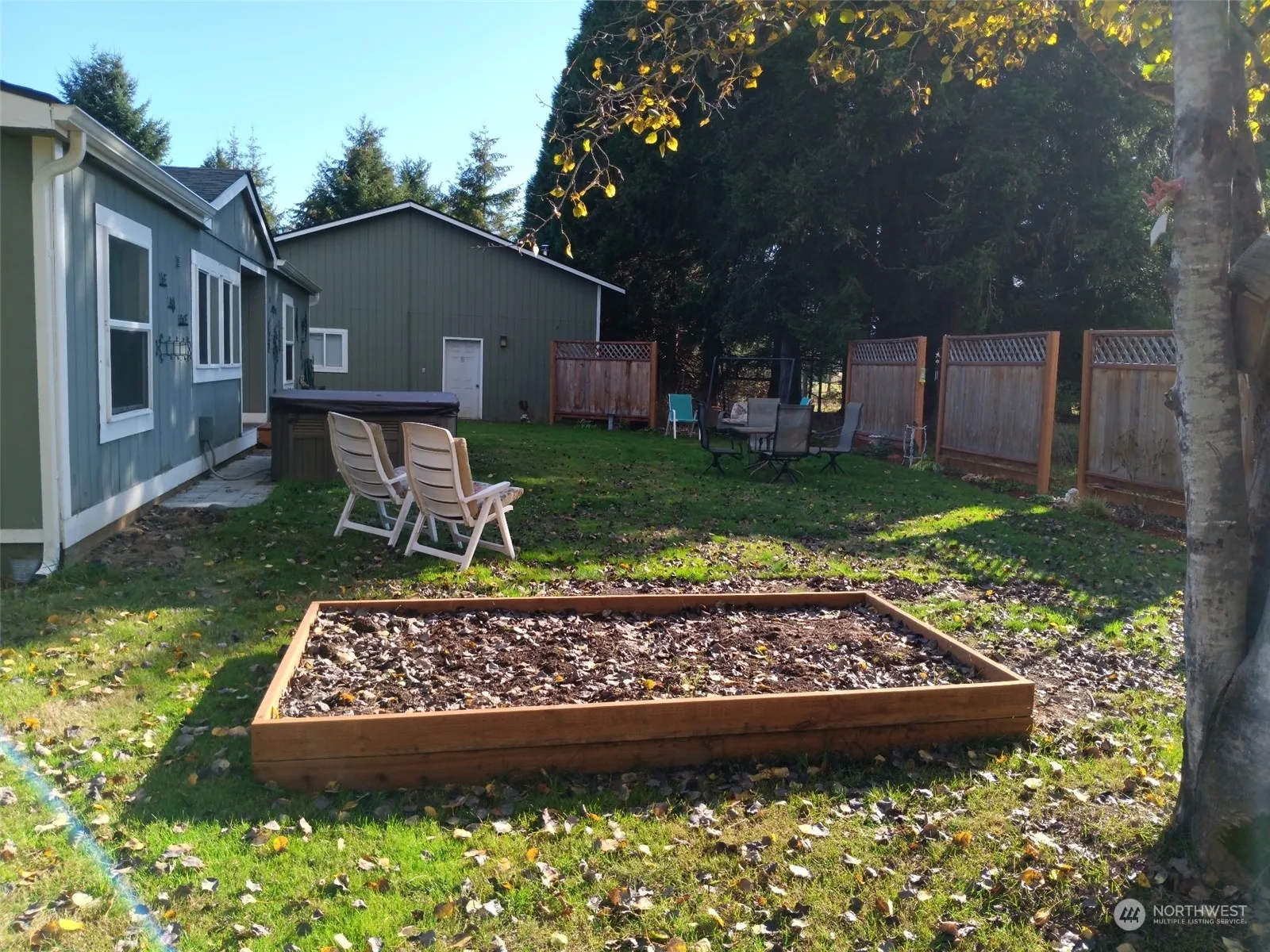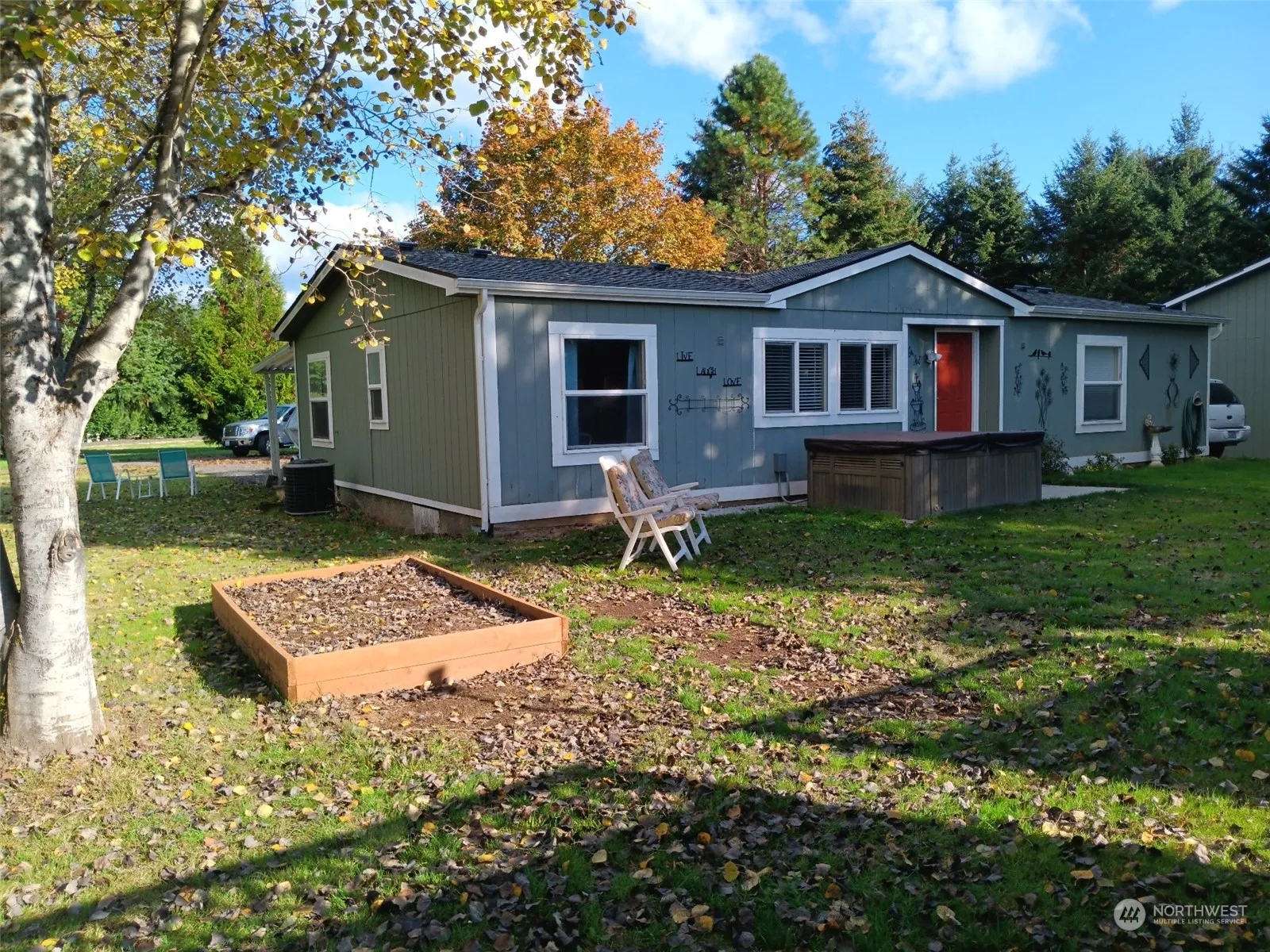 3Bdrm, 2 Bath manufactured home in a private treed setting. 1/4 Acre lot size. 55+, Sharing a driveway with just one other home. 25×35 fenced garden space, many, many baskets of produce came from there this year and given to the food bank and church. RV/Boat parking is negotiable with the management. Hot tub in the pictures is not included in the purchase. Lots of space in front and back yard for activities or just enjoy the lush scenery. Newer composition roof.