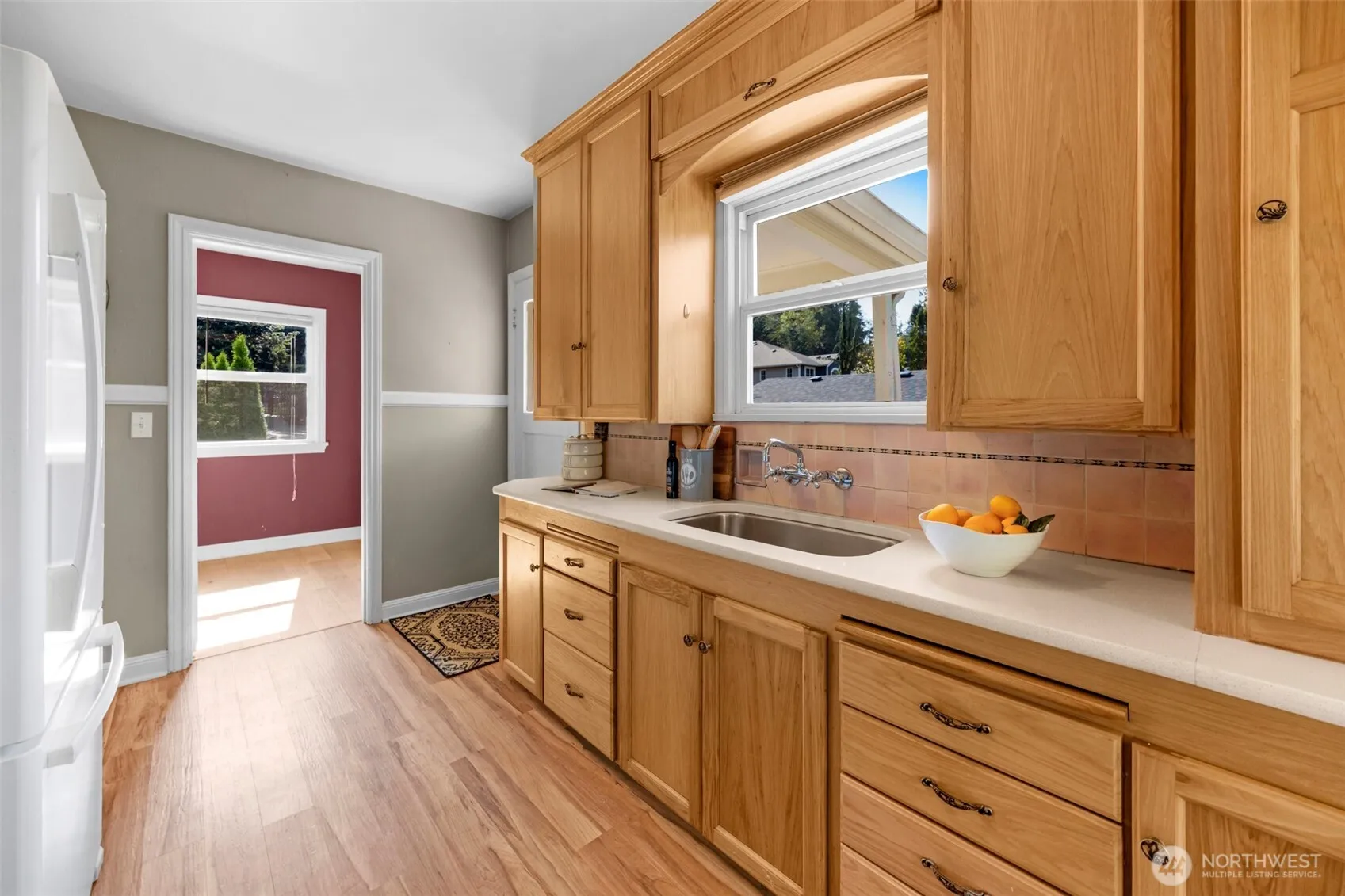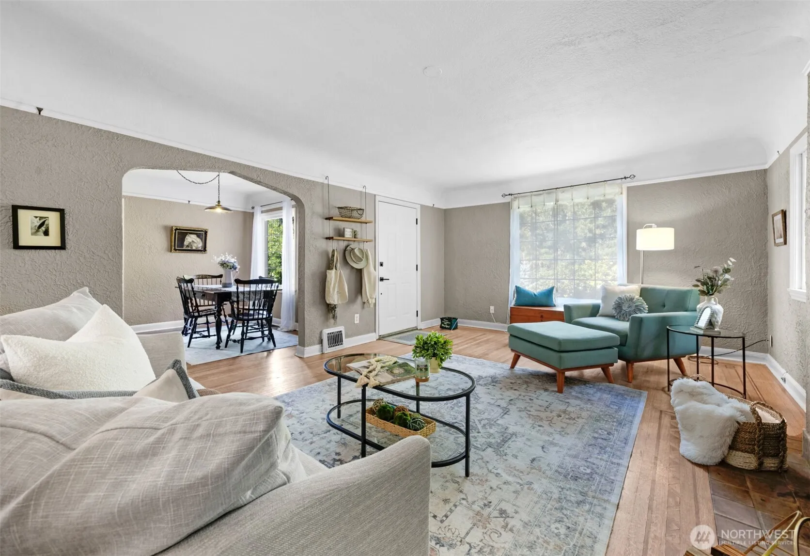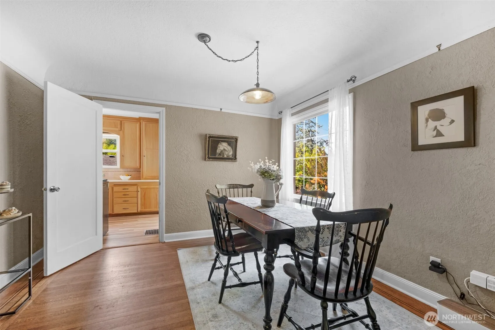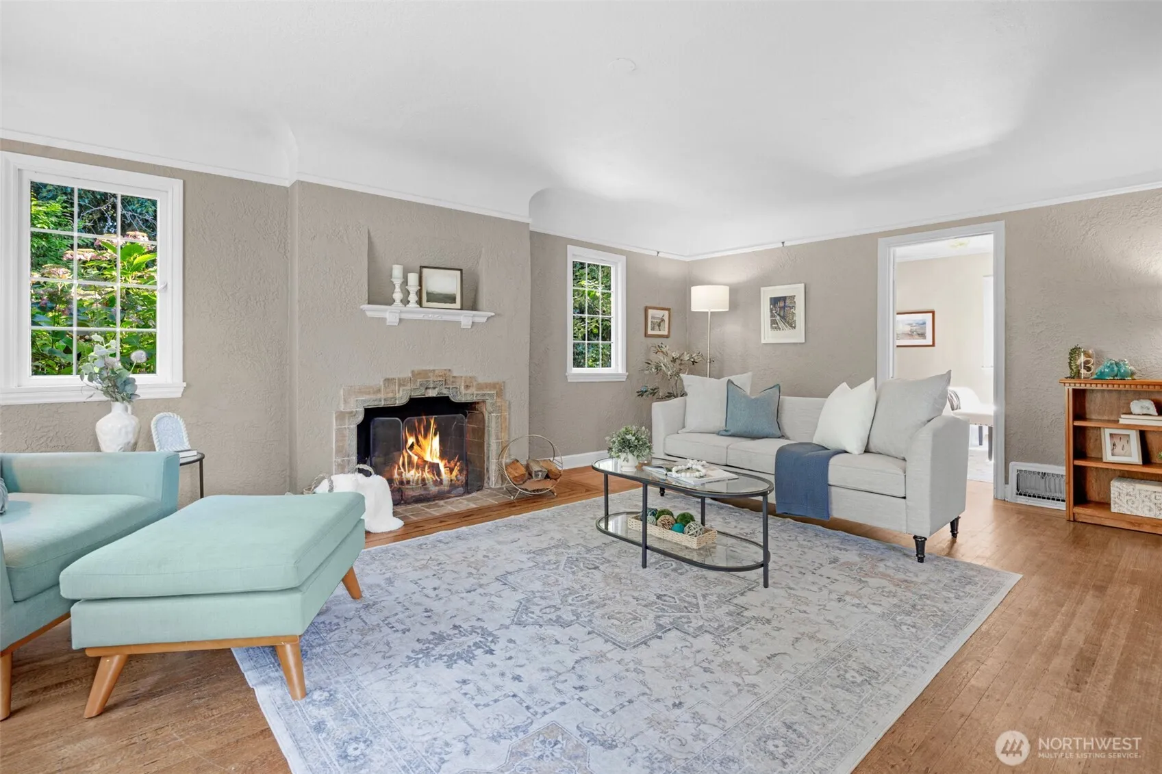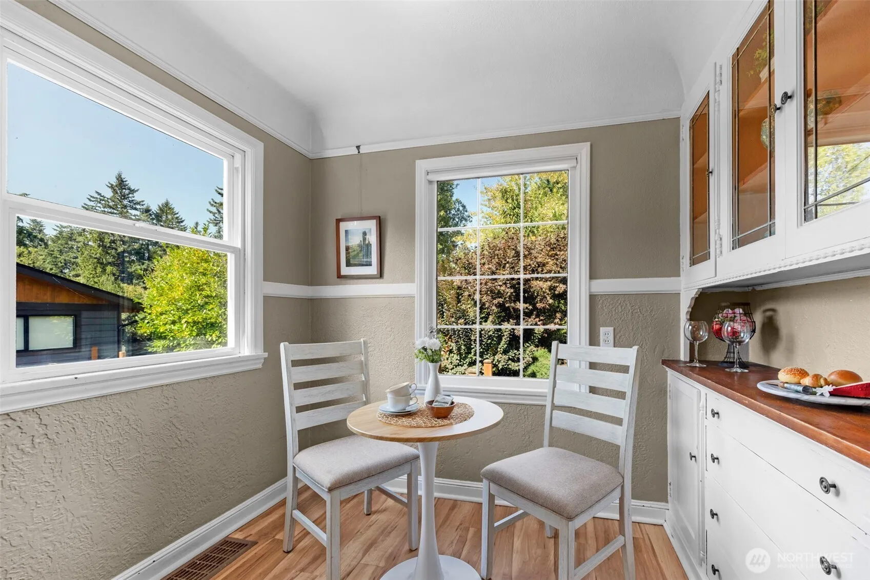 Tucked away on a spacious lot, this storybook Tudor is a rare gem in Kenmore. Sunlight fills the home, highlighting original hardwoods, coved ceilings, leaded windows, an Arts & Crafts fireplace, & timeless built-ins. The generous living room with a wood-burning fireplace opens to the dining area and flows to the charming kitchen. An updated full bath is a stylish add. Primary bed on main + office. Upstairs showcases two bedroom areas & reading nook. An unfinished 526 sq. ft. basement offers storage/project space. New furnace. Large yard for relaxing & gardening. So much potential to Expand, Add DADU, or Remodel this Tudor treasure! Close to I-405, DT Juanita & Kenmore + The Village at Totem Lake. Northshore Schools. Pre-inspected.