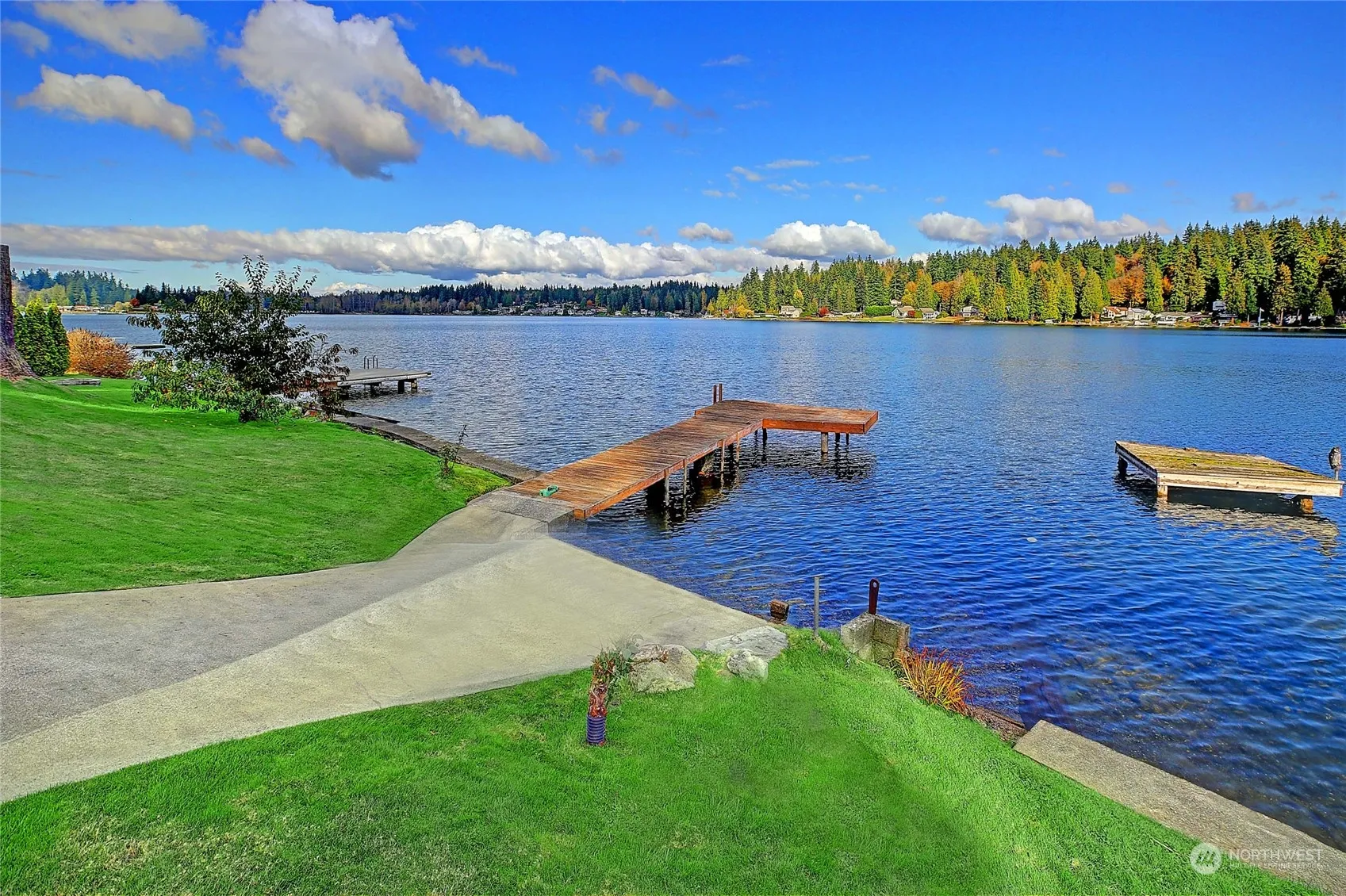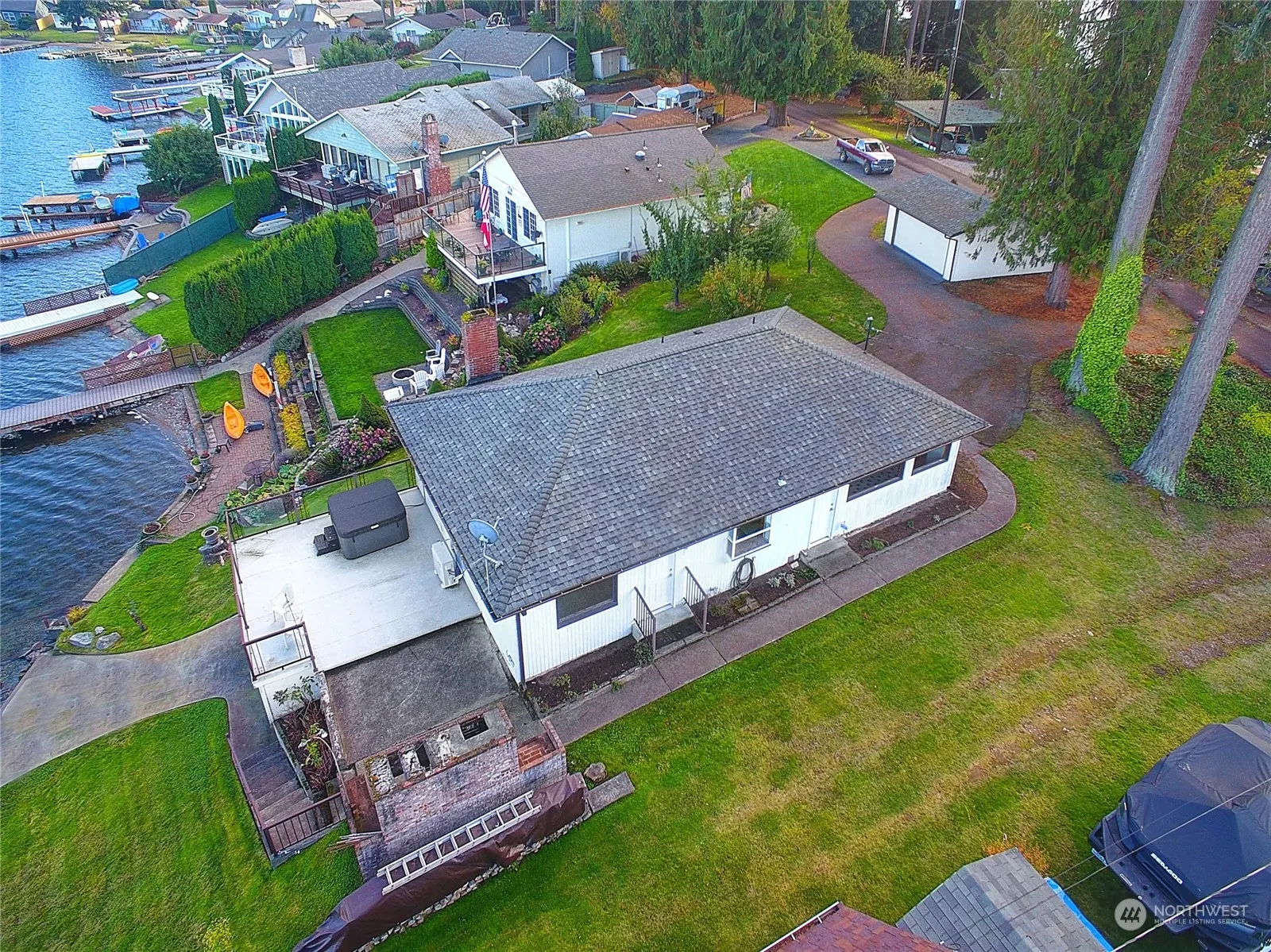 Wonderful Lake Goodwin Waterfront Home, with Dock and Detached Shop! First time on market, this is a prime, deep water location with 1/3 Acre lot on coveted lakefront. Single-level home has new granite-slab kitchen w/ island, open fireside family room w/ incredible VIEWS. Large bedroom, 2nd “den” w/ closet (1 bedroom septic). Full bathroom, laundry. Attached garage, PLUS detached shop/garage. Paved circular drive, with plenty of parking for guests. Roomy boat house underneath home, with paved ‘ramp’ access to water. Incredible deck, new hot tub, outdoor brick barbecue station. Fruit-trees, garden-space, flowing lawn & incredible lakefront neighbors. Generator panel and high-speed cable broadband. First time listed. Welcome to the Lake!