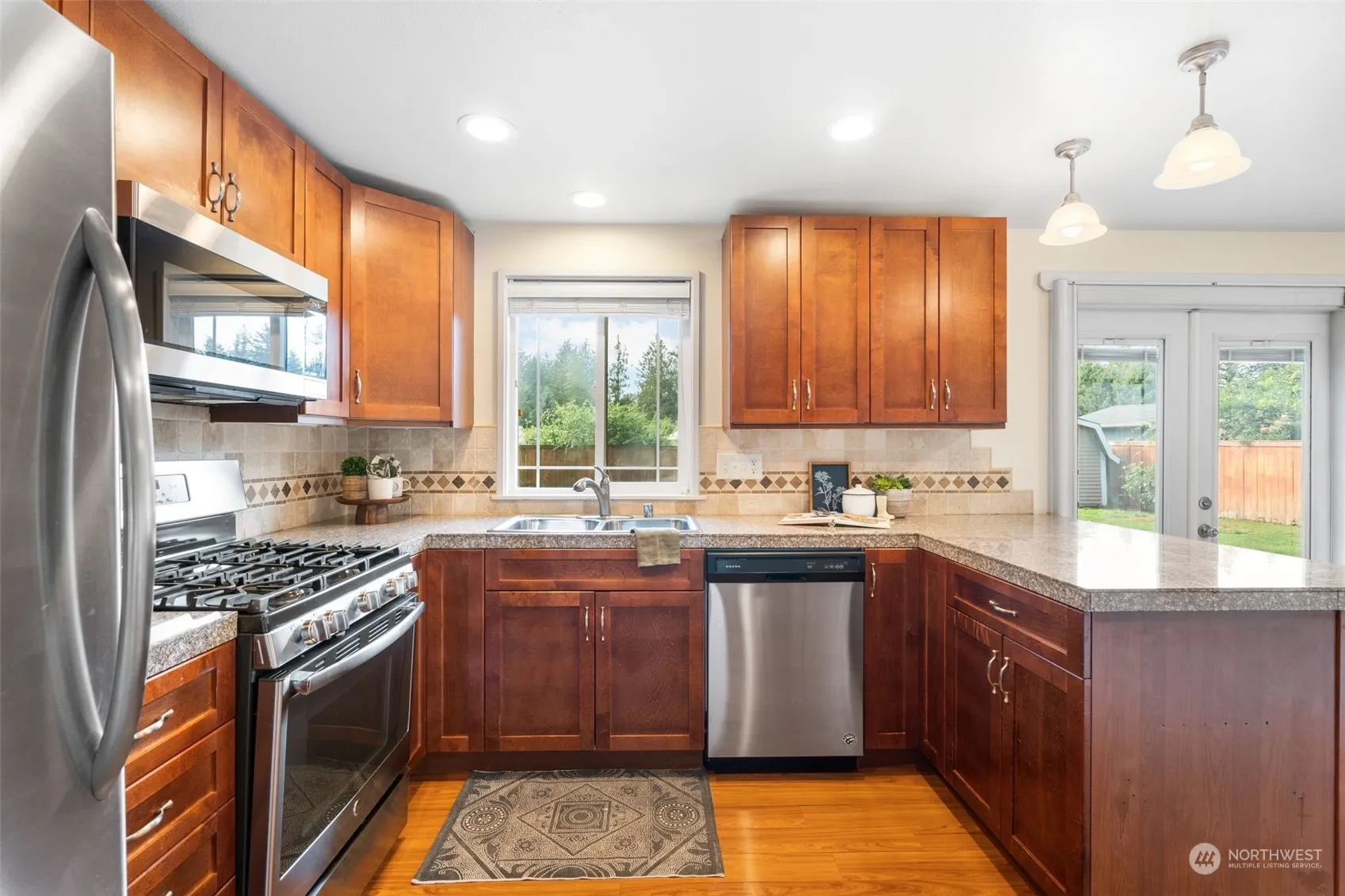 Discover this charming, well-kept single-level home, set on a generous lot in a prime mid-county location. Bright, clean, and move-in ready, this 3-bedroom residence is filled with thoughtful details, from light filled rooms, dual closets in the primary bedroom, to the updated bathroom, and cozy gas fireplace in the family room. Functional and attractive, the kitchen features modern-classic cabinetry and granite counters, along with French doors that open to a Trex deck, creating a seamless connection to the private, fully fenced yard—perfect for relaxation or play. With ample parking and a location on a quiet dead-end street, just minutes from downtown Lynden, this home offers the ideal lifestyle mix to put down your roots.