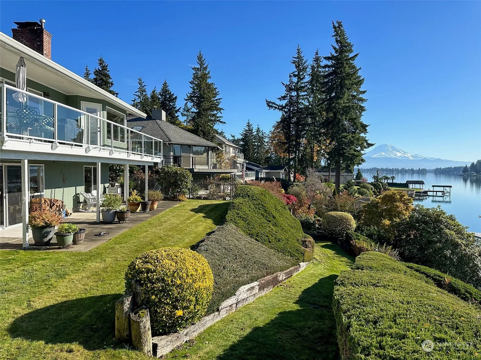 Breathtaking lake views from almost every room in this Driftwood Point home, available for the first time in 30 years! Expansive meticulously maintained rambler with a fully finished daylight basement. Primary bedroom on main floor boasts lake views and access to wrap around deck, plus a second primary/office on main w/attached bath. Kitchen features updated stainless appliances and abundant cabinetry. Beautifully refinished hardwood floors. Natural light that shines throughout home! Downstairs is a 2nd fully updated kitchen, rec room w/fireplace, bedroom and bath/laundry room! Easy walk-out access to a terraced yard leading to Mt Rainier views & 70ft of pristine waterfront w/ private dock. Detached 2 bedroom ADU currently rented @ $2k/mo