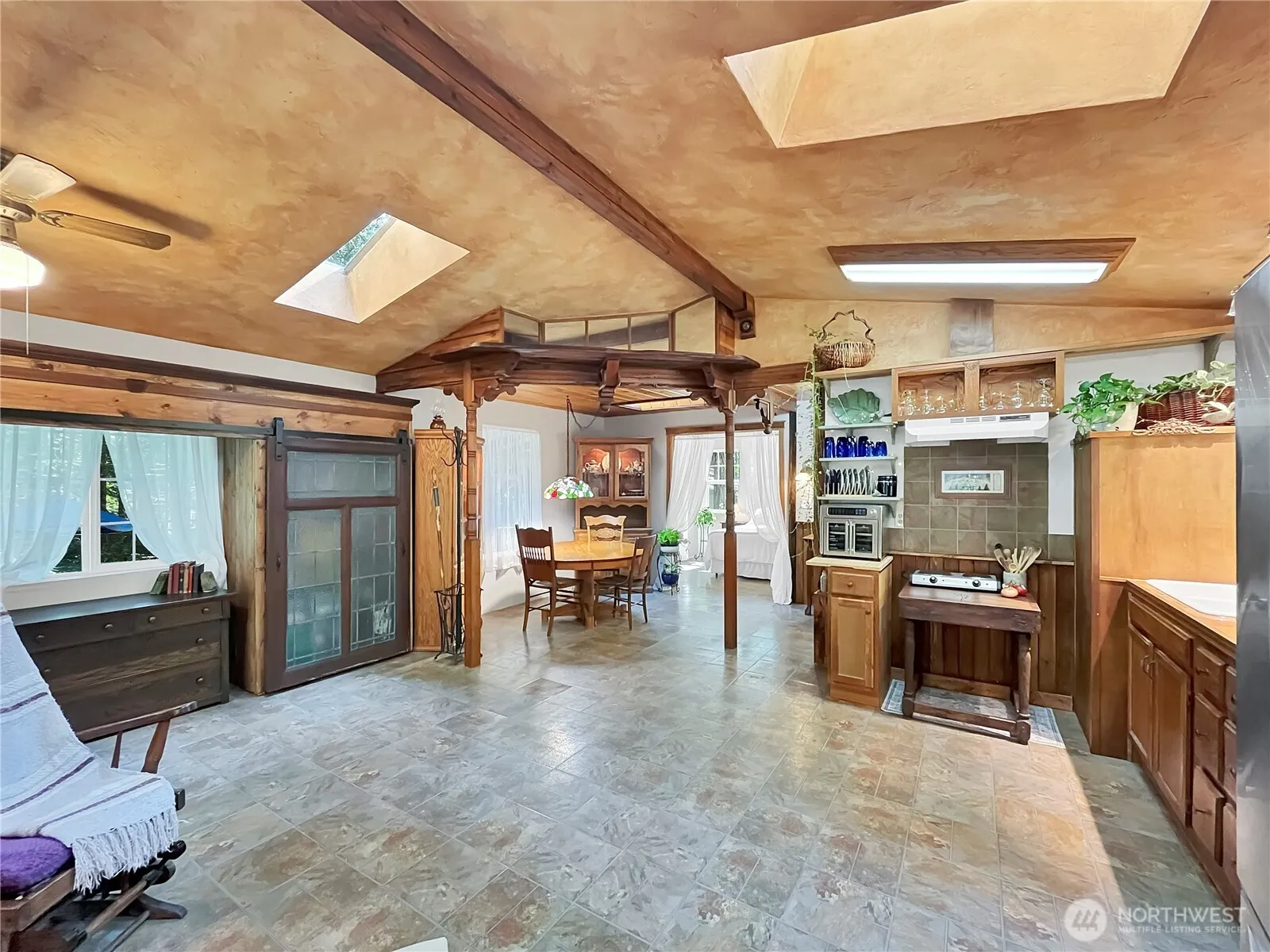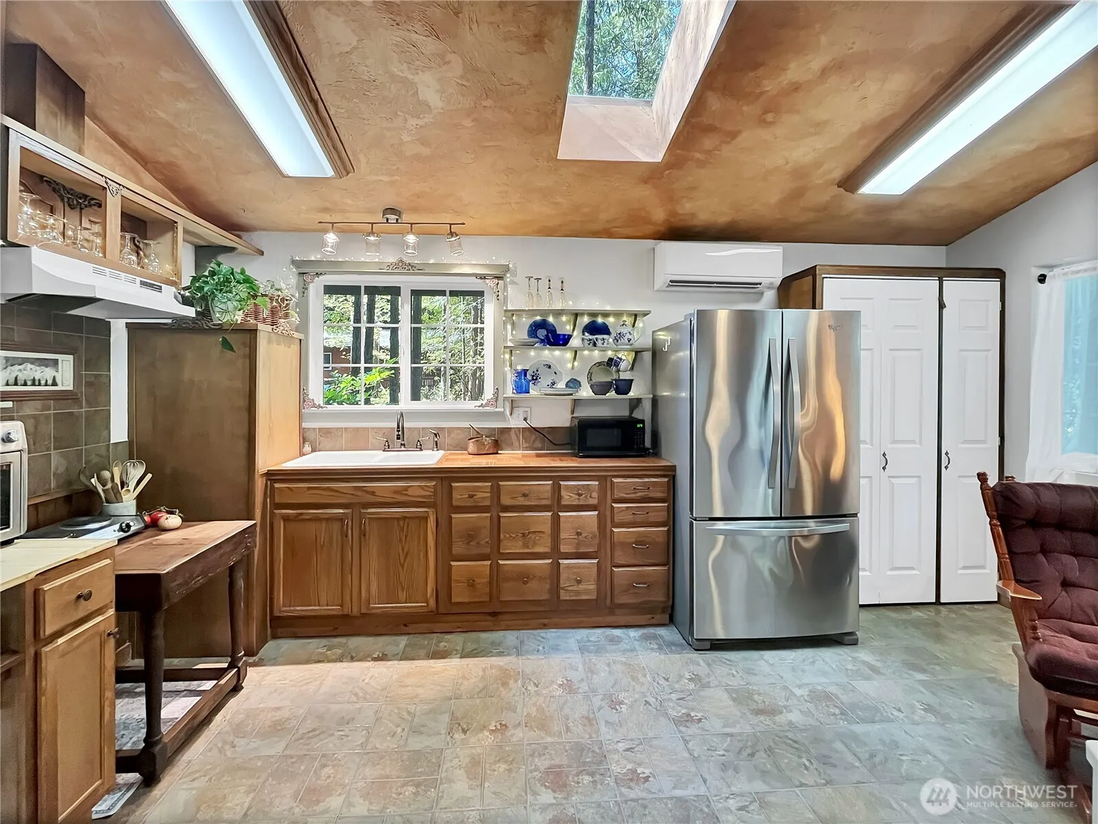 Nestled in Lake Cushman, this European-style cottage offers 1 bed, 1 bath, & detached 20×24 garage with full RV hookups. Handcrafted from studs with reclaimed materials—chapel ceilings, lodge wainscoting, & leaded glass from a Queen Anne mansion—it blends rustic charm & modern comfort. Wall of windows, skylights, & two French doors—at entry & bedroom—flood the home with light. Peaceful microclimate, official wildlife habitat, fenced yard, garden paths & bubbling pond. Recent upgrades: heat pump water heater, washer, dryer, roofs, mini-split, & full weatherization. Lake Cushman parks, boat launches, hiking, kayaking, fishing & more—minutes to Hood Canal & Hoodsport for shopping & dining. Ideal getaway, full-time home, or Airbnb retreat.