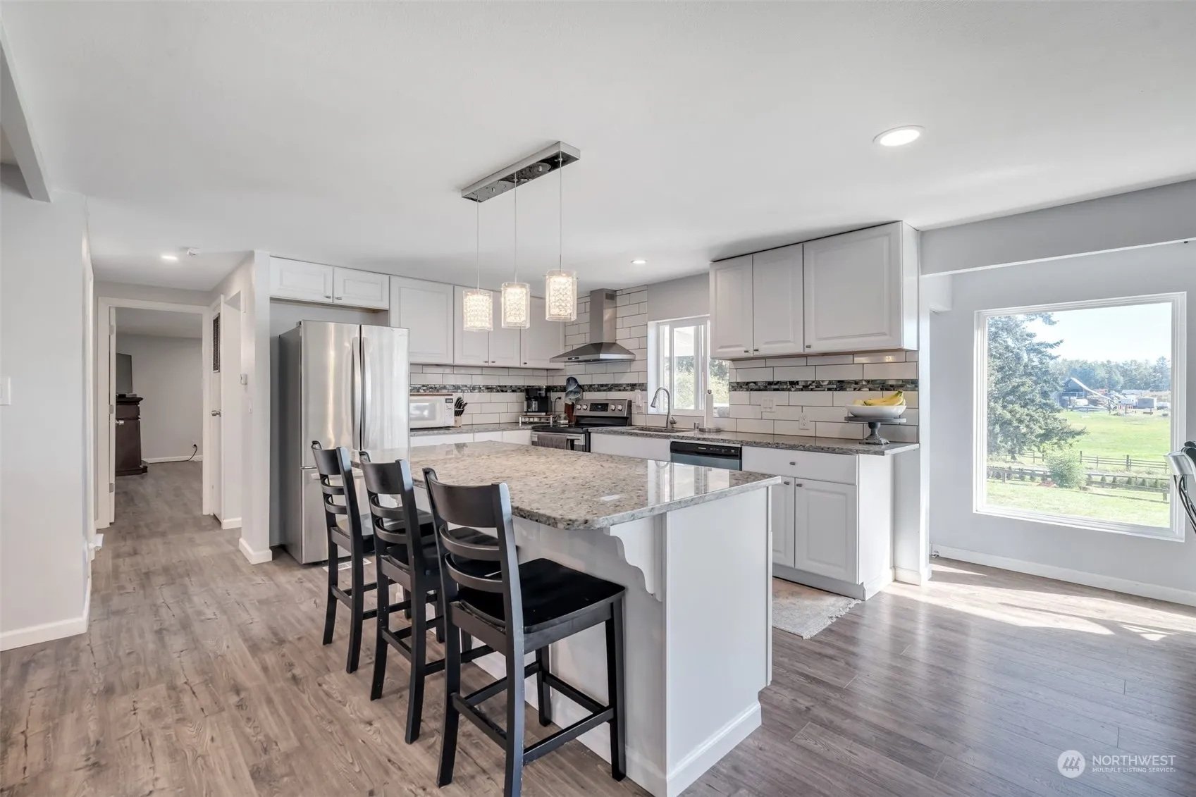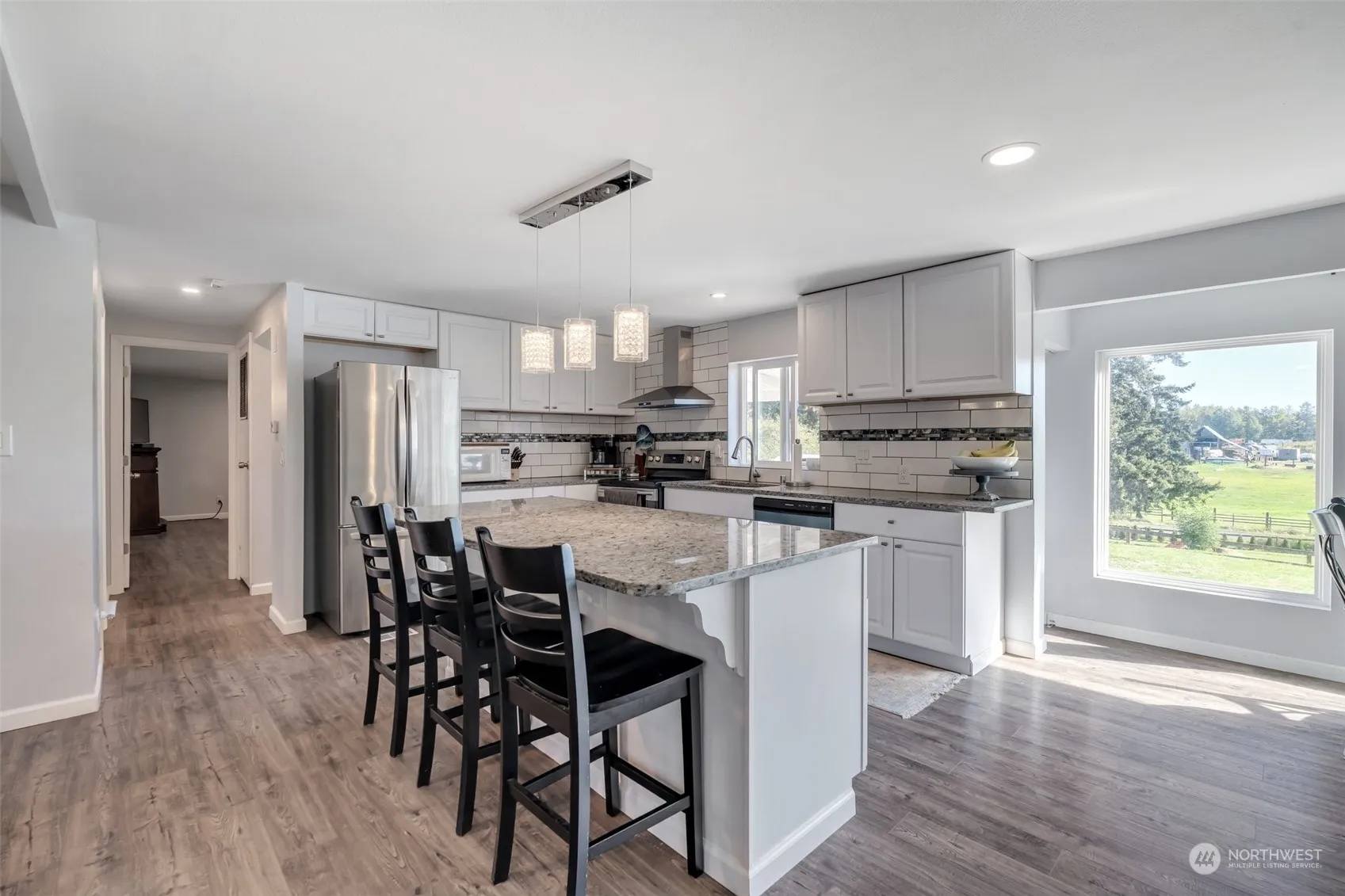 Breathtaking Mt. Rainier views from every room in this immaculate, freshly remodeled home! This stunning retreat offers the perfect blend of country living and modern design. Step into an expansive open-concept space, flooded with natural light from large windows that brighten both the living and dining areas. The updated kitchen features newer stainless steel appliances, cabinets, and countertops, perfect for your inner chef. All bedrooms are generously sized, including a luxurious primary suite with a double vanity bathroom. Enjoy almost 1.5 acres of serene land, a large deck, a 2-car detached garage and a newer roof.