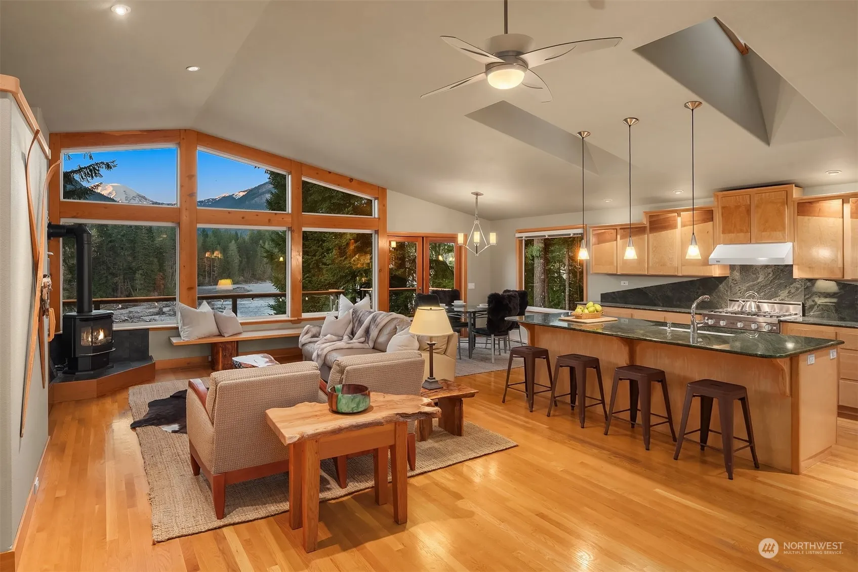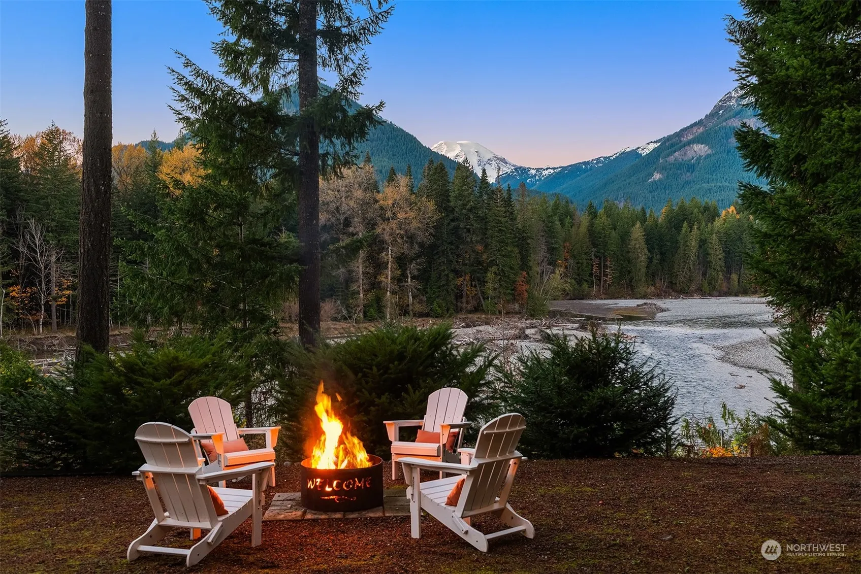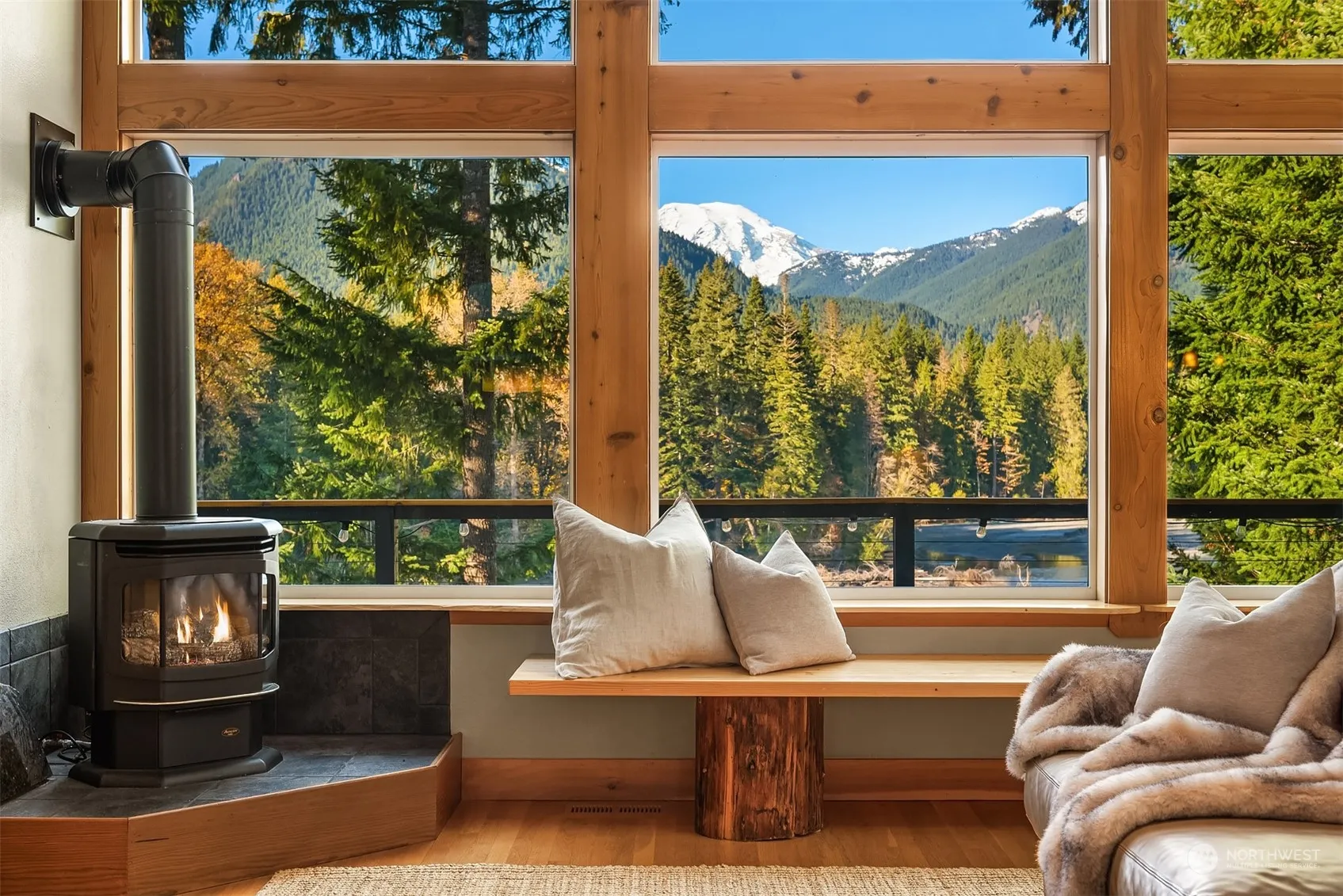 This stunning riverfront mountain retreat has it all! Spectacular Mt. Rainier views from every room. Open concept kitchen, living, and dining with real hardwood floors. Slab granite kitchen with Viking range. Solid wood doors, cabinetry, and paneling handcrafted by Randle Woods. Main level primary suite with riverfront deck access. Two extra-large bedrooms on the lower level, with full bath. Indoor ski tuning room. Tuck-under garage, perfect for a game room. Patio wired for a hot tub. Riverfront fire pit. Detached timber carport. Heat and AC from a modern heat pump. No flood risk. Located in Packwood’s ever-popular Skyline neighborhood – a stone’s throw to downtown and 25 mins to White Pass and Rainier National Park. Sold mostly furnished!