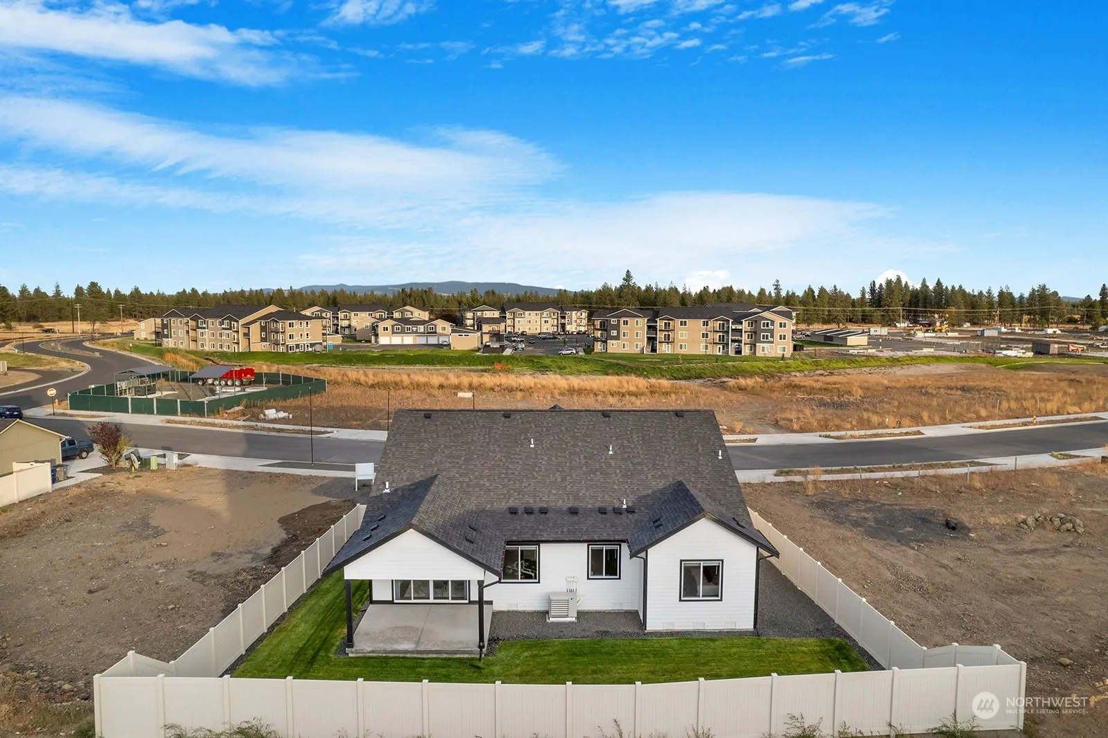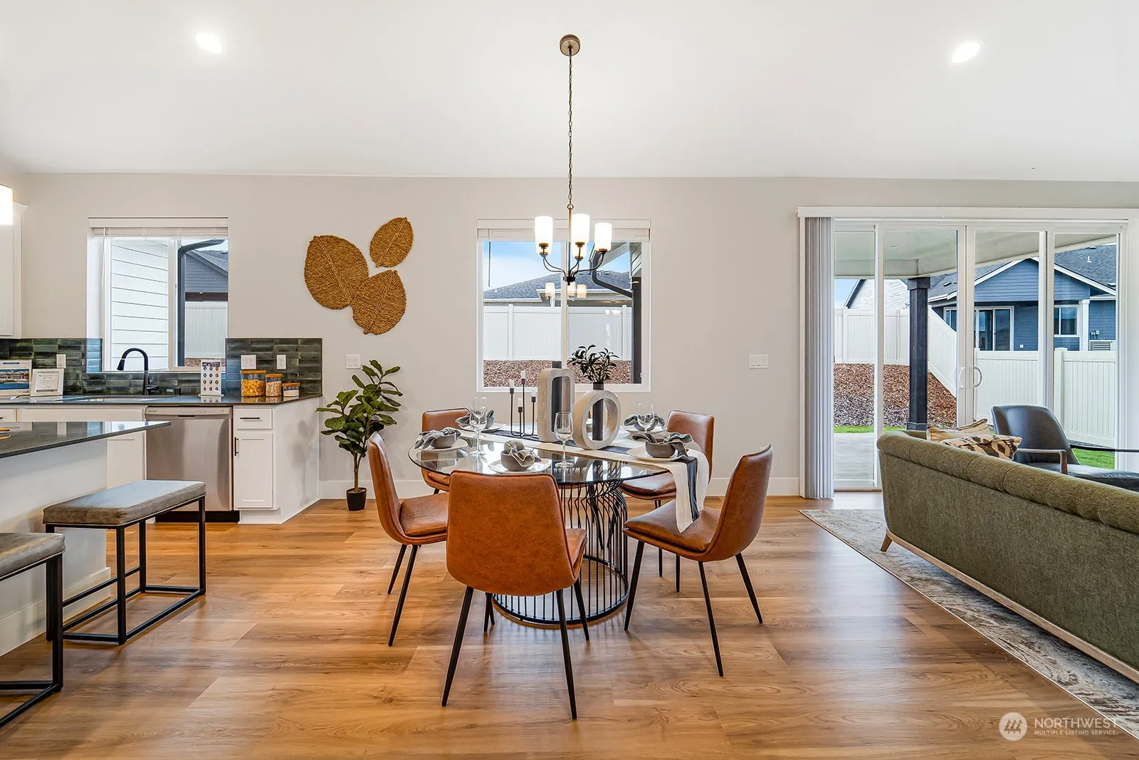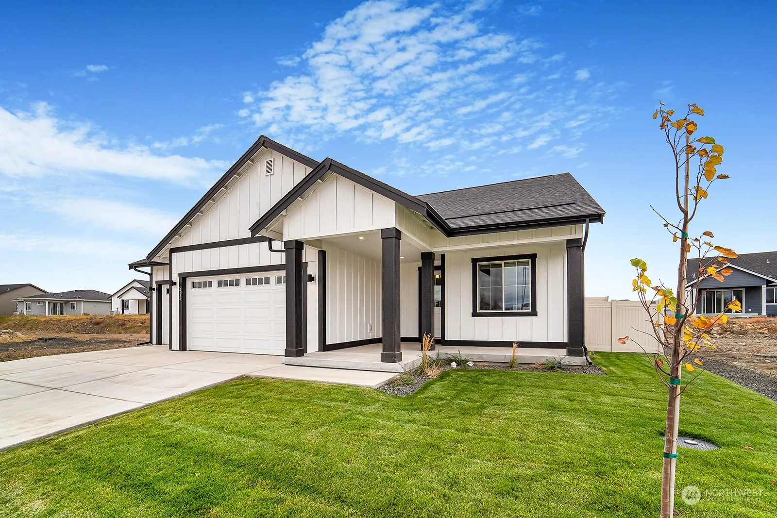 Experience modern living in the Calvary by Azure Northwest Homes. This 3-bedroom, 2-bathroom home combines comfort and style. The great room boasts vaulted ceilings and a cozy fireplace, with natural light streaming through large windows and a double slider. The kitchen is designed for the home chef, featuring 42″ upper cabinets, stunning countertops, and island, stainless steel appliances, and a roomy pantry. The primary bathroom offers a luxurious tile show/tub combo and double sinks. outside, enjoy the covered back patio and professionally landscaped front yard. With air conditioning and a 3-car garage, the Calvary blends elegance with practical living. Photos are from our model home, featuring the same floor plan.