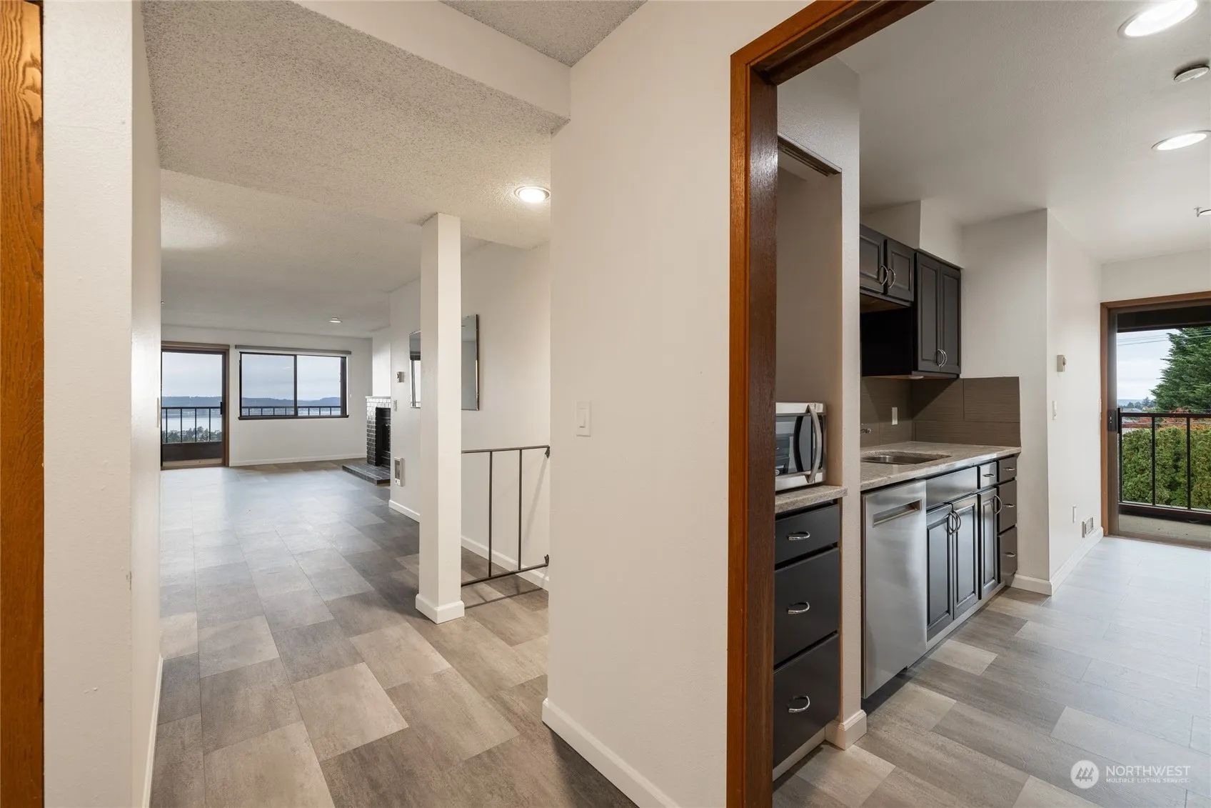 Spectacular unobstructed Views from the Olympic mountains, the Narrows Bridge. Amazing sunsets year round, this 2nd floor corner unit has 2 bedrooms & 1.75 bath, with a large dining room and roomy kitchen. All appliances stay. Gated garage and entry for security. Additional storage in garage. New flooring throughout! HOA assessment has been paid.