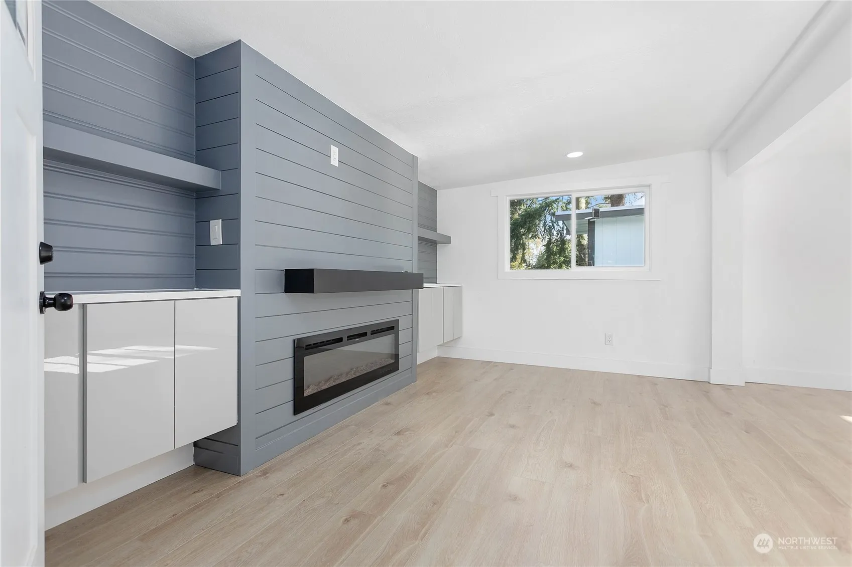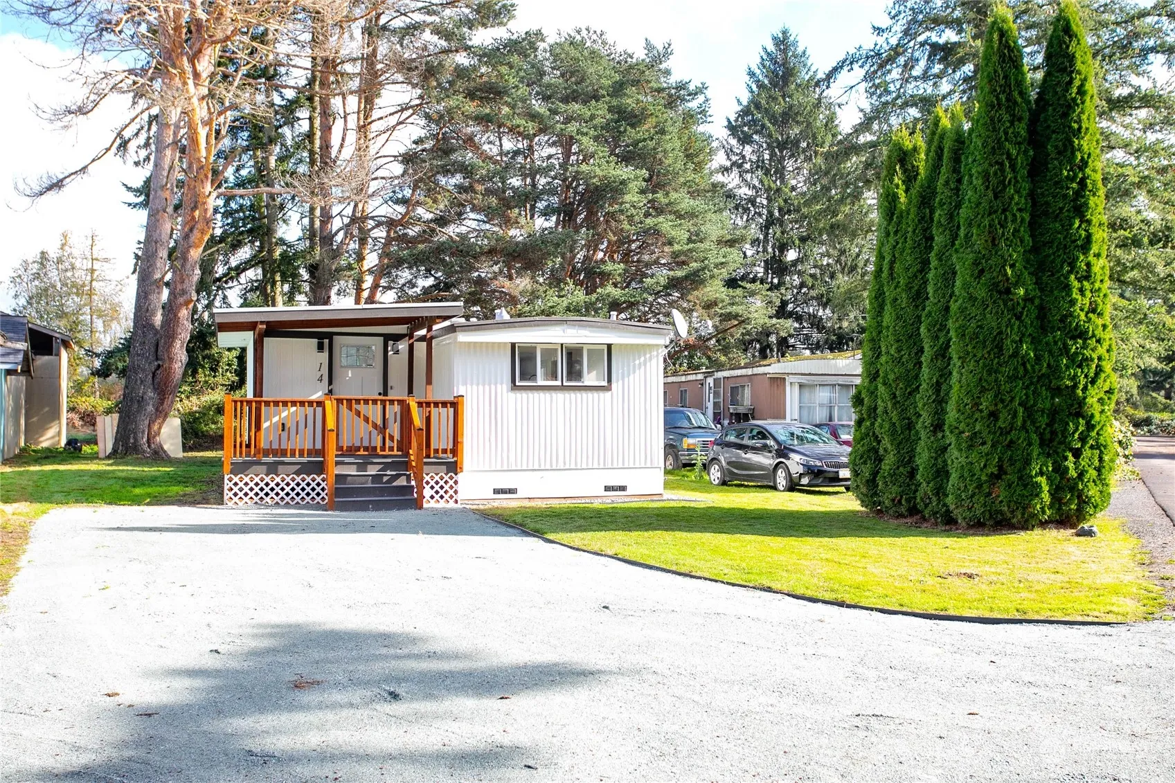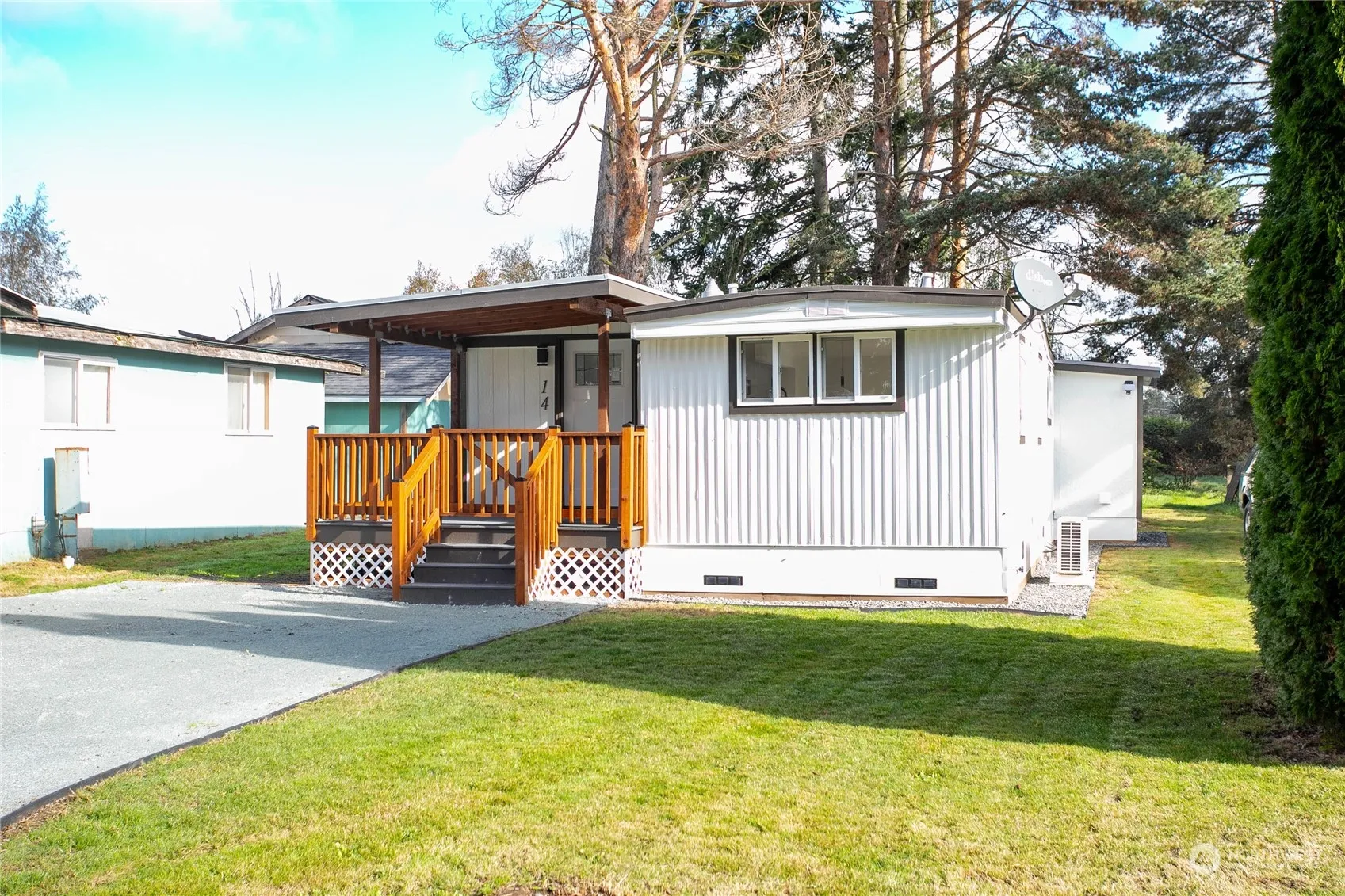 Talk about a remodel! Completely refreshed inside & out with high end finishes. Outside features a brand new TPO roof, new paint, decks, awnings, porch, skirting, landscaping, and driveway. Walk inside to what feels like a brand new home. Open living/dining space with electric fireplace, high quality LVP, all new paint, quartz countertops, cabinets, and appliances. Hallway leads to two bedrooms and luxurious bathroom with new plumbing & rain shower. Refreshed laundry room on right side of hallway. Bedrooms feature new carpet, paint and baseboard heaters. Spacious storage shed behind home.