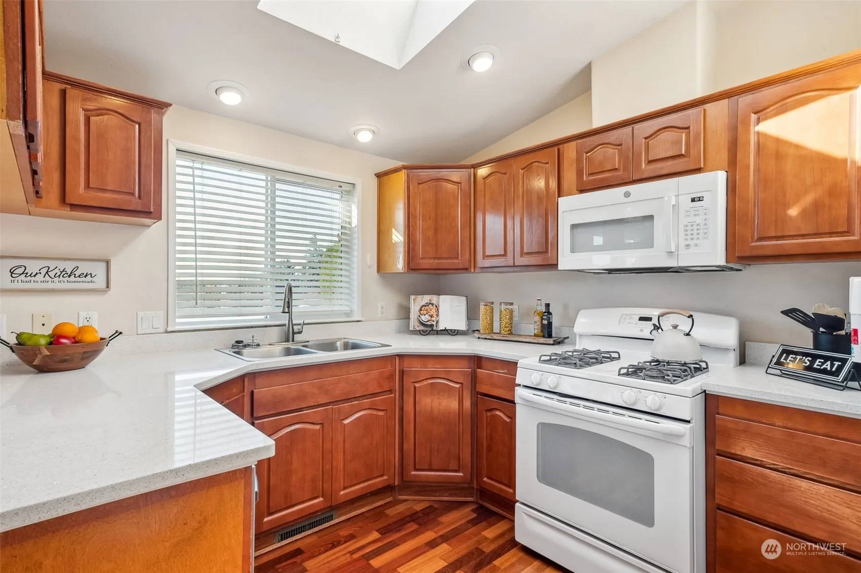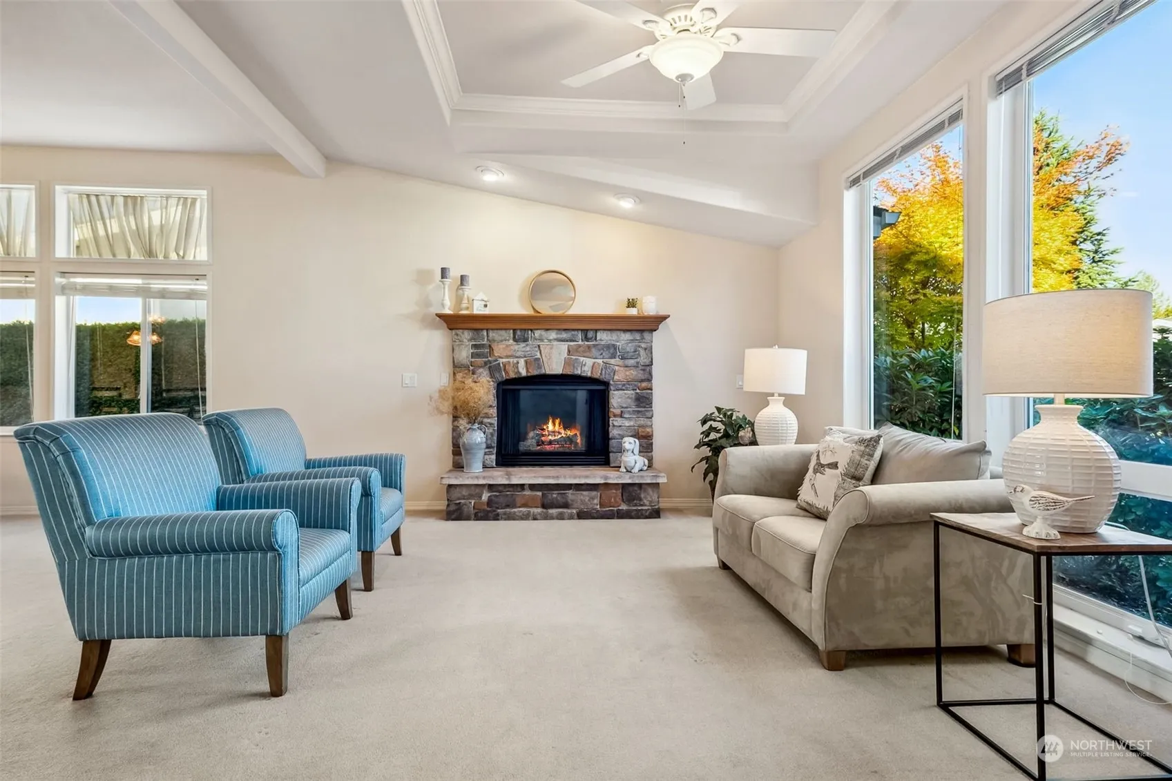 Welcome to 55+ Water Gardens! This 2 bed, 2 bath, 1440 sq ft one level home offers a modern yet cozy living experience. The kitchen shines with updated quartz countertops & a pantry. Cherry hardwood floors add warmth & elegance in the kitchen area. Both bathrooms have been tastefully updated w/ quartz counters & new faucets, adding a fresh, contemporary touch. Relax by the warm gas fireplace in the inviting living area with tray ceilings. Home features a convenient 2 car garage w/ a pull down ladder to extra storage. New roof in 2023 & has A/C. Step into the backyard to take in the amazing views from your porch. Enjoy the community amenities, beautiful grounds & waterfalls & vibrant lifestyle & activities this gated 55+ neighborhood offers