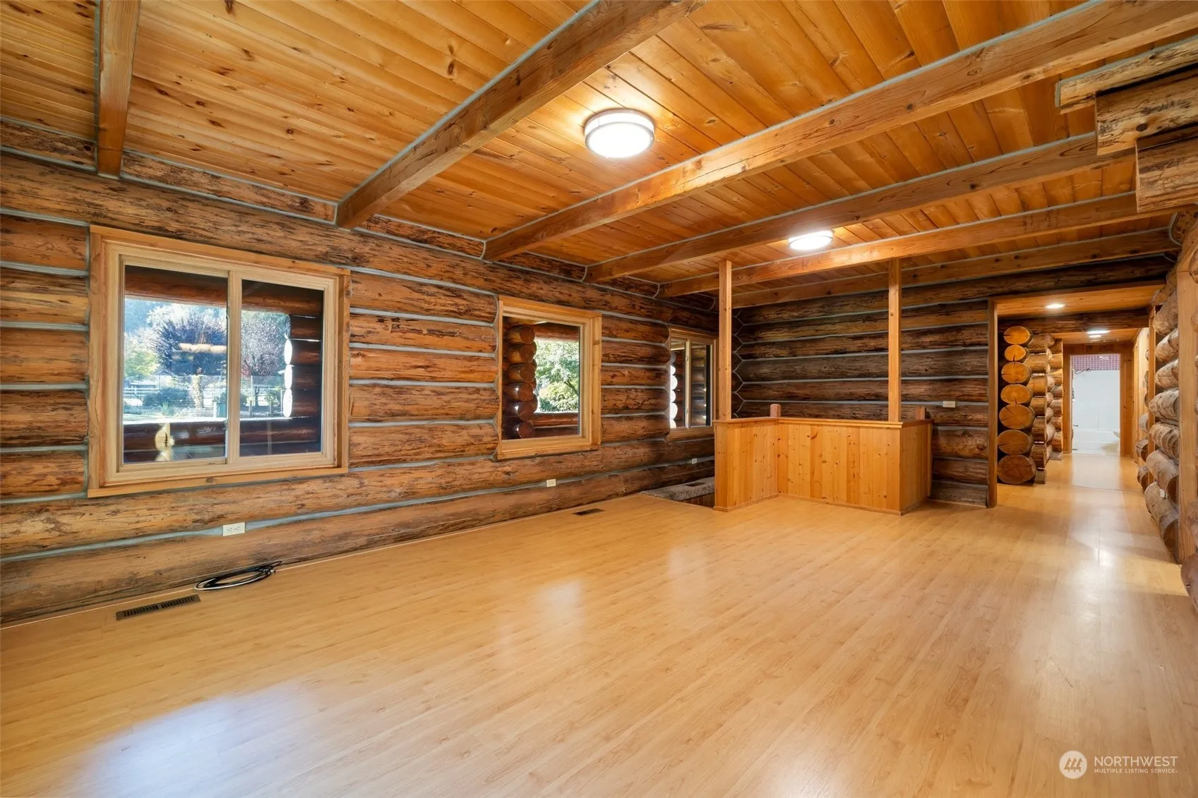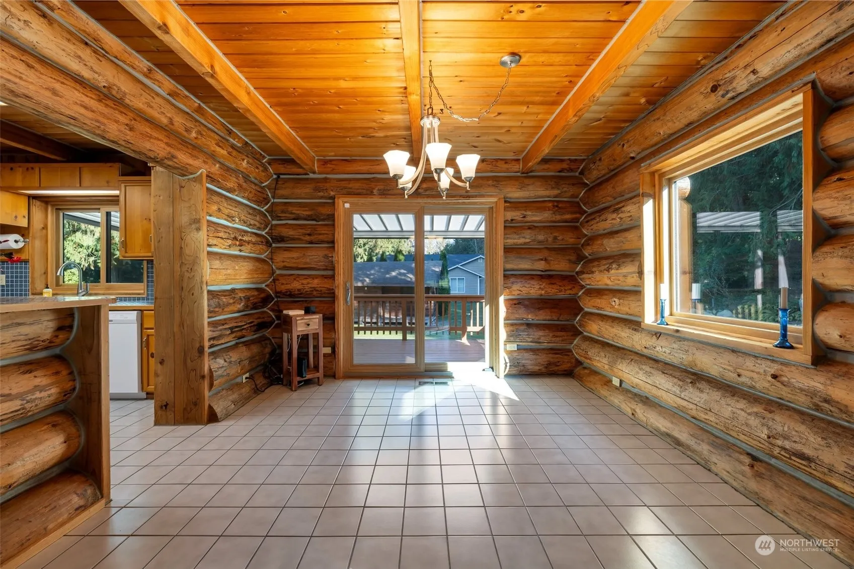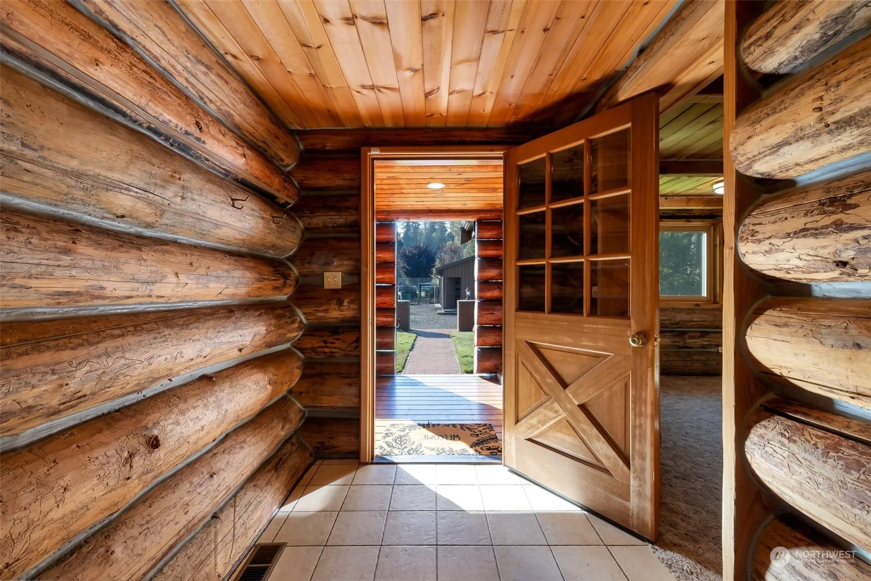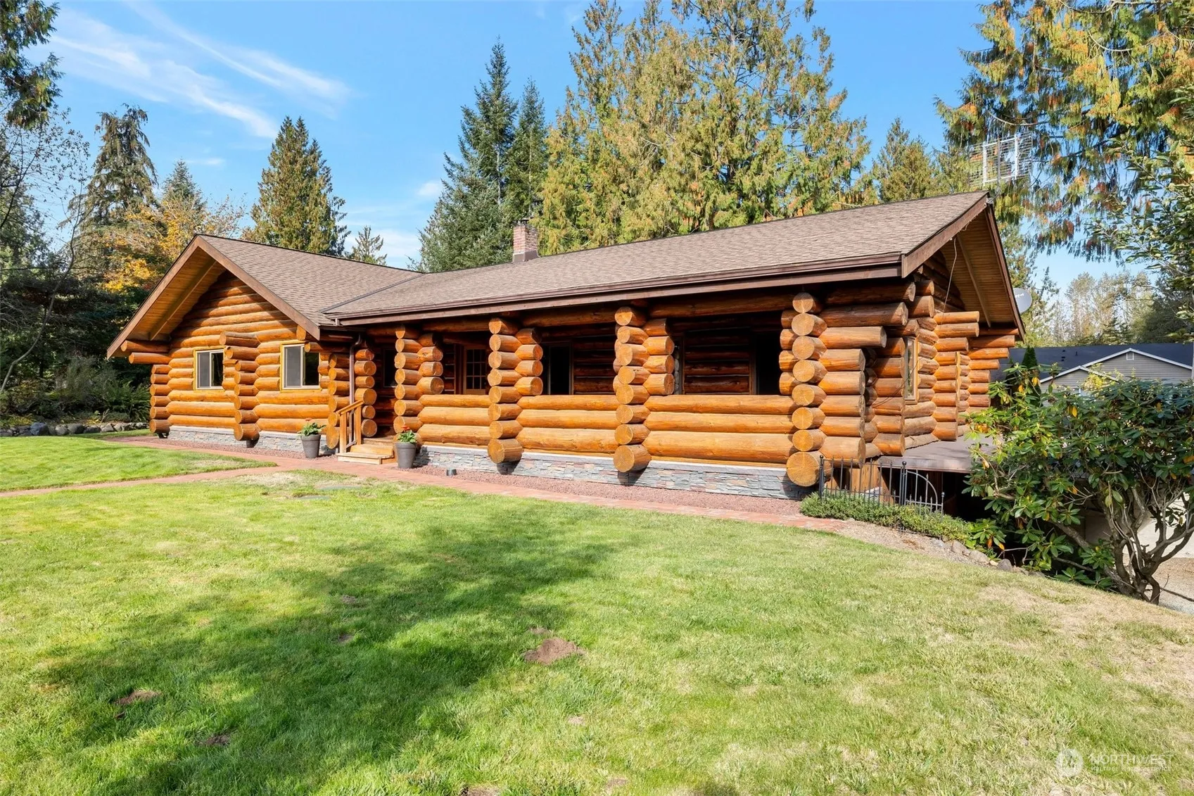 Light & bright 4 bedroom, 2 bath custom craftsman log home on quiet, level acre in Buckley Meadows. Fully fenced & gated entry. Large, wood planked porch for that morning coffee. Generous living room & dining with slider to private, covered backyard entertainment deck. Plenty of prep area in the kitchen. Large Primary Suite with walk in closet & bath, 3 additional bedrooms, large laundry, and full bath. Lower level features two finished rooms that could be hobby, bedroom, or office. One car attached garage & storage + 2 car carport. Large detached oversized 2 car garage & a generous hobby, art studio or storage barn. Lush landscaped grounds with a variety of fruit trees & towering cedars. Easy access to conveniences. Air conditioned.