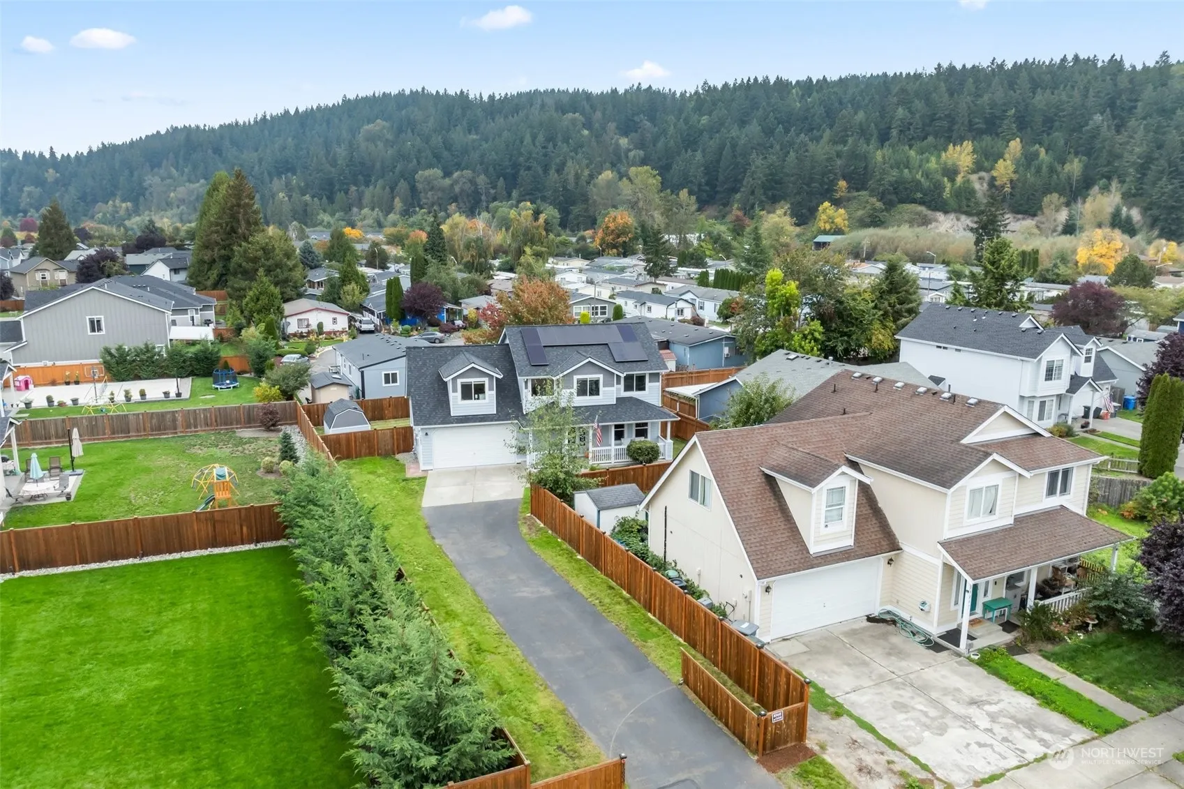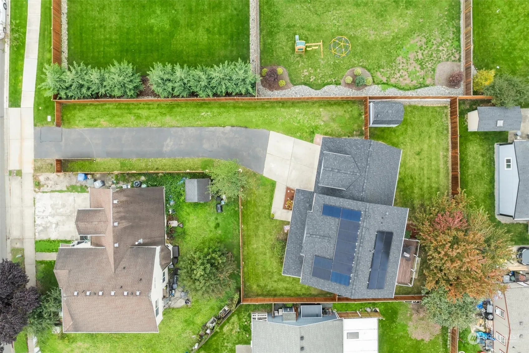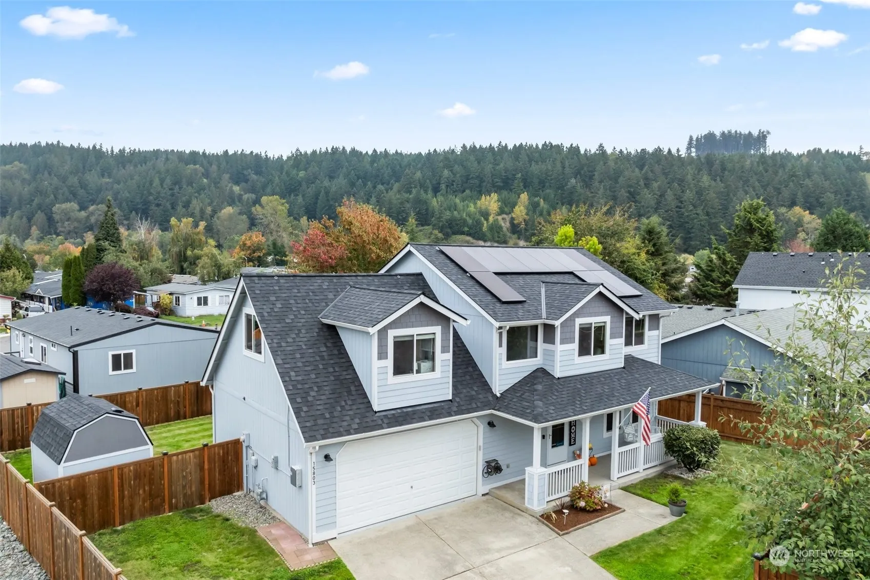 Come check out this beautiful home in desirable location. Long driveway provides lots of privacy. Outside features fully fenced lot with gated entry, large front porch with swing, newer roof 3 years old with transferable warranty to new buyer, solar panels, as well as a large deck in the backyard, outbuildings for storage, and plenty of parking for RV and other vehicles. Inside this home you will find large windows for lots of natural lighting, natural gas fireplace, large open concept kitchen, vaulted ceilings in the primary bedroom along with a walk in closet and primary bathroom, large oversized bonus room, and central heat and A/C. All appliances stay. Schedule your showing today!