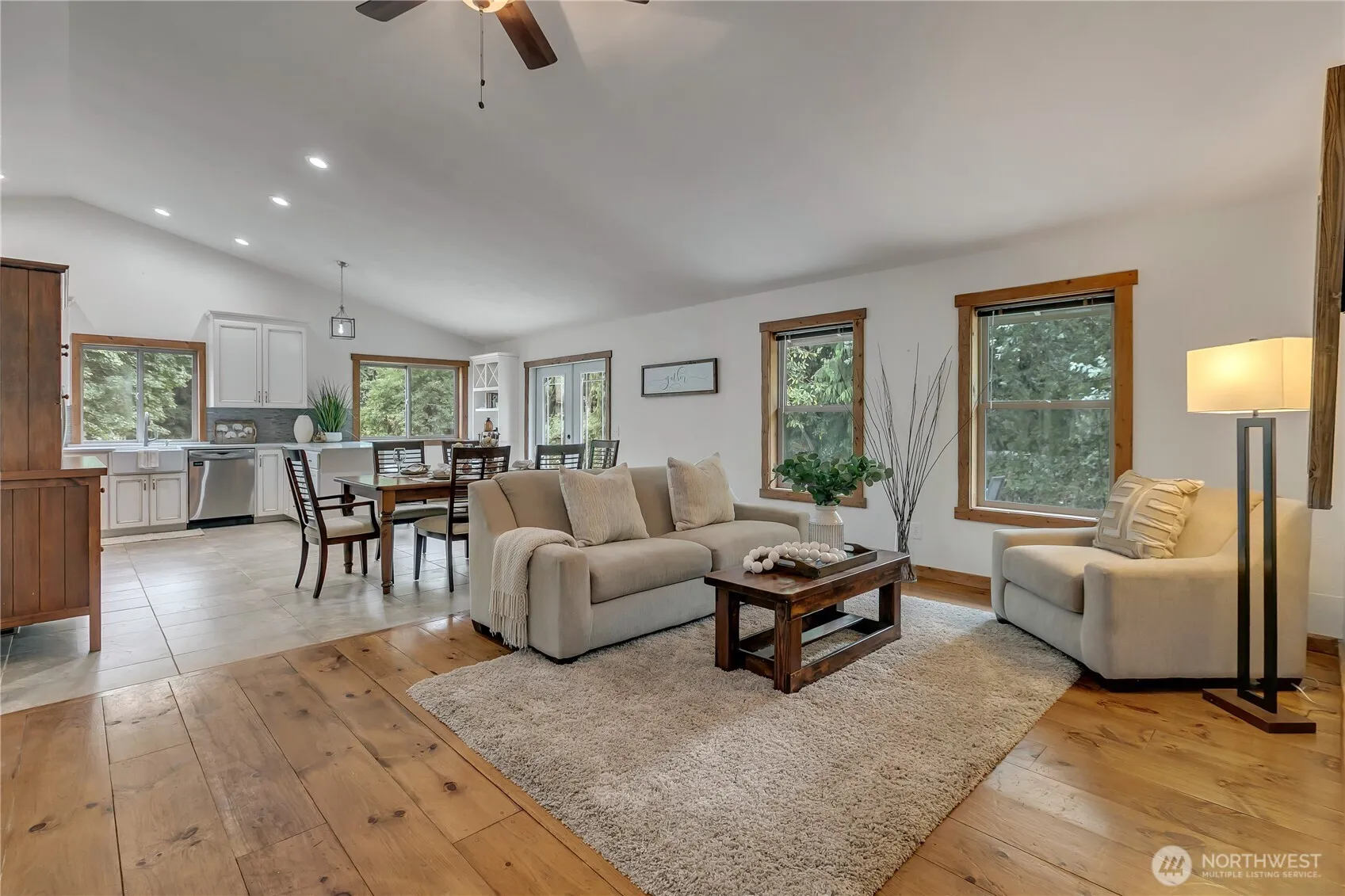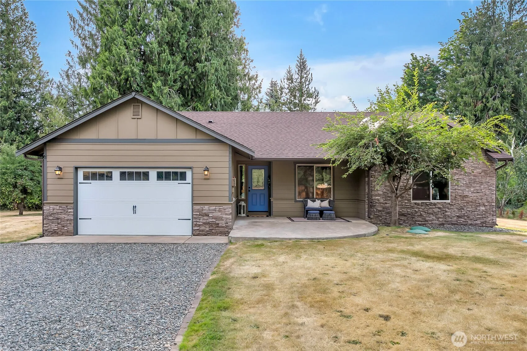 Iron gated entry opens to charming rambler on 3+ level acres at the end of a private cul-de-sac. Main home features 1,238sf/3 bd/1.75ba, vaulted ceilings, wide-plank hardwoods & granite counters. Live edge cedar frame the picturesque views from each room. Sliding doors open to serene outdoor space surrounding Lg front & back patios. MIL/ADU w/private entrance: 720sf/1bd/1ba—ideal for guests/office/multigen living/rental income! 1,476sf detached shop w/stove, 3-bays w/space for 5+ vehicles, workshop, workbench & attic storage! Adjacent bar/entertainment space & patio. Park-like setting w/playset & firepit. Detached carport, excellent covered RV/Boat/Trailer parking. Previously, the county approved the property for an additional 4 bdrm home.