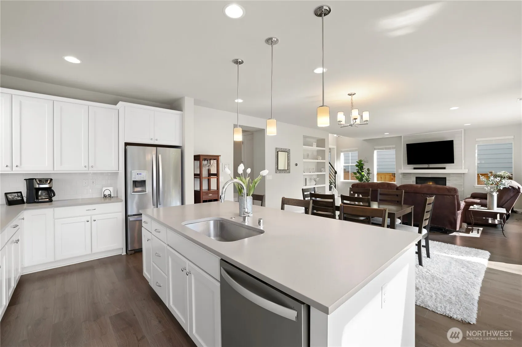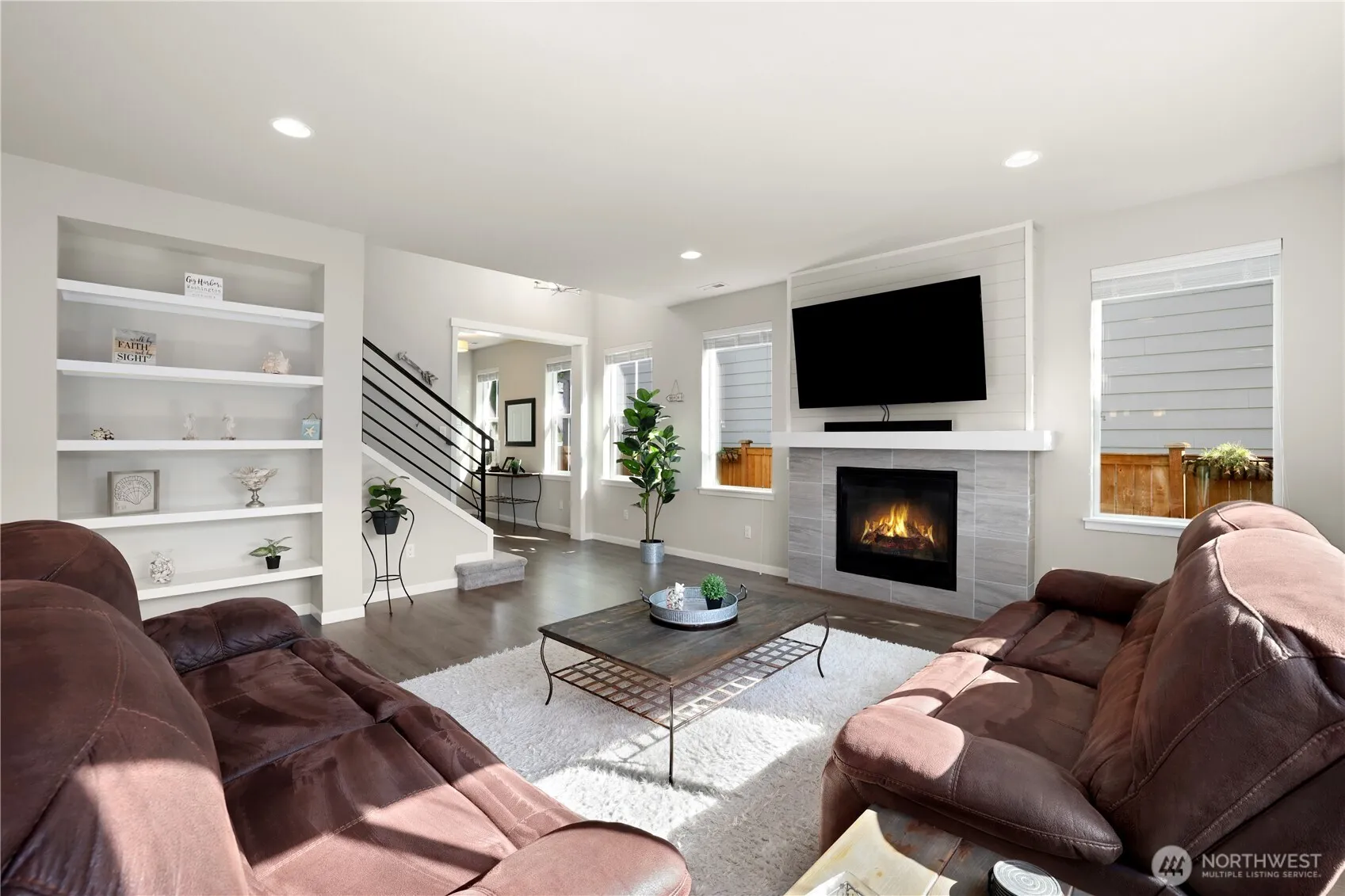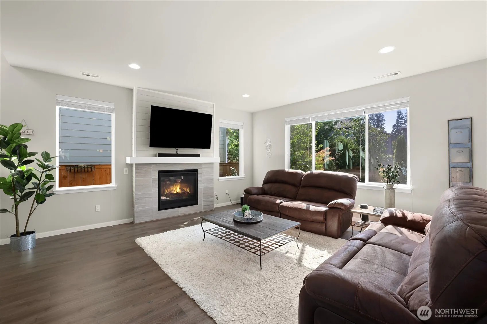 Welcome to this beautifully designed home filled with an abundance of natural light and a spacious open floor plan perfect for modern living. The inviting living area features a cozy fireplace, creating a warm and welcoming ambiance. The kitchen is equipped with sleek stainless steel appliances, ideal for cooking and entertaining. A convenient main floor bedroom offers flexibility for guests or home office use. Upstairs, the private primary suite provides a peaceful retreat. Step outside to enjoy the covered patio, perfect for relaxing or entertaining year-round. The fully fenced backyard offers space and privacy for outdoor fun. Stay comfortable in every season with central air conditioning. This home has it all—schedule a tour today!