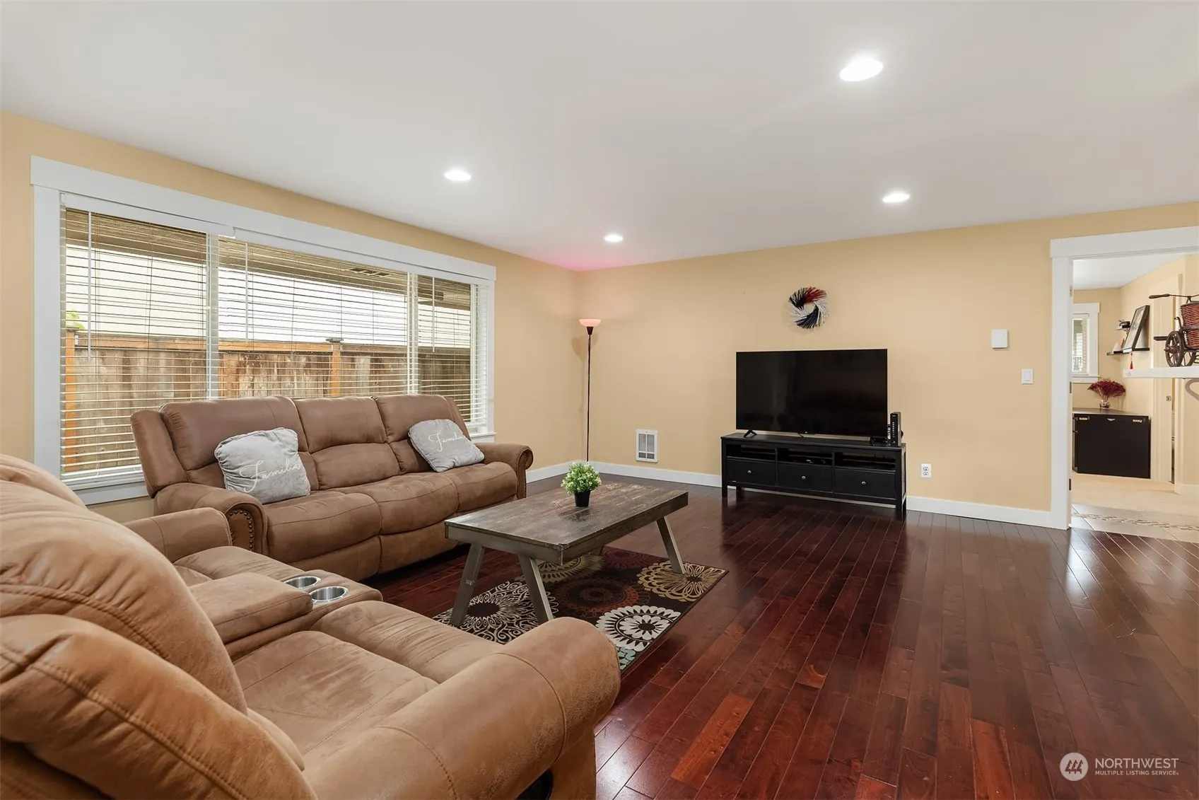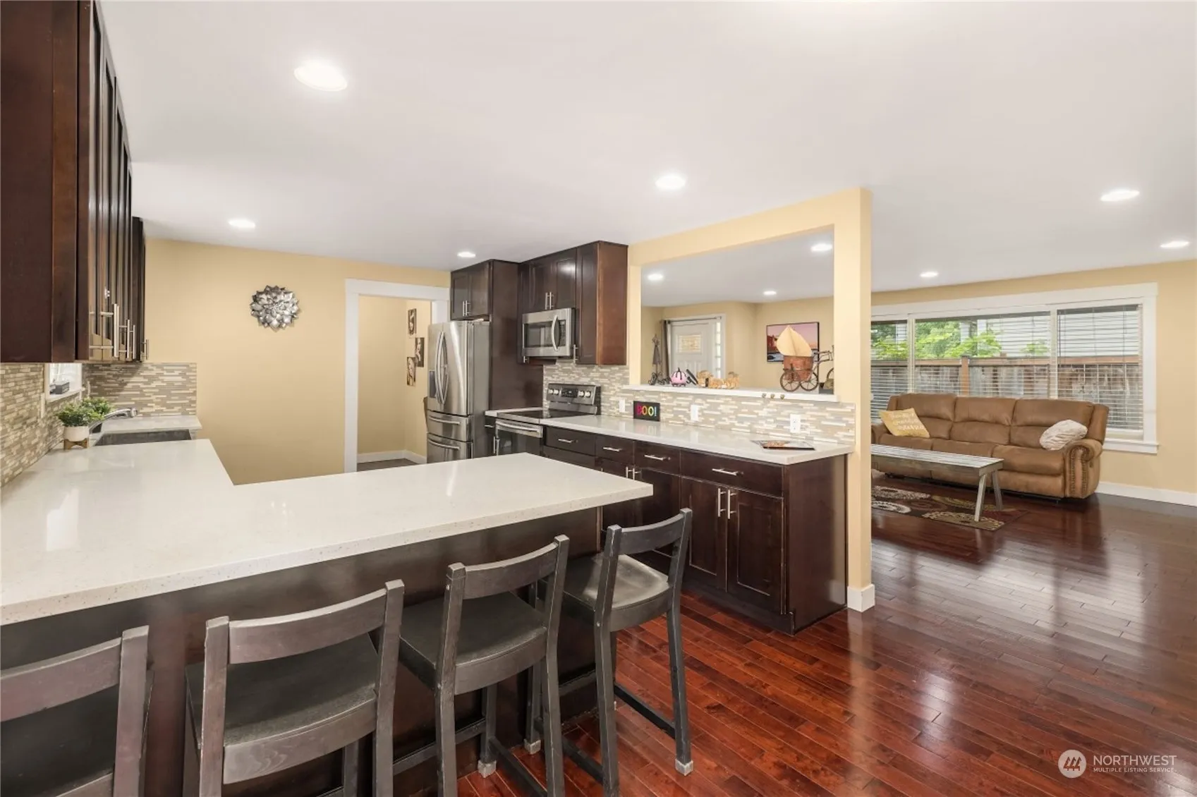 Beautifully renovated 1-story gem boasts 4 bedrooms + 2.75 baths, perfect for multi-generational living. Step inside to an open floor plan w/genuine hardwood floors, modern tiles, quartz countertops, smart lock entry, wood-wrapped double pane windows. The heart of the home, a stunning kitchen, features a 36″ farmhouse undermount sink, SS appliances + a built-in microwave. Relax in the living room, filled in natural light from large windows. The primary suite has a 3/4 baths. Garden space+ plenty of parking spots available. Located in a prime area, a short walk from public transportation, Safeway, Crestview Park. SeaTac Airport, Westfield Mall, and I-5/405 freeways are a quick drive away. The fridge, washer & dryer are staying! NO HOA!