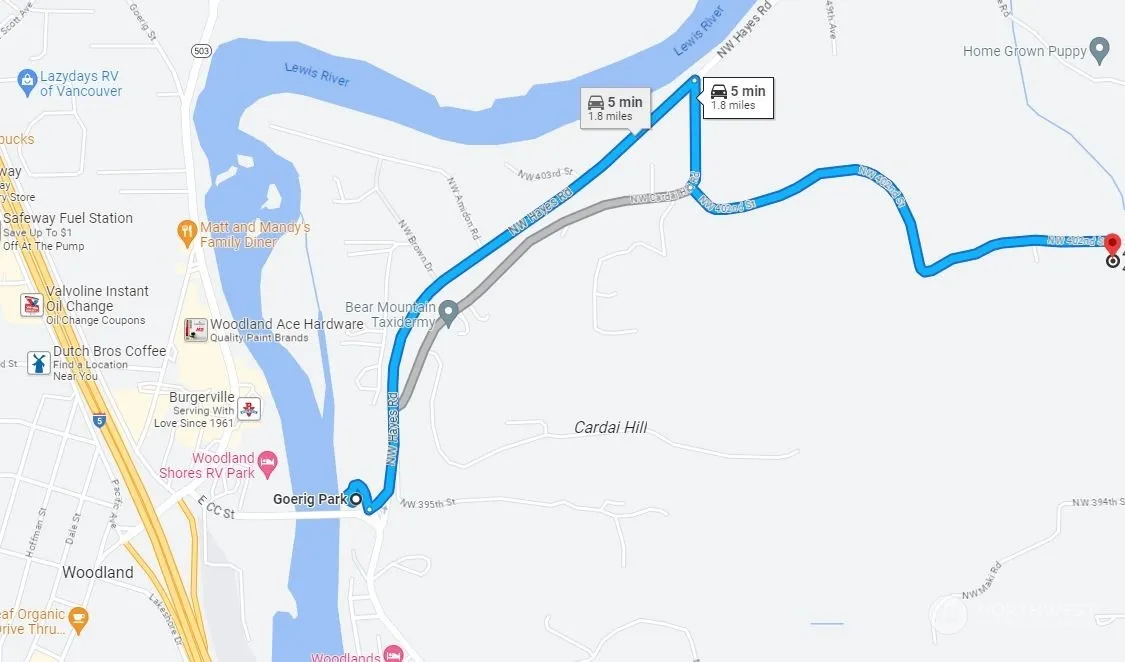 • Directions: Fm I5 - Exit 21; R on Lewis River Rd; R on CC St; R on Cardai Hill Rd; L on 402nd - Last Driveway on Right - use 4101 NW 402nd for GPS