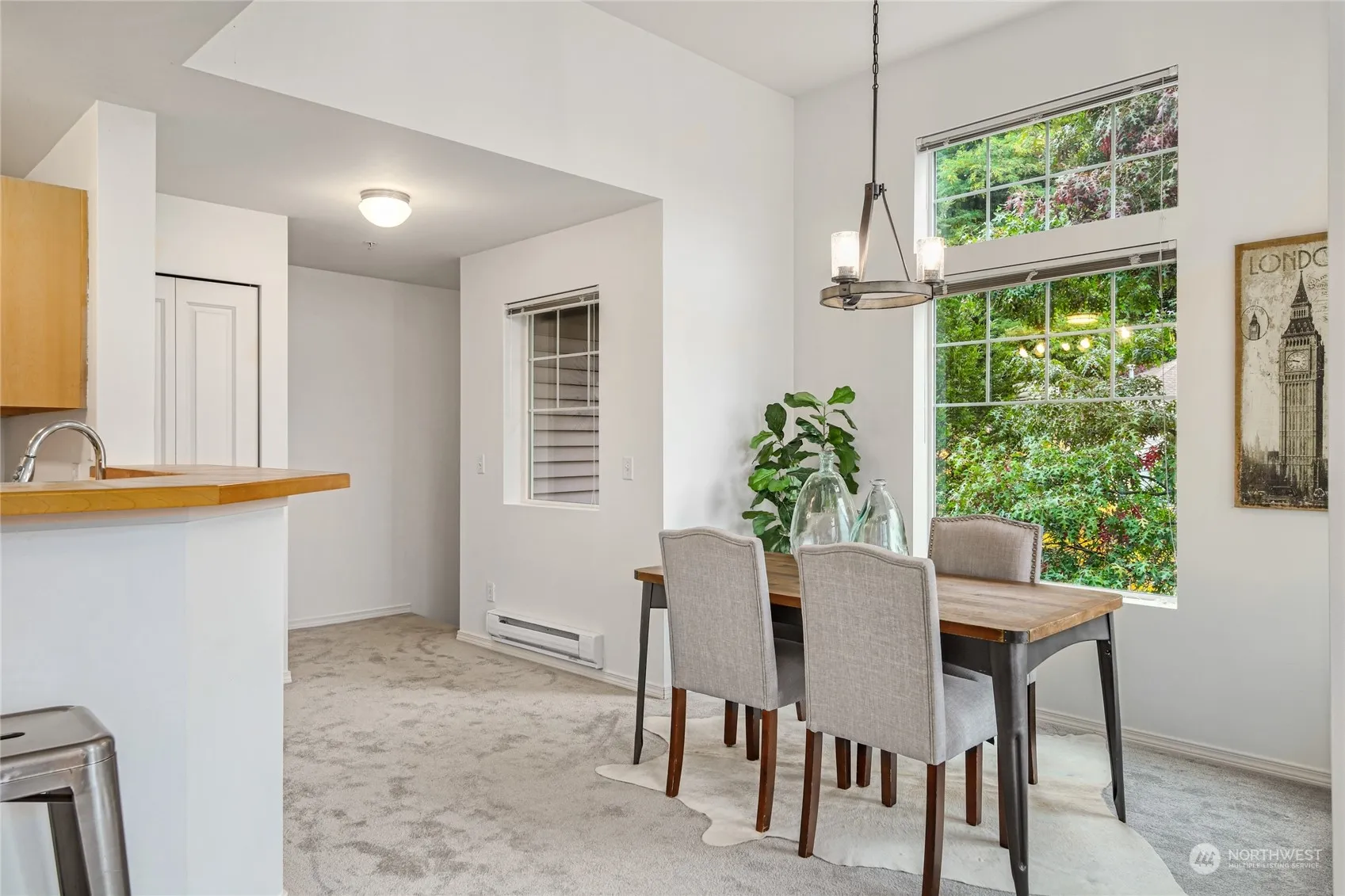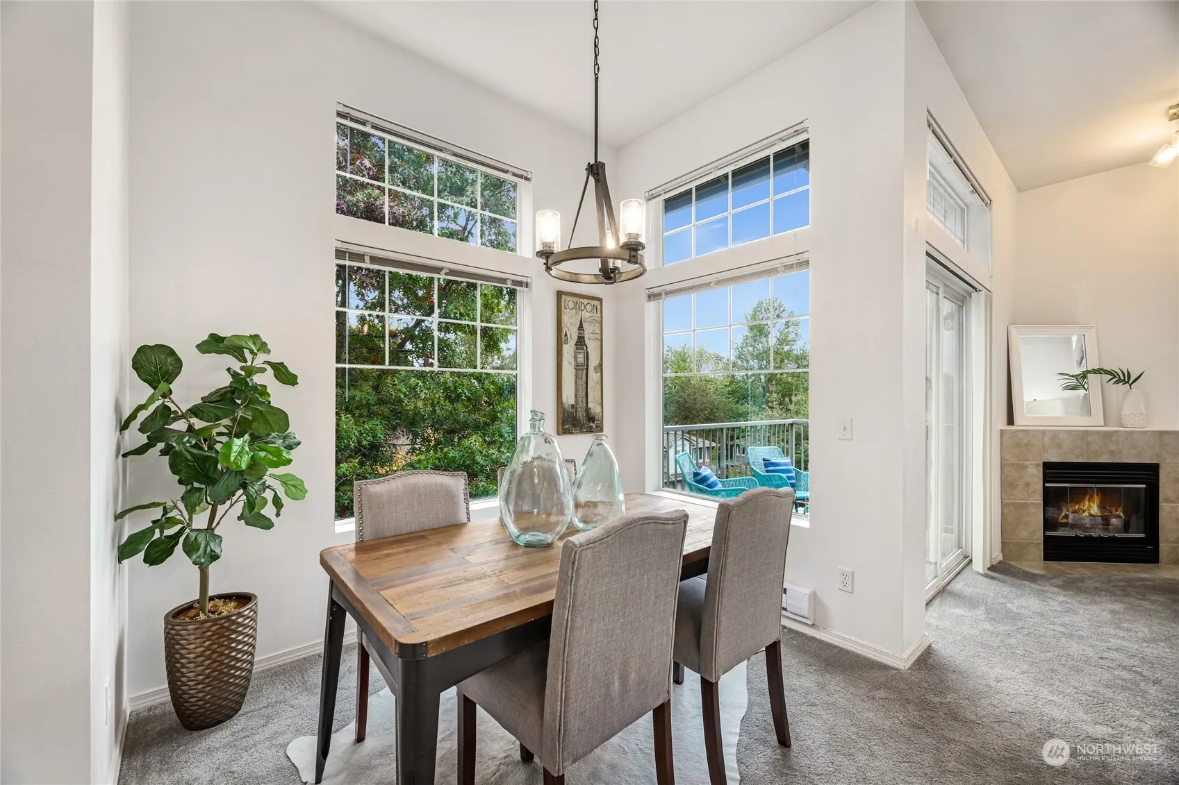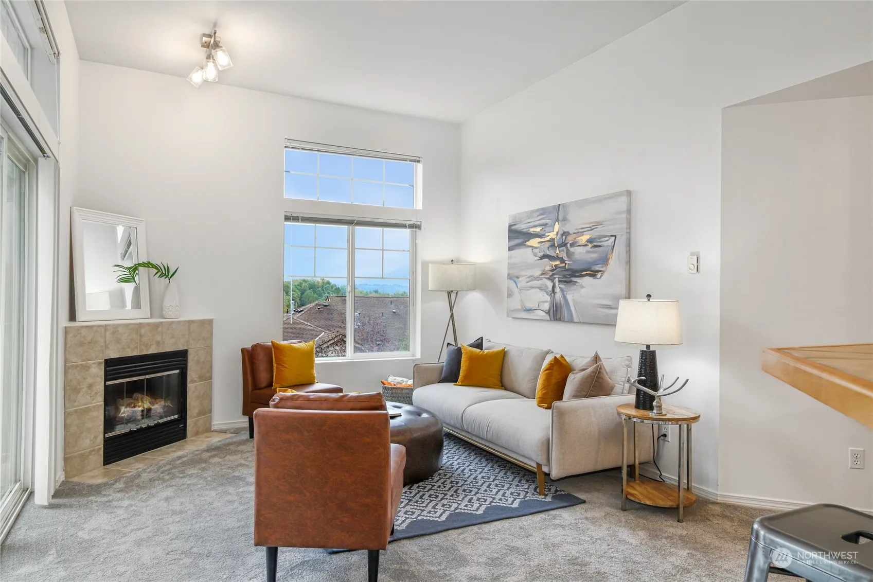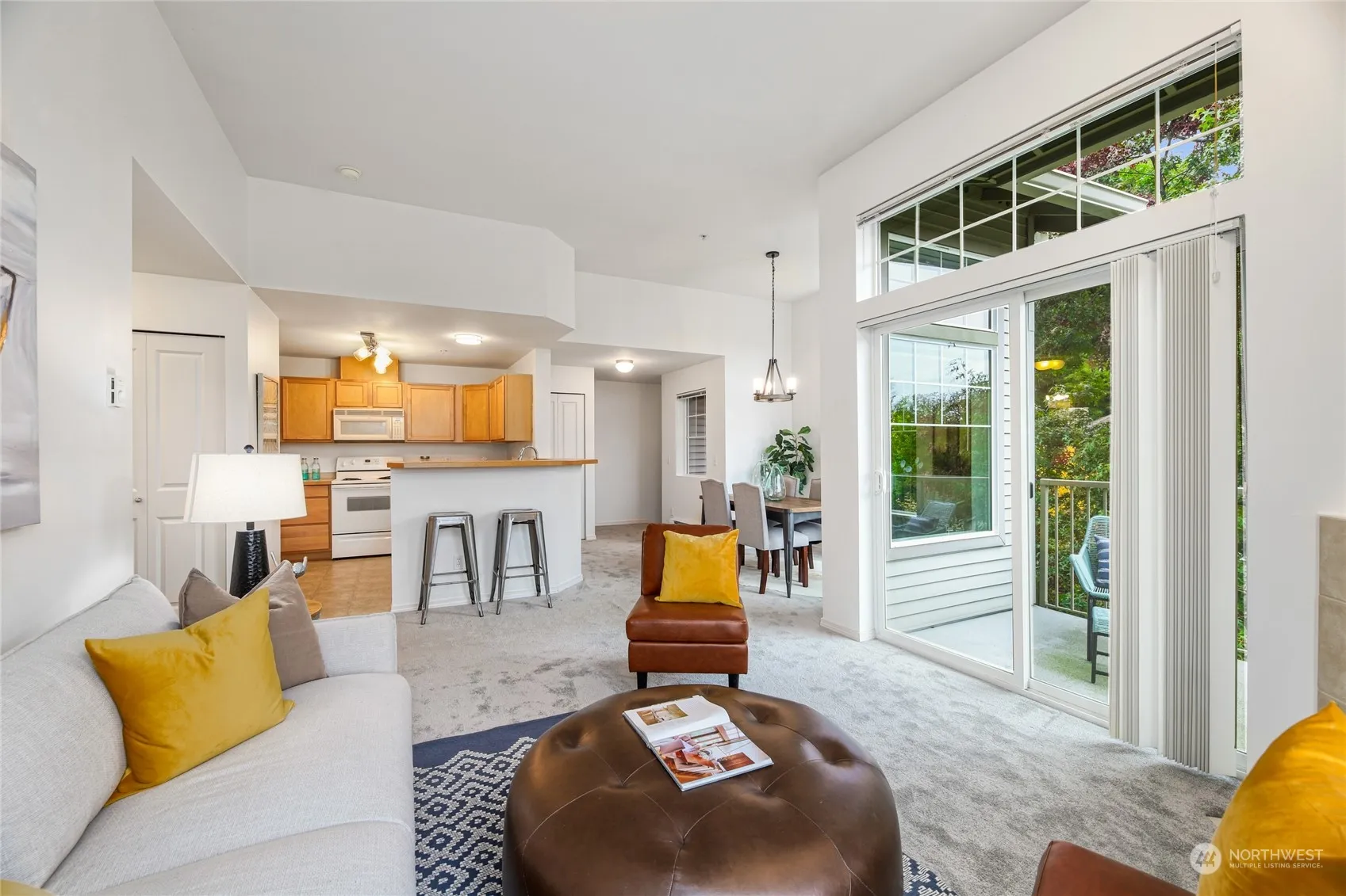 Experience easy living in this exceptional light-filled 2-bedroom top end unit. This serene and private townhome is located in the River Ridge community. It features soaring 10-foot ceilings & a spacious, open floor plan that feels like a single-story home. The bright, spacious kitchen opens to the dining area & family room w/ a scenic view deck. Huge primary bedroom w/ 5-piece bath & walk in closet. Large secondary bedroom & full hall bath. The expansive windows offer stunning panoramic views of Kent Valley & Cascades. Plenty of storage with attached, oversized one car garage. Full sized W/D. New carpet/paint 2022. Easy freeway access, just a 5-minute drive from the airport & Southcenter. Community playground & sports court. Low HOA dues.