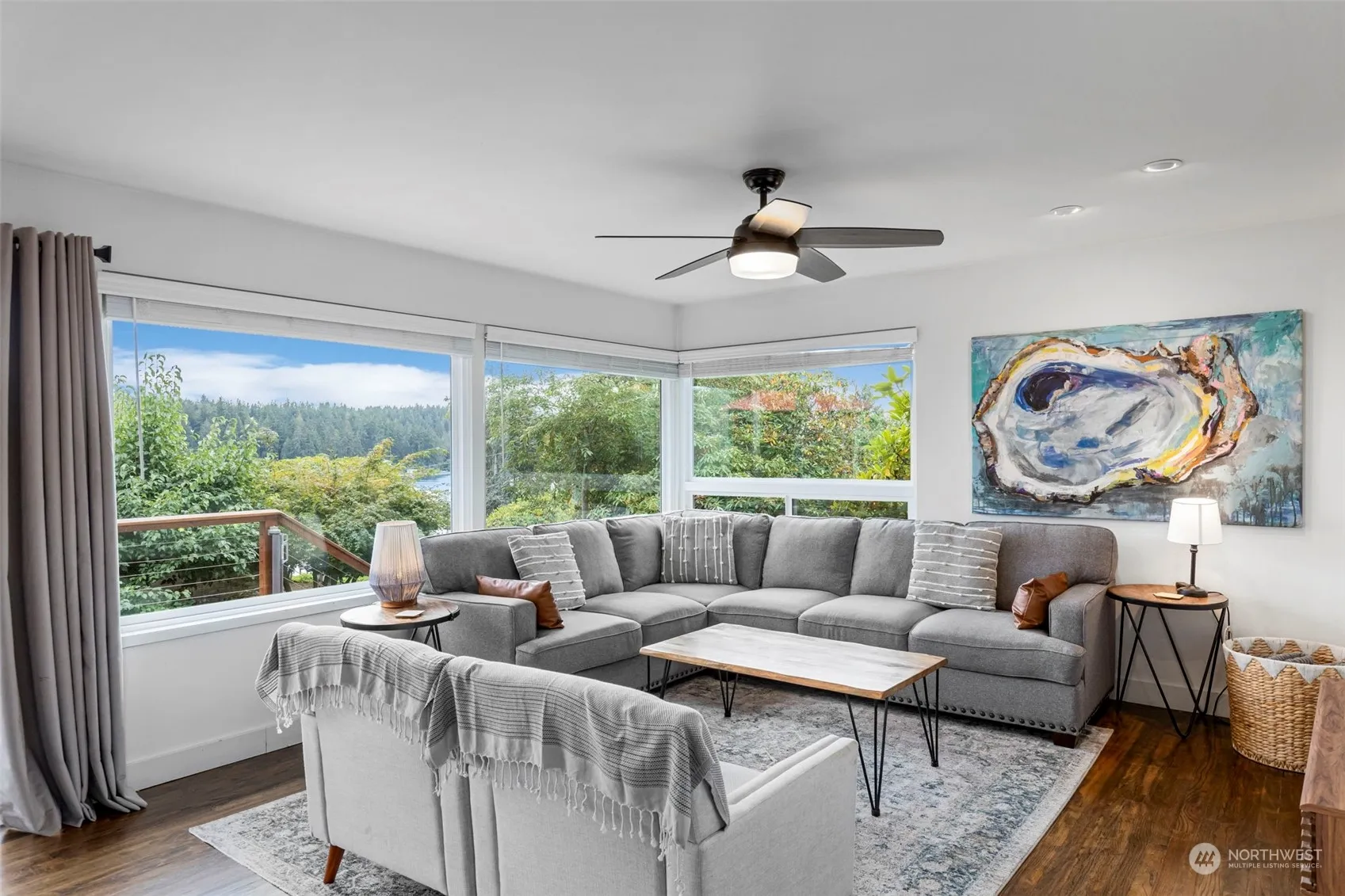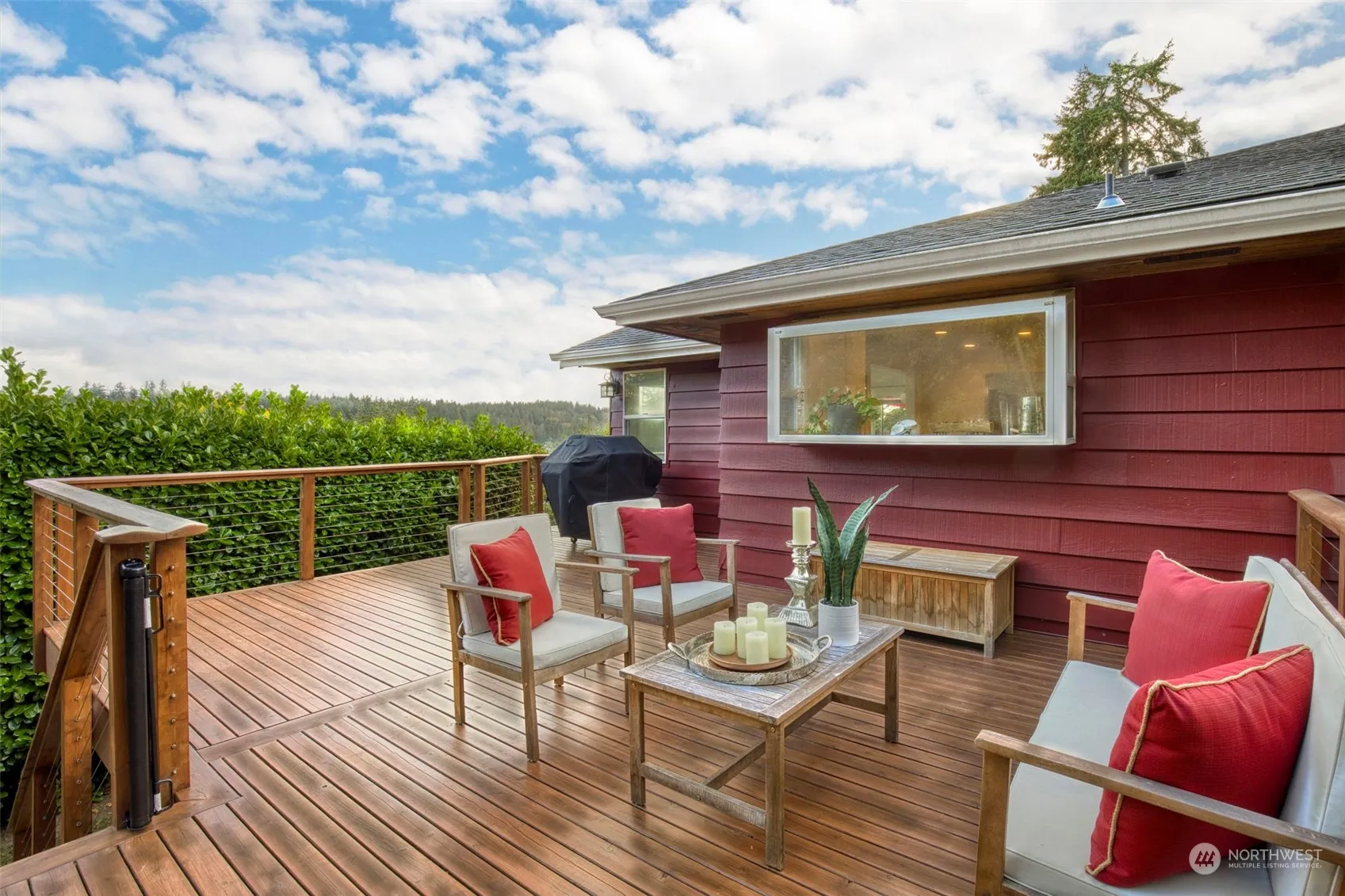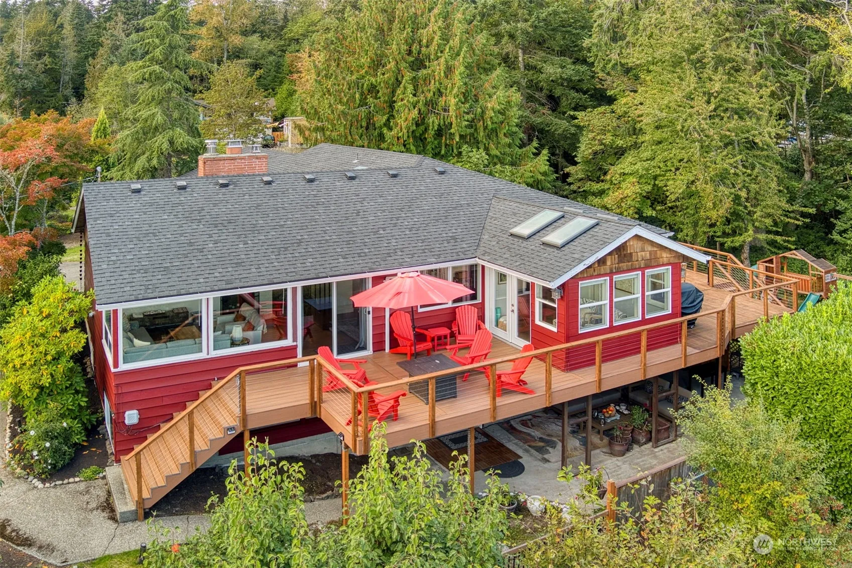Beautiful, sun-drenched, VIEW home that has tremendous flexibility as a either a large single home or investment rental as duplex. Thoughtfully updated home features main floor master, office, hardwoods, sun room, skylights & Southwest exposure overlooking the Sound. Generous outdoor spaces for entertaining, level backyard bordered by woods and expansive deck and patio. Remodeled lower level has new kitchen, bathrooms and separate entrance. Situated in a quiet beach community; 1 block away from a sandy beach, waterfront park, and an athletic court. Home served as successful vacation rental- financials available.
