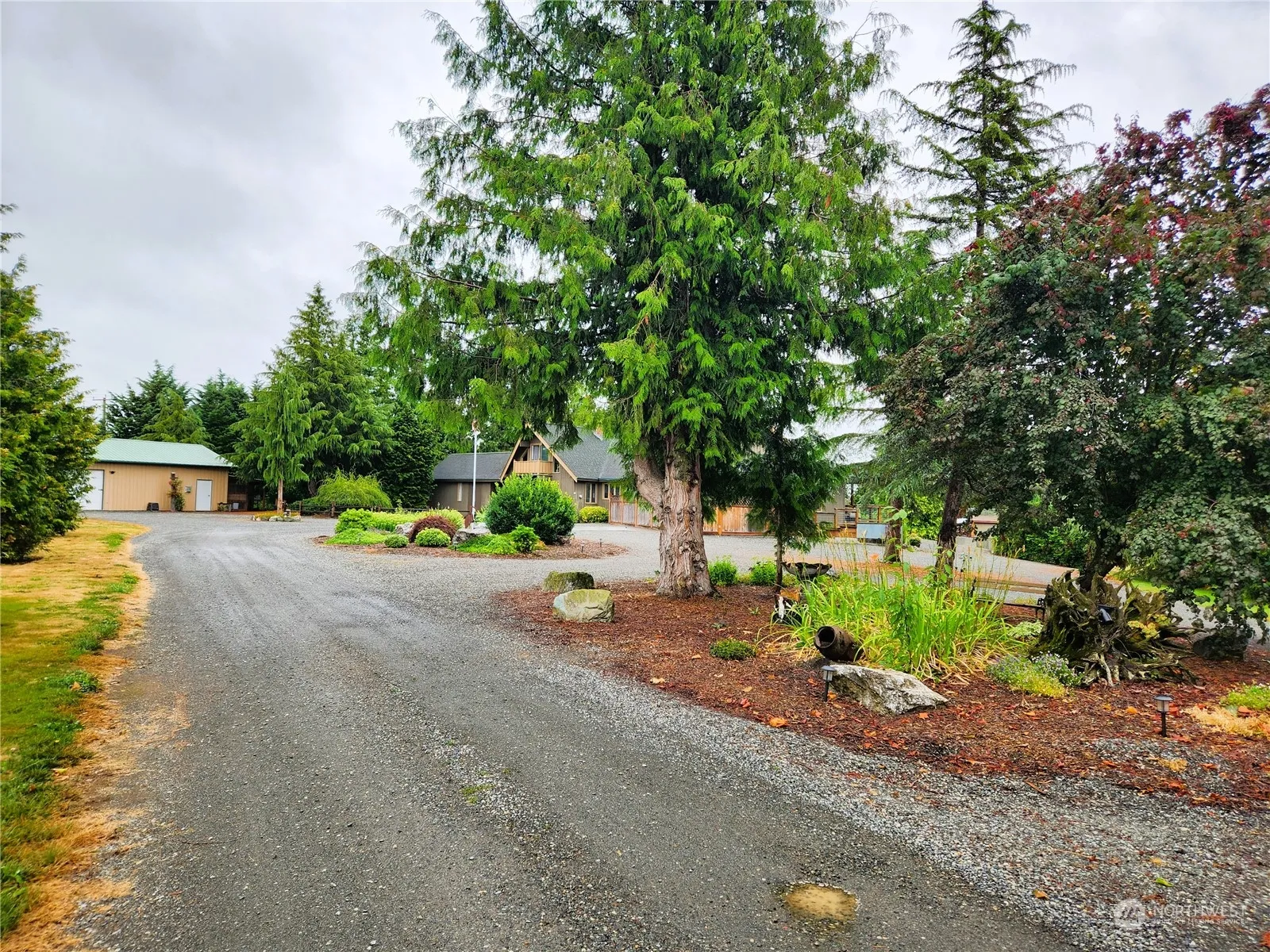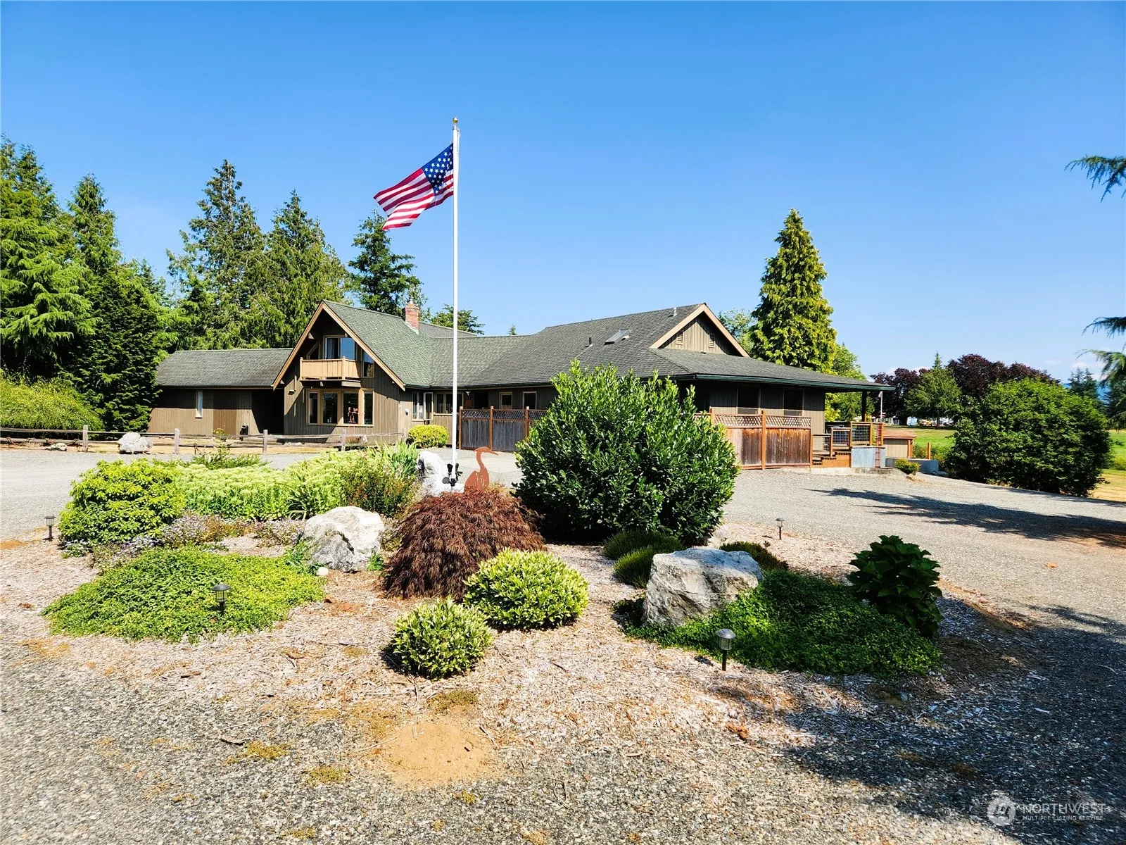 A little of everything: Nice home w/1 story living & Mt Baker view featuring tons of light, wood lined vaulted ceilings & centerpiece large brick fireplace, bright open kitchen & attractive new primary bathroom on acreage w/heated shop. Home has a very nice approved Accessory Dwelling Unit & is located on a long private drive in popular Mid County Meridian area just minutes to Lynden & Bellingham. Wonderful flat grounds, lots of decking, big slab for Basketball, Pickleball, Tennis — take your pick. Additional large Lean to shop for grounds equipment w/secured space, greenhouse & garden sheds along w/pleasant water feature. Lower level of home has previously been used as a mother in law suite. special property w/flexible living options.