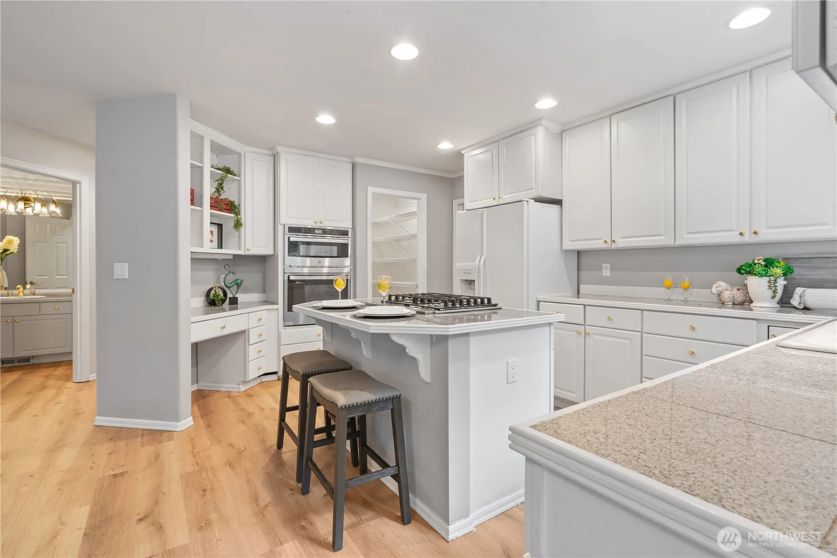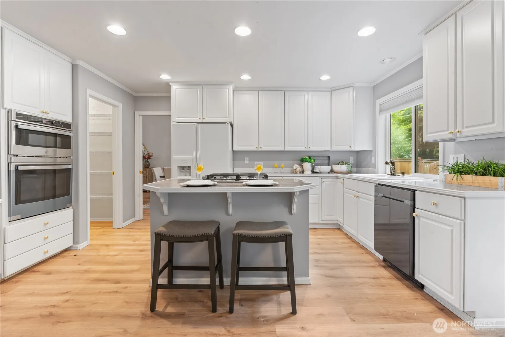 Bright and inviting home in a peaceful setting with a spacious private yard and perfect patio for entertaining. Step inside to a grand entry with vaulted ceilings in the living and dining rooms. Recently updated with fresh interior and exterior paint, brand-new waterproof laminate flooring, carpet throughout, and a new wall-mounted oven and microwave combo. The home also features a new 30-year roof, a fabulous kitchen with island, workstation, nook. Additional highlights include rounded corners, a main floor office/den, laundry, and a beautiful, rounded staircase leading to the master suite with a luxurious 5-piece bath and walk-in closet. Enjoy the comfort of fireplaces in both the living and family rooms;Issaquah School District.