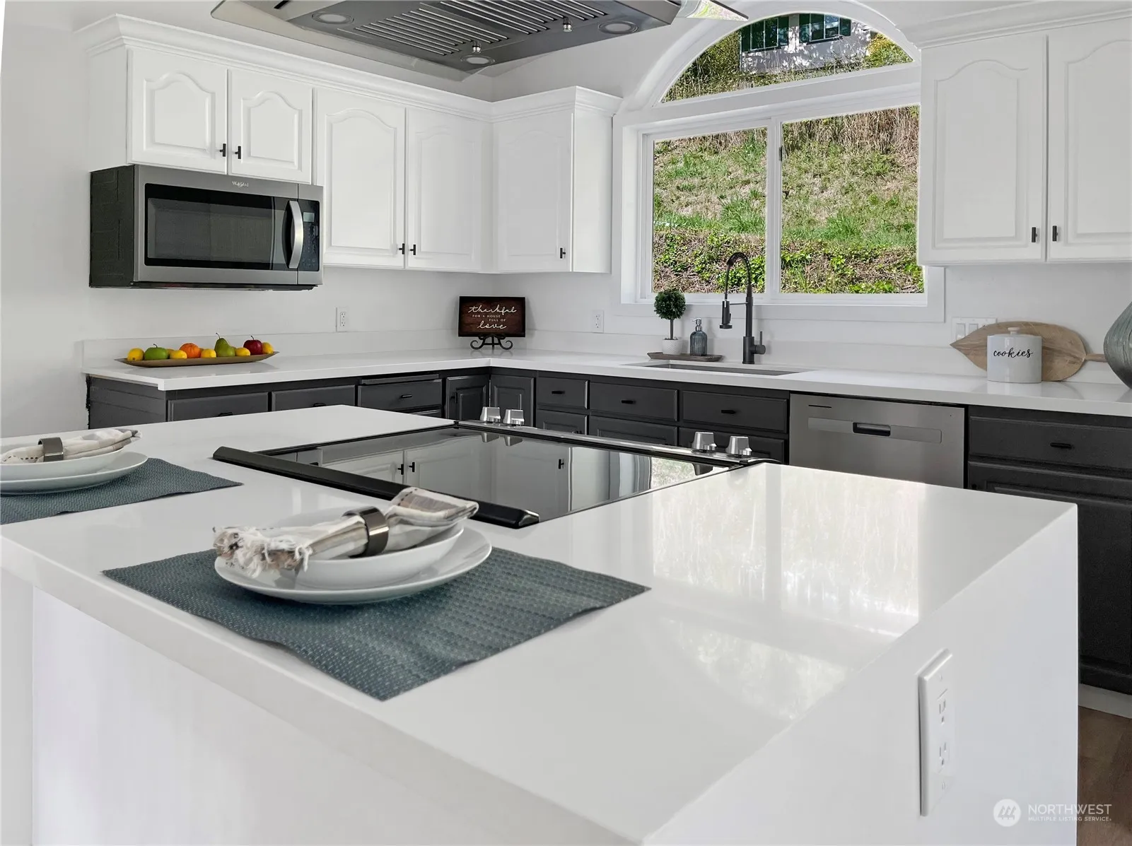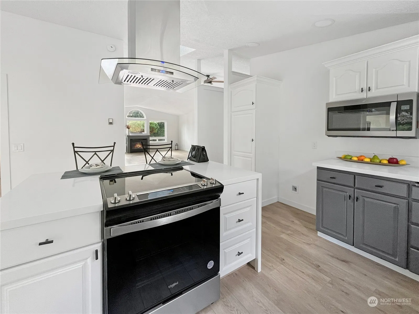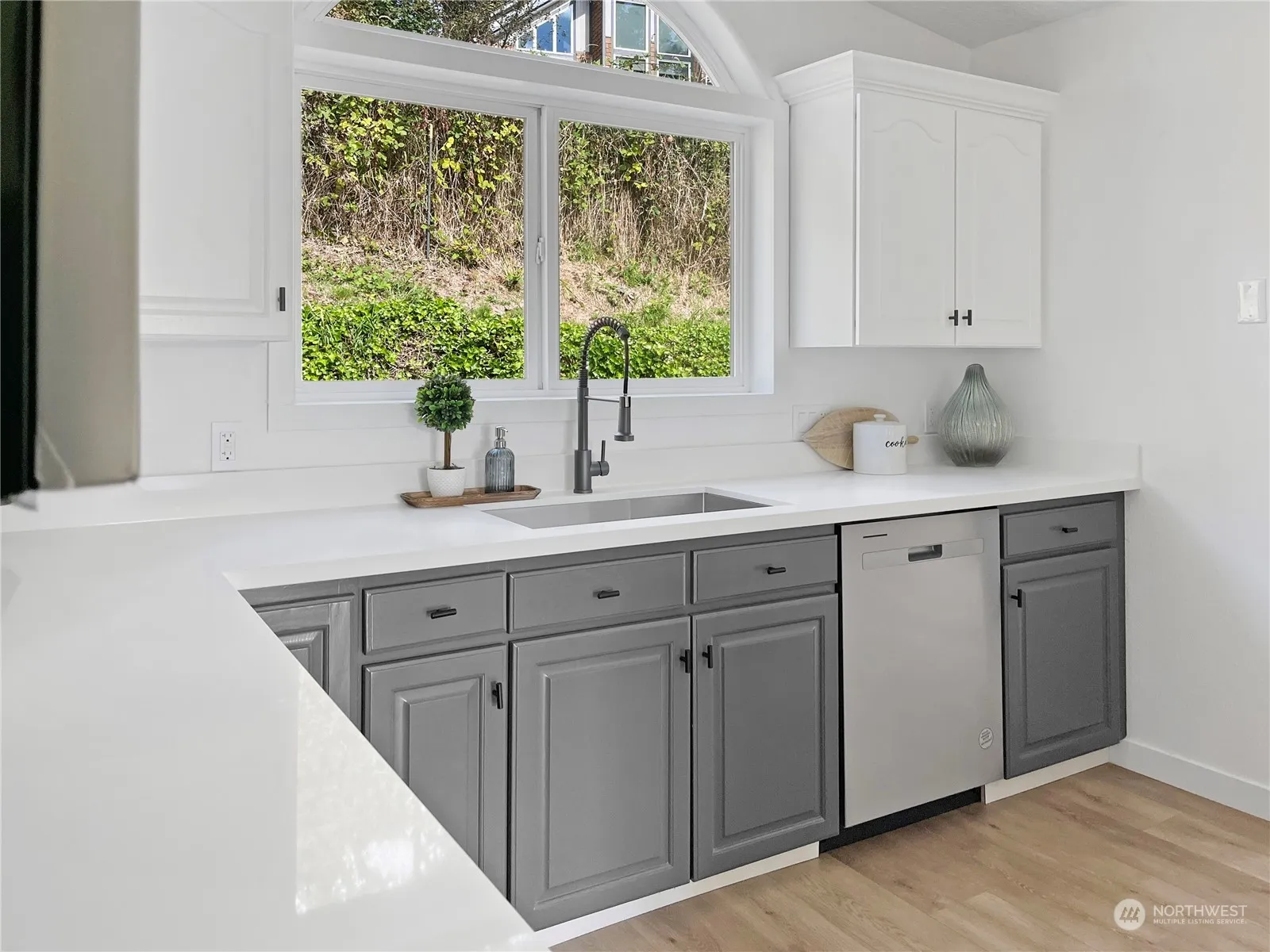 Modern home with a spacious living room and vaulted ceilings. Large windows and skylights fill the the entire home with natural light. Updates include new flooring throughout the home, 2 updated bathrooms, new interior/exterior paint, new quartz countertops, and new appliances. Kitchen features a quartz waterfall kitchen island and opens to dining room area. Primary bedroom has a powder room, tile shower, and double sink vanity. Plus, plenty of storage space throughout the home. Entire home has vaulted ceilings throughout it and has a peek-a-boo view of the valley. All this on a quiet dead-end street.