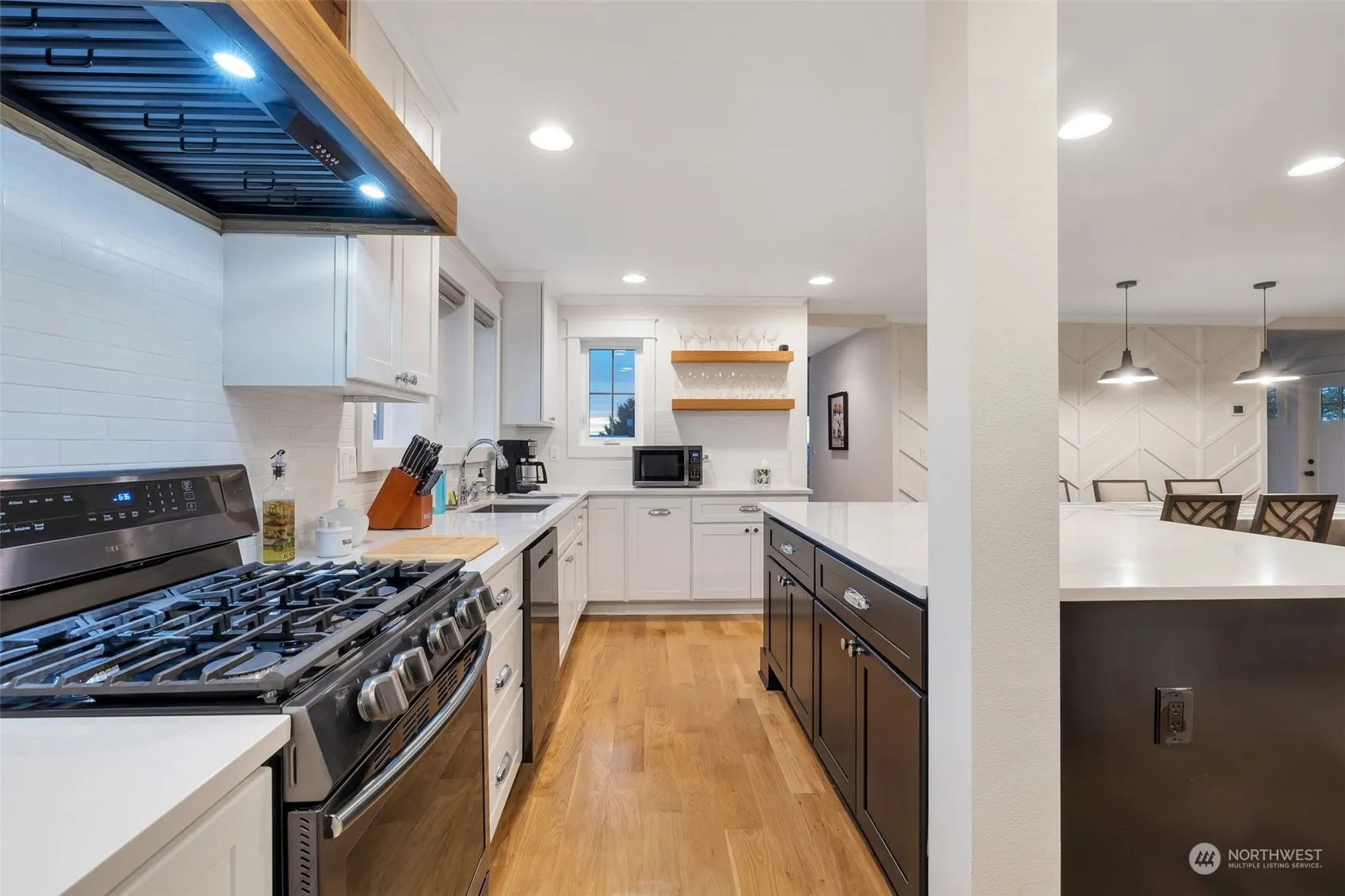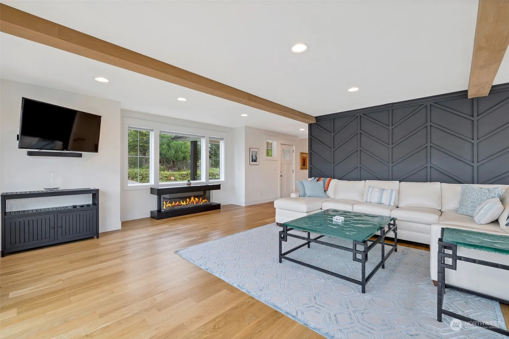Light and bright modern craftsman farmhouse with Sound views from every level. Hardwood flooring, amazing open floor concept with generous view windows, spacious dining area with cozy gas fireplace, open kitchen with slab quartz counters, prep island, stainless appl., gas range, white cabinetry & large walk-in pantry. Powder room. Lower bonus room and storage. High quality finishes with custom mill work, built-ins, shiplap & herringbone walls. Upper floor large Primary Suite with vaulted ceilings and exposed beams, in-suite 5-piece bath with double shower heads & soaking tub. Three additional bedrooms, full-bath & laundry. Detached 2-car garage. Beautiful landscaped yard. Walk to waterfront, close to shops, conveniences, and restaurants.