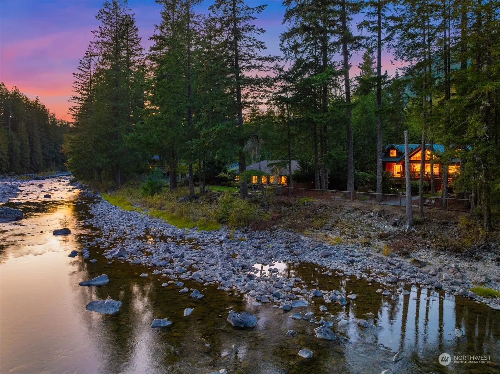 Custom riverfront luxury log home w/ 90 ft of low bank river frontage. Vaulted ceilings & oversized windows allow the river view to be the focus throughout the house & sprawling deck. All naturally light infused thanks to 2 stories of southern facing windows. Impressive 15’ river rock fireplace. Chef’s kitchen w/ luxe granite, dbl ovens & Thermador range. Wake up to river views from the main level primary w/ cozy river rock fireplace. Upstairs has 2 more bedrooms, a loft space & multiple WFH areas w/ river views. Manicured, level, fenced yard. 3 car garage w/ extra storage, boat & RV parking, room for all your toys. Wired for generator. Mins to I90 or town. Luxury living w/easy access to endless hiking & outdoor adventures! Preinspected.