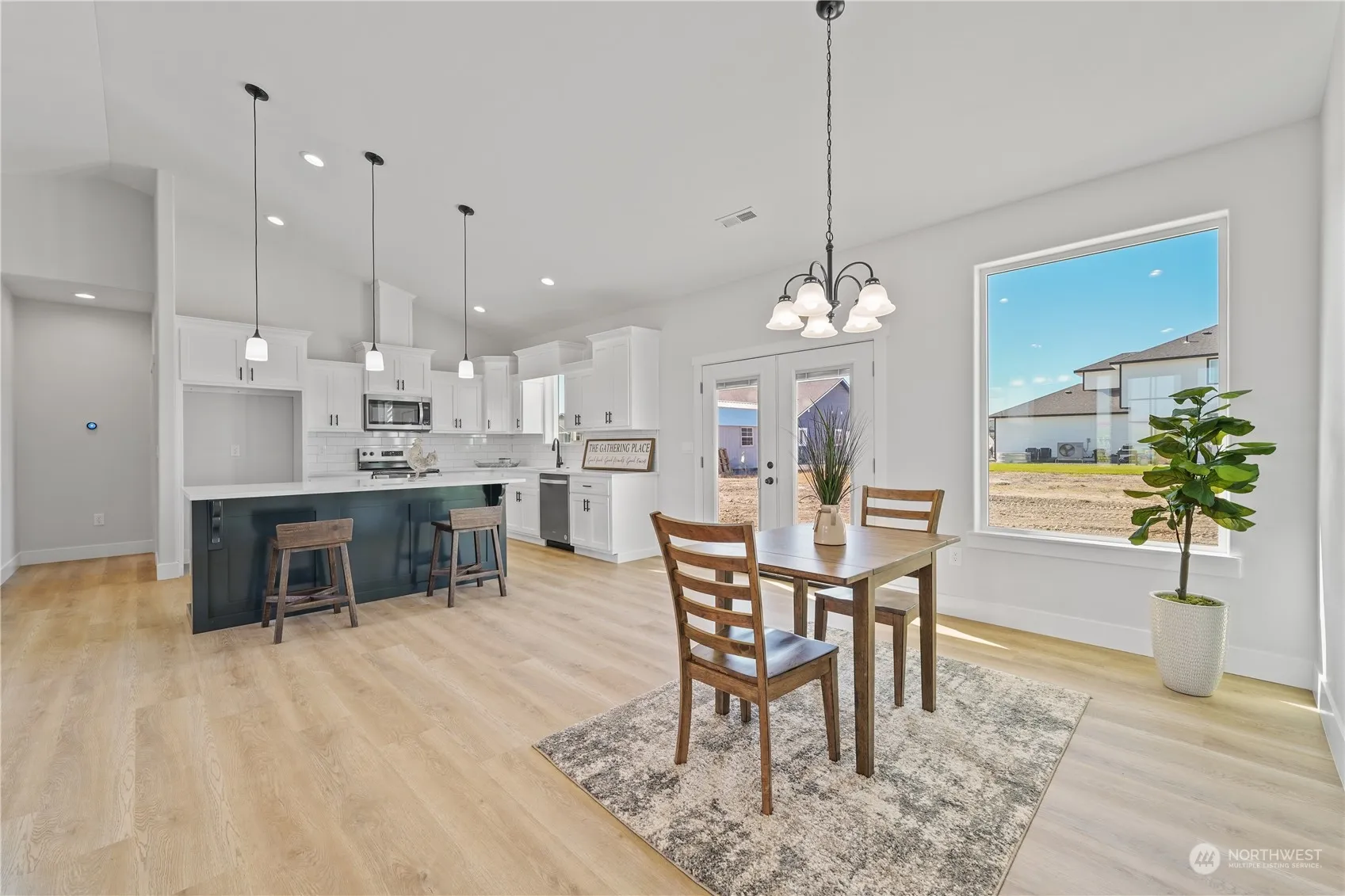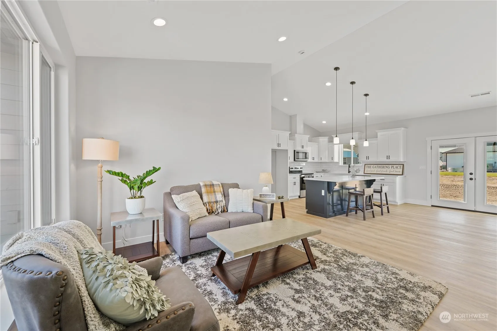 Special features of this home will make coming home from work a pleasure! The front glass door with sidelights are very inviting. Beautiful soft-close cabinet drawers, black accents & large island w/ quartz counter tops speak quality. Tile full height backsplash, stainless steel appliances & beautiful French doors w/ built-in shades are gorgeous. Wonderful windows throughout let our sunshine in to brighten your day. Primary bathroom has shower w/ barn door rain glass doors for your enjoyment. Finished double car garage & great utility room sink are extra pluses. 9,583 sq ft corner lot is waiting for you to add your personal touches to make this your dream home. Enough room for an ADU or shop? Call today!