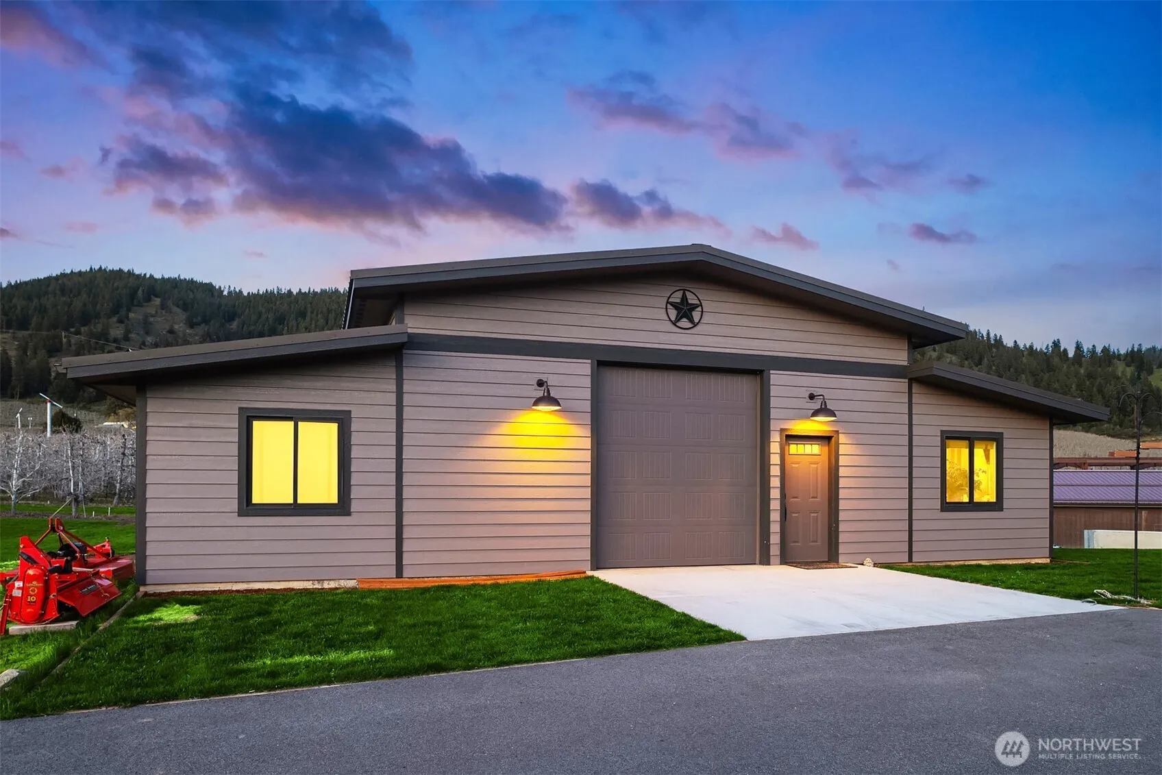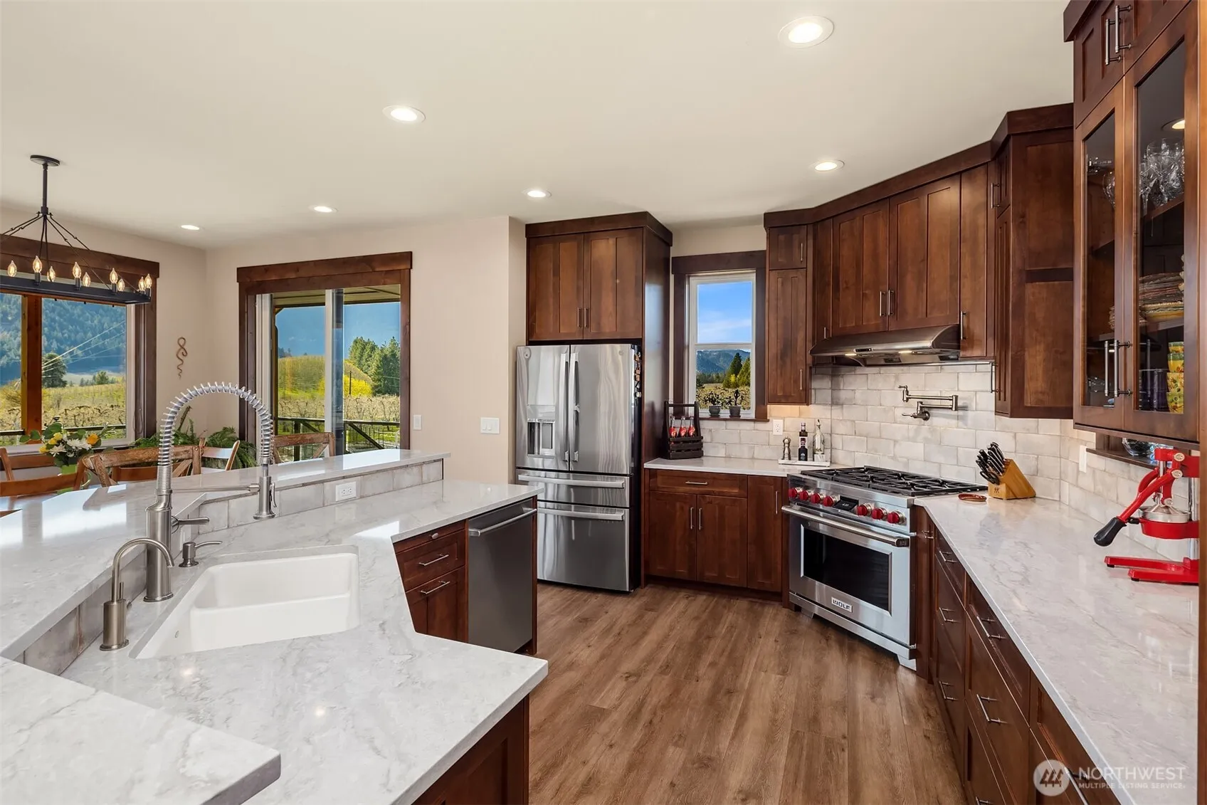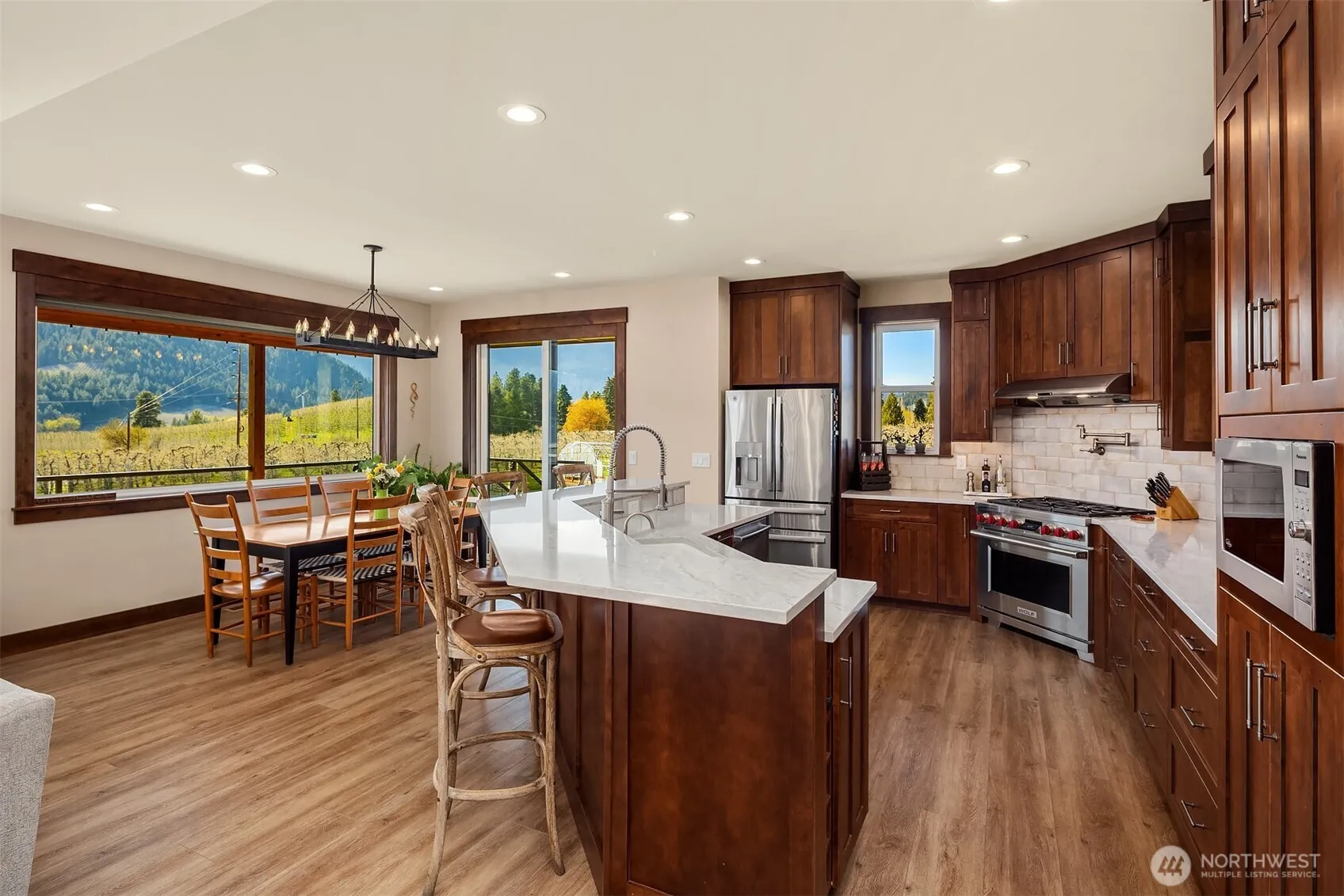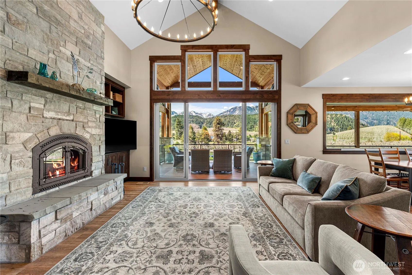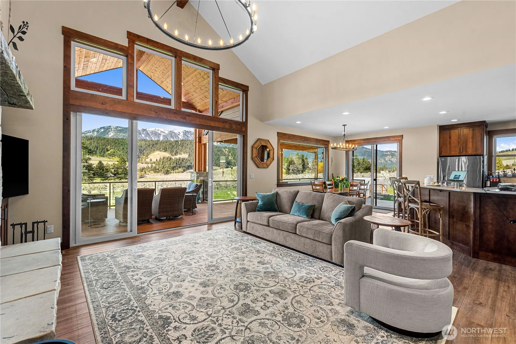 Stunning rustic modern home with panoramic views of the Enchantments, surrounding mountains & orchards—8 minutes to central Leavenworth. Main home offers vaulted ceilings, fireplace, chef’s kitchen with Wolf range, quartz counters & custom cabinetry. Spacious primary. Luxurious en suite has walk-in tile shower, heated floors, soaking tub & walk-in closet. 670 sq. ft. upper deck w/ amazing views. Lower level rec room, 2 bedrooms, storage room, wine cellar. Private pool oasis has outdoor shower & 1500 sq. ft. patio w/hot tub. Gardening spaces w/irrigation & auto watering. Attached garage & detached 960′ workshop w/office & bath. Separate short term rental home earns $62–$66K/year. Perfect for multi-generational living or extra income!
