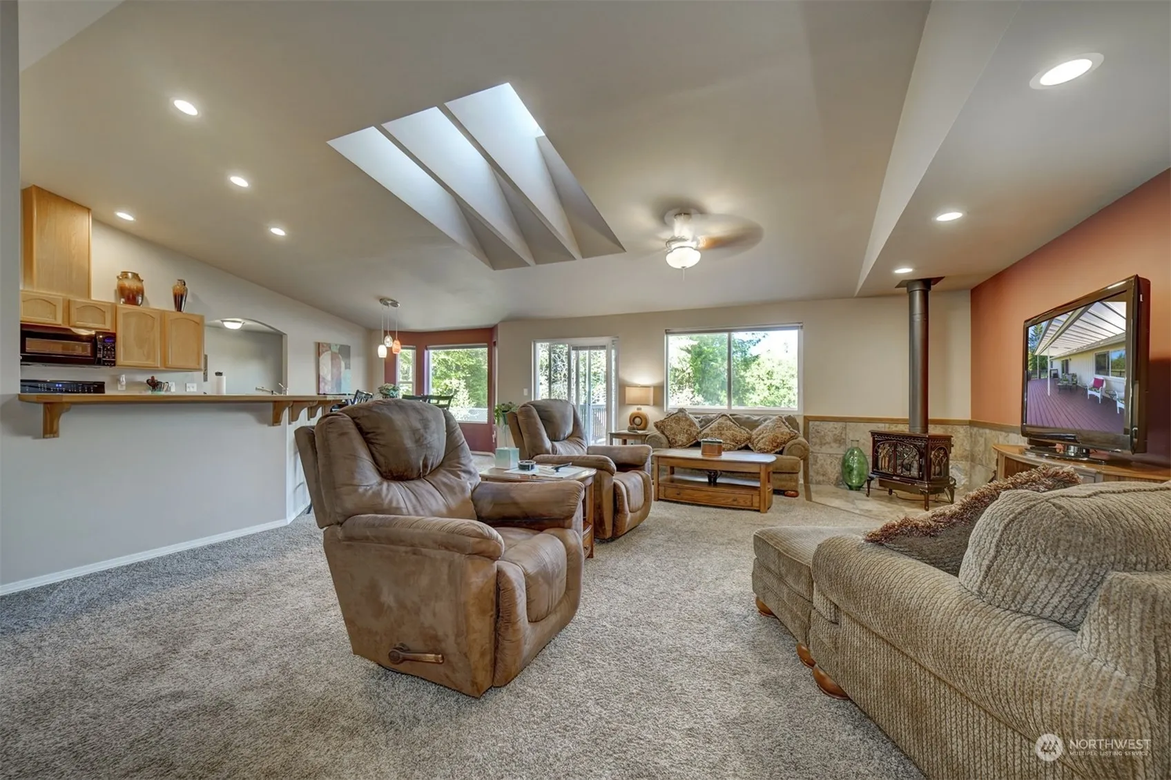 Rare one level rambler on 4.97 acres. Inviting Great room w/ cathedral ceilings, skylight, gas fireplace & slider to deck. The property is setup w/ RV dumps to septic (4 Bdr), back deck has fenced area- great for play, pets & some of the fruit trees, 2 car garage and is located on dead end road minutes to town.