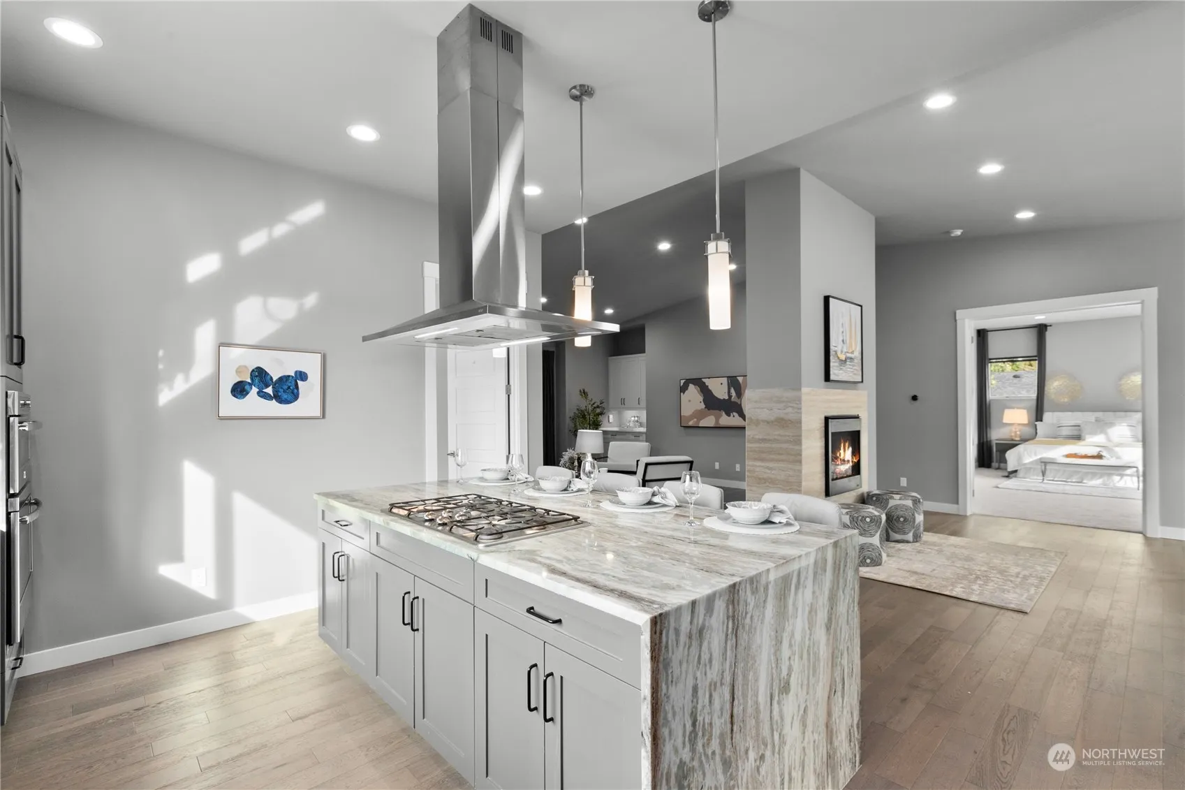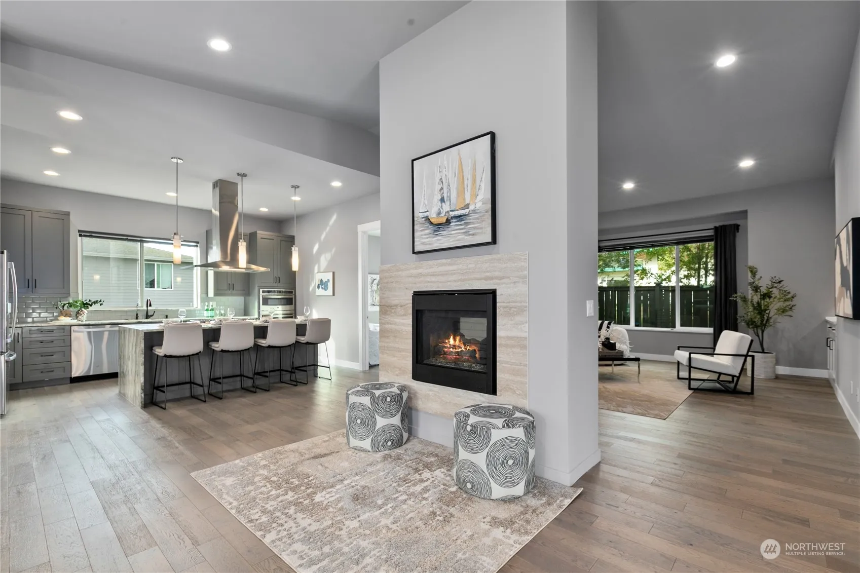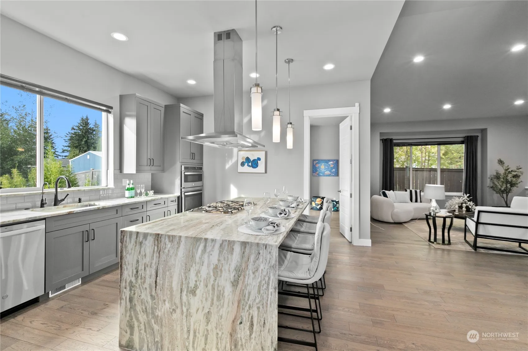 Welcome to this stunning 4-bed, 3-bath contemporary home in Mountlake Terrace. The upper level features a chef’s kitchen with waterfall granite countertops and stainless steel appliances, a wet bar, and a light-filled dining room that opens to a deck for outdoor dining. The great room, anchored by a gas fireplace, is perfect for relaxation, and the primary bedroom includes a luxurious 5-piece ensuite. The lower level offers multigenerational living with flexible spaces, including 2 bedrooms/office. Enjoy the private, fenced yard with a patio and play area. Conveniently located just 5 minutes from I-5, the light rail station, and nearby amenities, and only 20 minutes to Seattle. Edmonds School District. Pre-inspected and ready to move in!