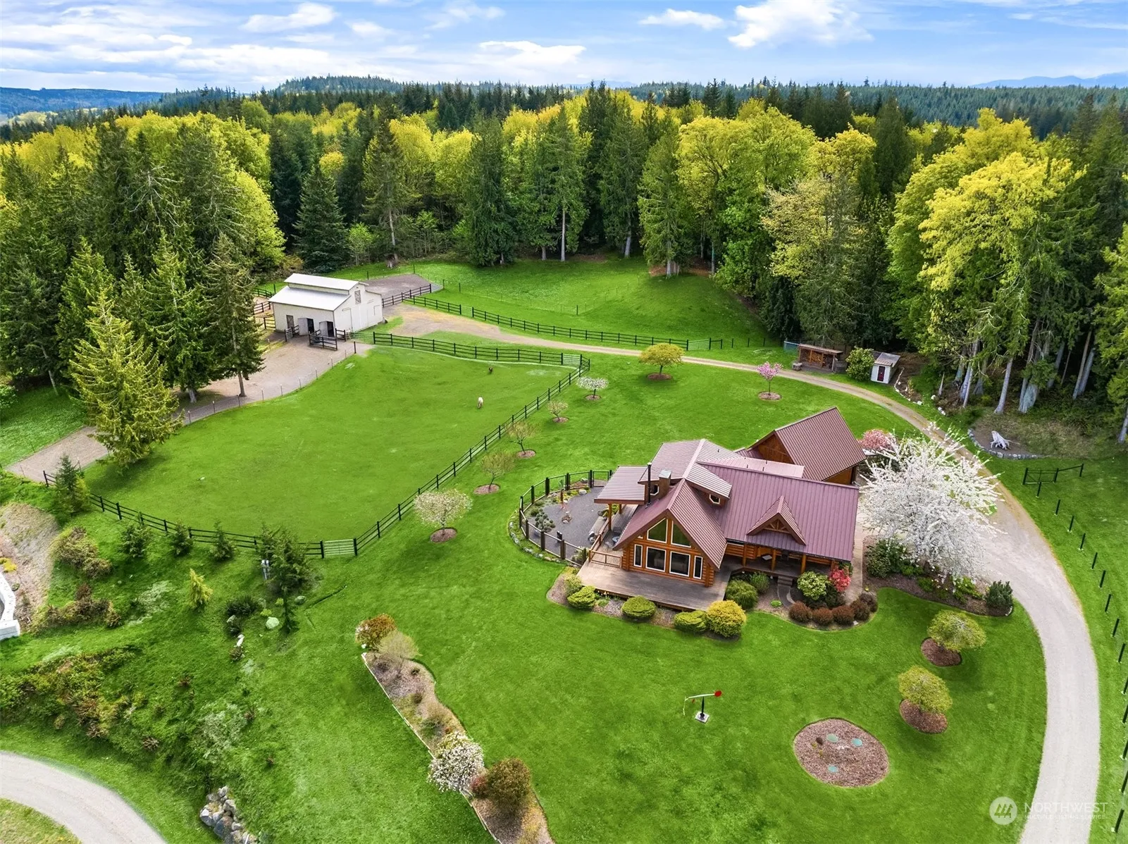 Welcome to paradise atop the hill, overlooking Chimacum Valley. An immaculate home on 6.43 acres, ready for a new owner. Vaulted ceilings & breathtaking views of Mt. Baker W/floor-to-ceiling windows, granite countertops, a farm sink & Heartland appliances. A wood stove & beautiful cherry floors W/radiant heat. The primary bath has marble & basalt details, a Japanese soaking tub & a walk-in closet. A wrap-around Purple Heart wood deck, A Zen-style fenced garden, a covered patio. The detached 2-car finished garage offers a breezeway to the home & has a room above. There’s peach, apple, and cherry trees, a 4-stall barn W/loft, 7 paddocks, a chicken coop, wood storage, a custom round pen, wood rail fences & more; just minutes from Port Townsend