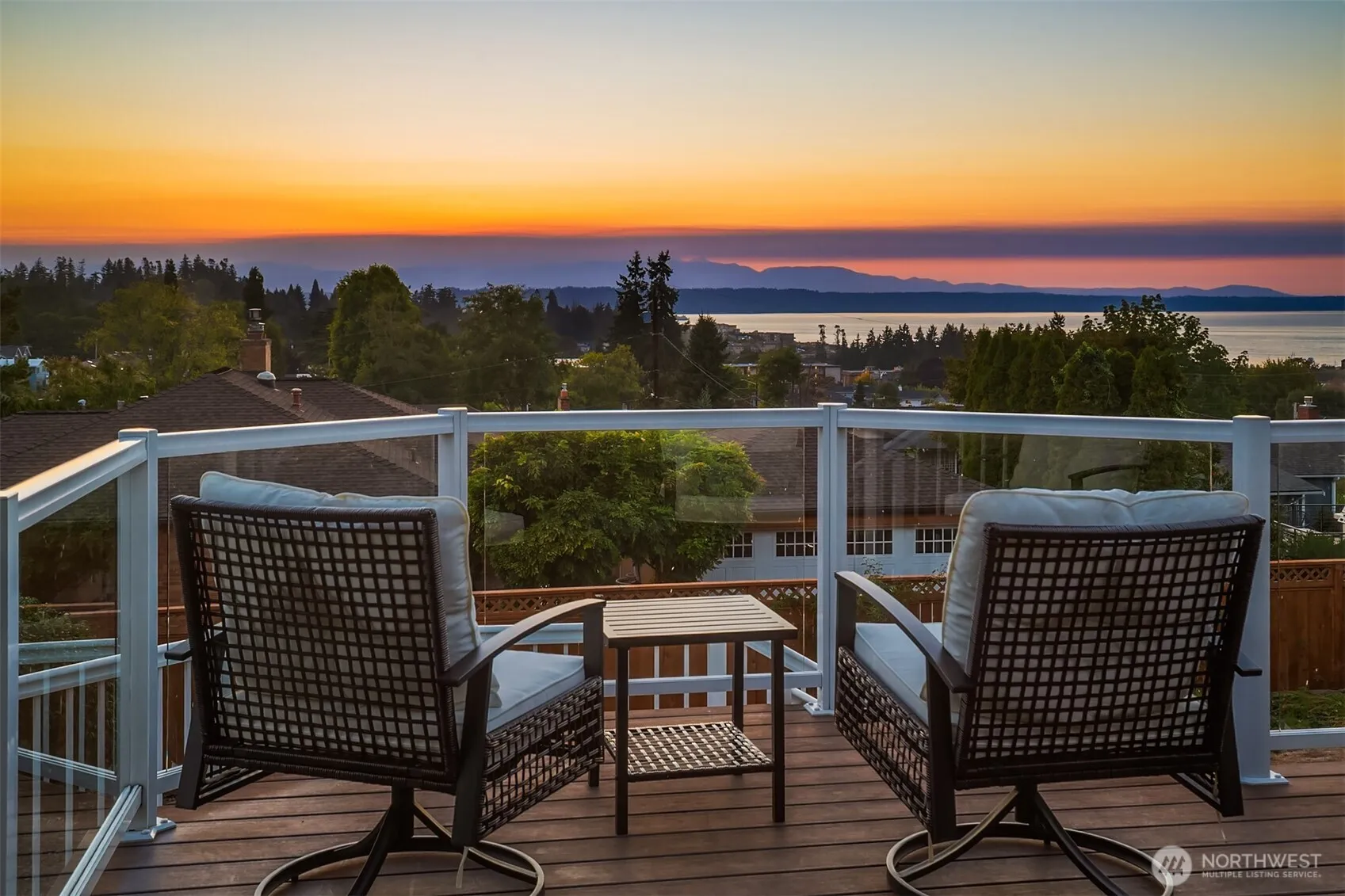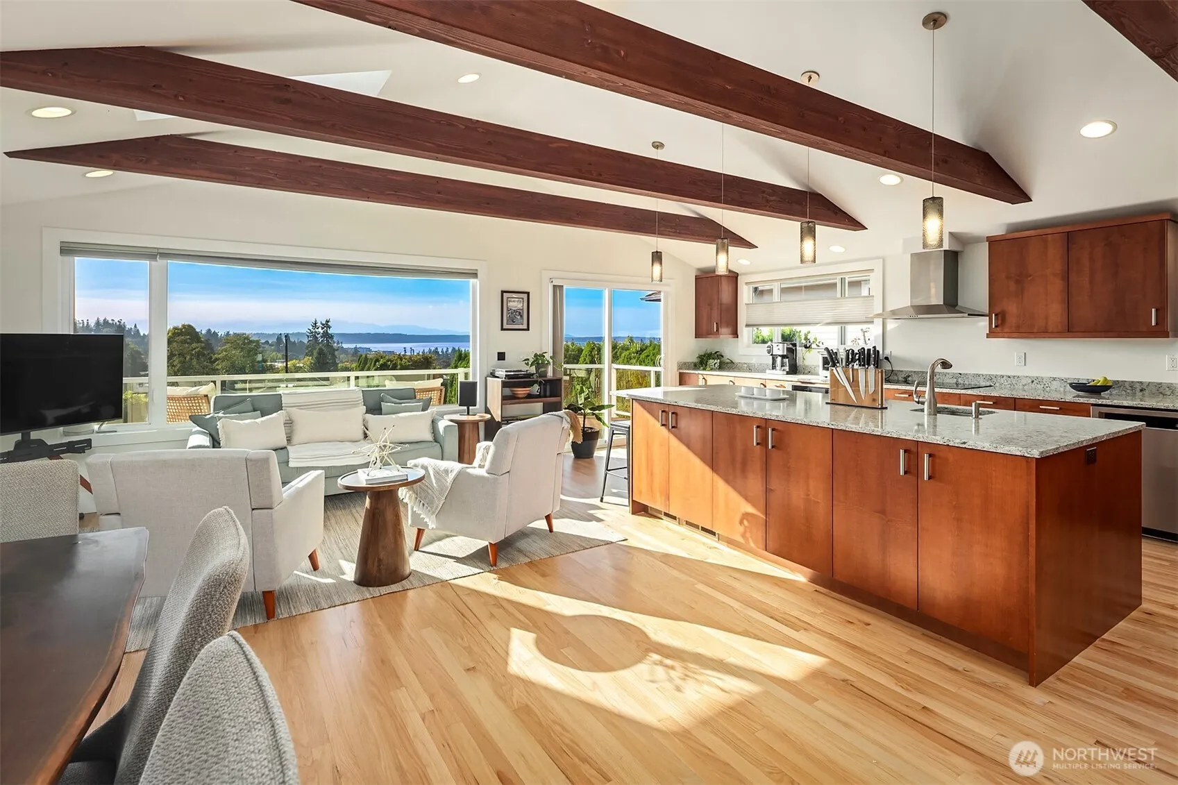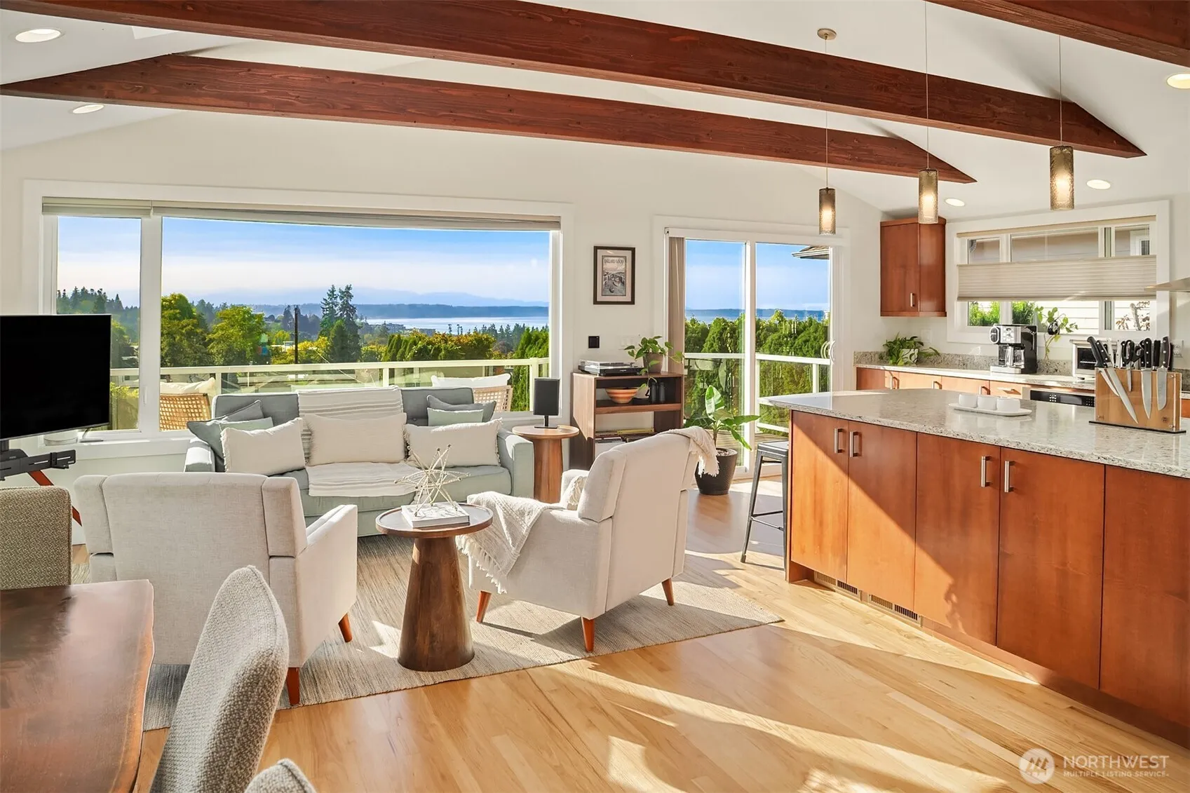West-facing Puget Sound & Olympic views from this 5-bed mid-century home w/ updated contemporary finishes in the Edmonds Bowl. Open-plan great rm w/ soaring cathedral ceilings & exposed wood beams. Walls of windows frame sunset vistas. Sleek entertainer’s kitchen w/ large granite island, rich wood cabinetry offering abundant storage, all SS appliances & stylish lighting. Seamless indoor-outdoor living w/ expansive view deck w/ glass railing. 4-beds up, while main offers a 5th bed/flex space. Spacious lower-level bonus w/ views. Primary Suite w/ dual closets & ¾ en suite bath. Huge utility rm doubles as extra storage. Hot tub. Sustainable 9.6-kW solar array. Welcoming flagstone entry & mature landscaping. Alley access. 2-car detached garage.