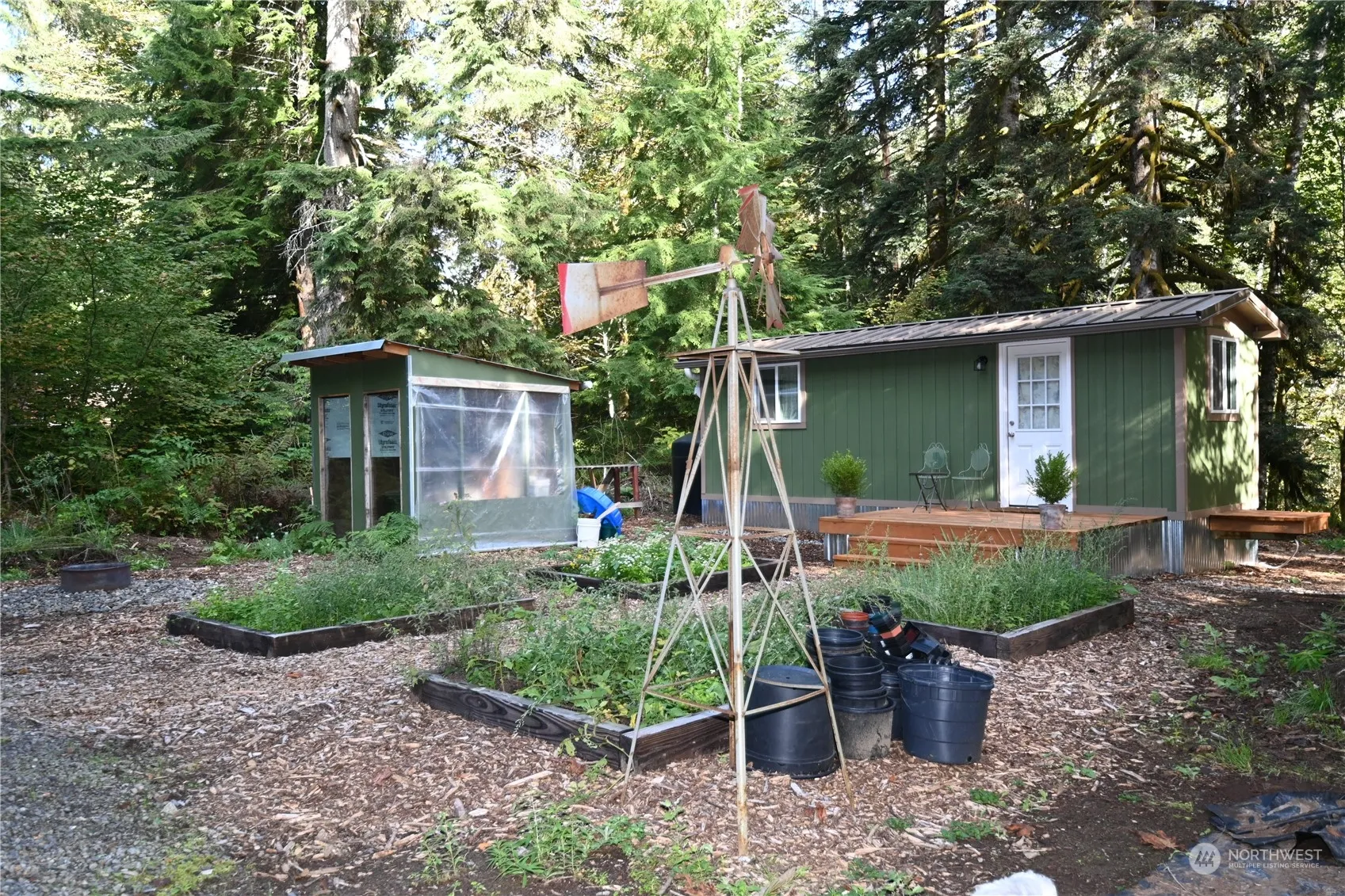 Seeking a place for this year’s ski season and home base for year-round recreation? This is your place. Come find out why tiny home living pays off big! This budget friendly tiny home offers an open deck, kitchen with all the essentials ~ stove, vintage washboard sink, on demand + fridge. You will love the very quiet, sunny & spacious lot with enchanting gardens and defined areas. Located at the END of a Mtn community for optimal privacy! Lovely green house, storage container, fire pit, wood storage and RV hookup. Separate wash house with eco-friendly toilet and sink. Sustainable water catchment w/tank, filter system and 200amp power. Corners are flagged. Enjoy the freedom of simpler living near NW’s premier recreation. Plenty of parking.
