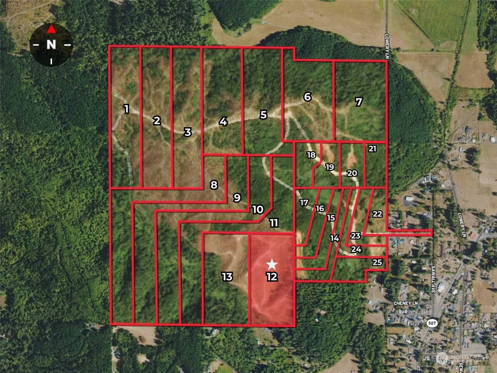 Lot 12 is a shy 20-acre parcel with no HOA or CC&RS. There’s a view of Mt. Rainier from the NE corner along with a forested territorial view everywhere else. Access options off Sawall Ave & Carson St — both gated. About 5 mins from I-5. Situated just north of Centralia & within Lewis County. Public utilities may be an option, but well & septic are more likely. This property along w/ 12 other 20+ acre parcels are available for purchase. Owner financing available & considered. Designated Forest Land w/ yearly property taxes that are only $22/year. Reach out if you are interested in this parcel or another one. Please contact broker before viewing due to the gates. Broker can also answer questions about DFL & seller financing options.