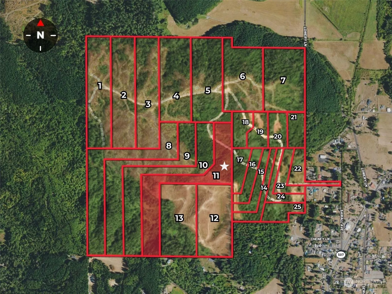 23.28 acre parcel with dignified view of Mt Rainier, countryside, & cityscape. Cash is preferred, but owner financing is an option. This listing is for Lot 11, but there are 12 other parcels available for purchase and each of those parcels are 20+ acres in size. Nice, secluded setting situated minutes from I-5 behind a locked gate. Located just south of the boundary between Thurston/Lewis Counties & north of Centralia’s city limits. Designated Forest Land with yearly property taxes that are only $22/year. If you are interested in this parcel or any of the others, it is encouraged that you contact broker to receive instructions for viewing, understand the options with DFL, and explore the seller financing details. No HOA either.