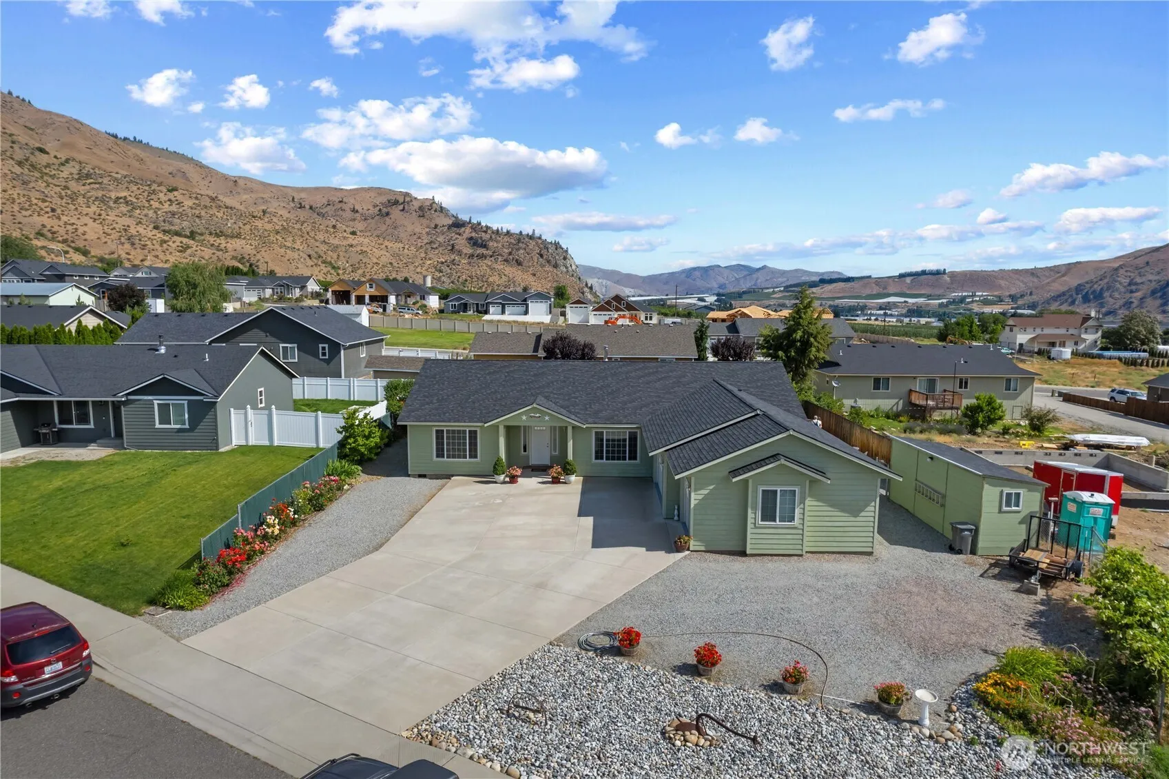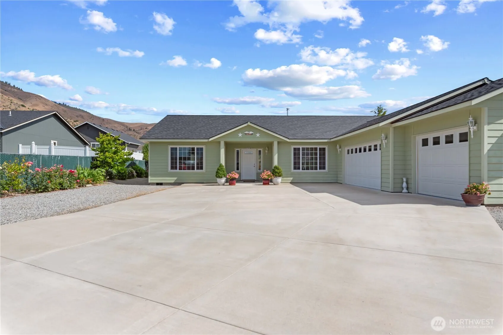 Beautiful Lexar Custom Rambler on large lot with southern exposure & mountain views! Level entry/zero steps, fully finished 3-car garage w/heat/air, garden window, storage spans above & space for 14 cars/RV parking in driveway, granite counters throughout, large eating bar, “Thelin Parlour” gold plated wood stove, Montana tight knot red fir floor, real wood not LVP, tiffany glass lighting, Italian ceramic tile, nice primary suite, walk-in closets in all beds, Cal spa hot tub w/swim spa concrete pad w/50 Amp GFI, Hardie Board Lap Siding, fenced back yard w/raised garden beds, 2 fully finished sheds w/power, 15 fruit trees, apples, plums, cherries, peaches, nectarines, serves as privacy barrier, irrigation water, quality inside & out!