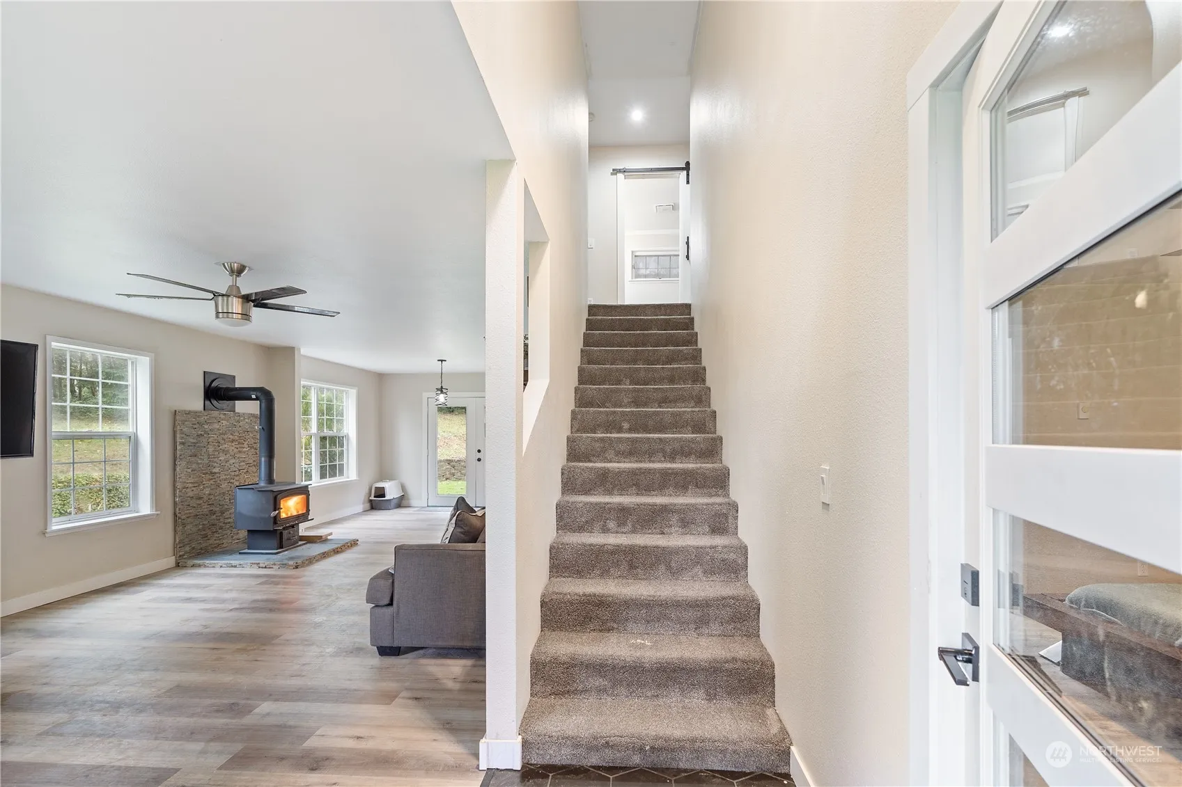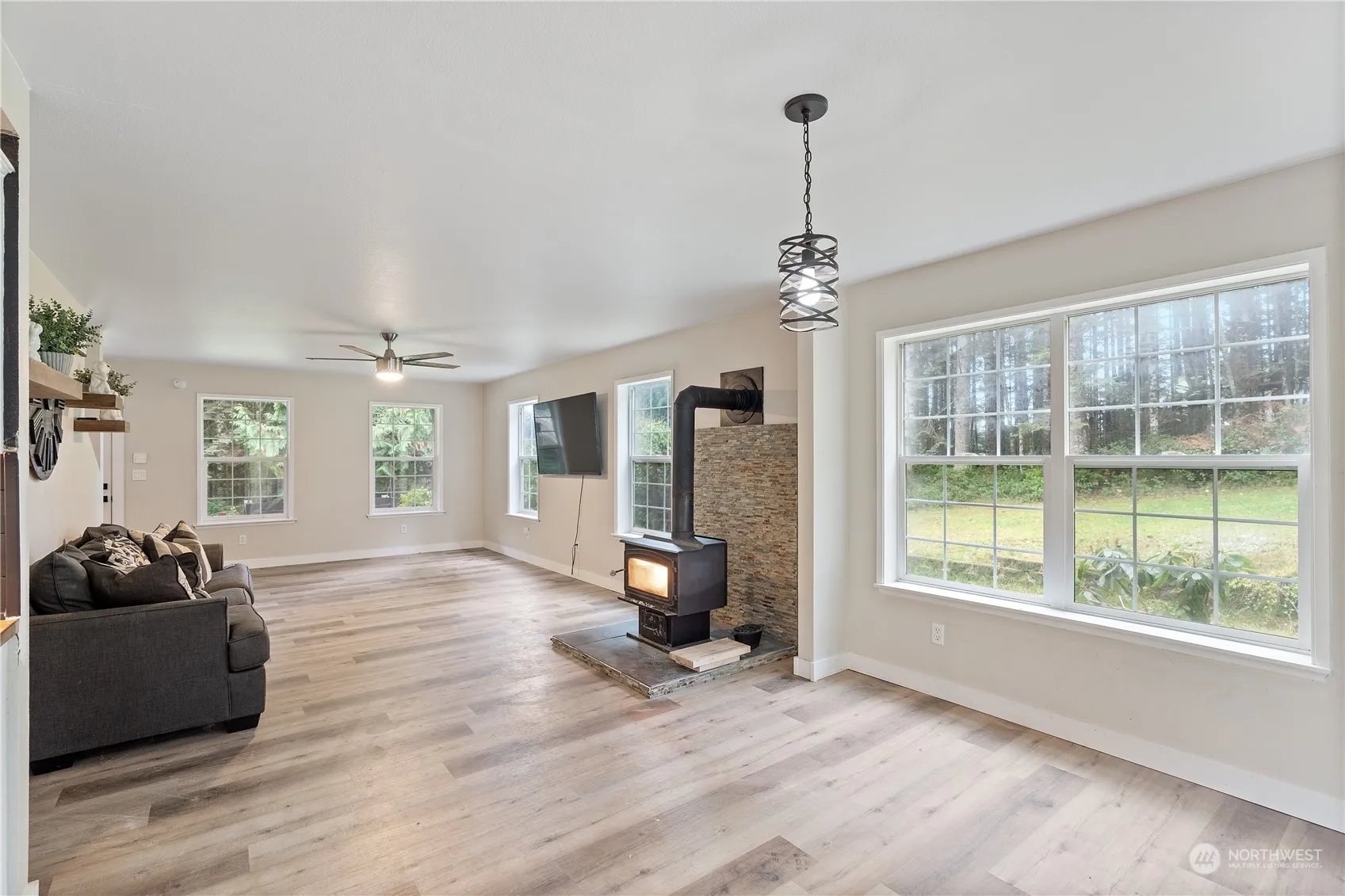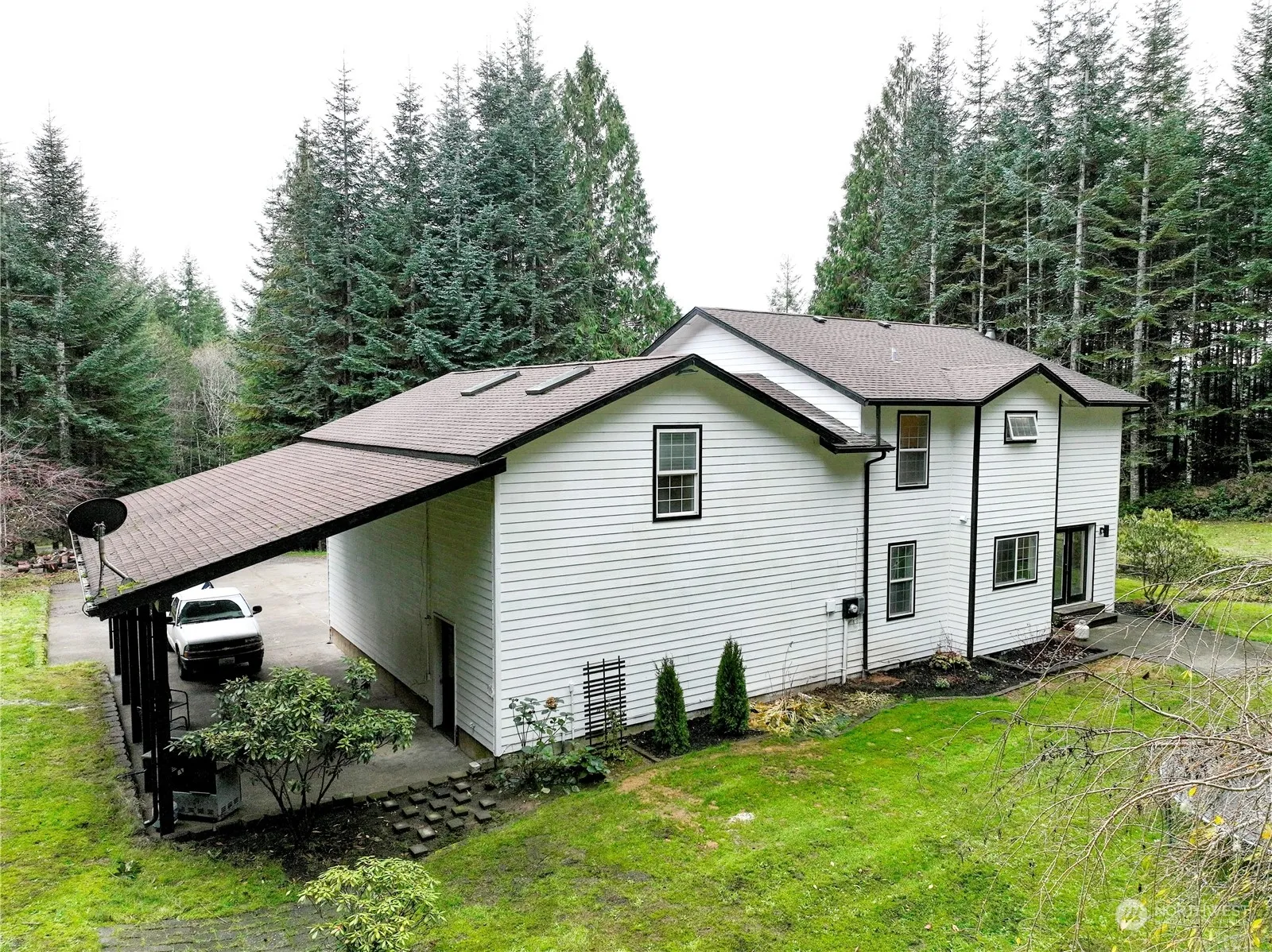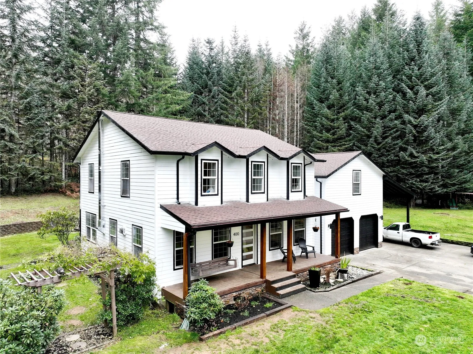 Picturesque 5 acres with beautifully updated 2948 sq ft home! Location is everything, desirable area on a private dead end road just outside of Elma. Enjoy territorial views off the gorgeous covered front porch, entertain off back patio surrounded by trees, soak in the quiet of nature surrounding you. Home has 4 bedrooms, primary with ensuite on main floor, 3 beds/bonus room/full bath upstairs. Spacious living room with wood stove, dining area, and beautiful country kitchen with plenty of cabinet space. Wander through the kitchen to half bath and garage, follow upstairs to your own personal movie theatre room and office space. 2 car garage plus carport. Updates inc. roof (5 years old), exterior paint, floors, bathrooms, kitchen, and more.