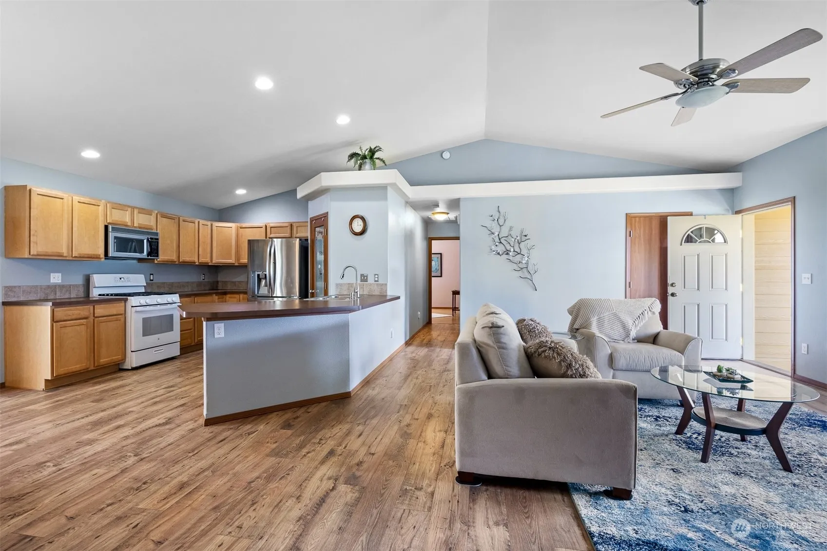 Immaculate 3Bd/1.75Ba one level home on large quarter ac + lot with private fully fenced back yard & garden/storage shed. Attached 2 car garage with additional side parking. All rooms good size. Easy floor plan with vaulted ceilings where living room flows into the dining area & kitchen. Fireplace. Sliding door access to large covered back deck. Kitchen with natural gas cooking, plenty of cabinets, breakfast counter, counter space & pantry. All appliances stay. Split bedroom layout with primary bedroom & extra large bath & walk-in closet on one end of home & 2 additional bedrooms & 2nd bath on the other. Laminate floors throughout. Laundry room w/sink. Minutes to all conveniences, JBLM & Olympia.